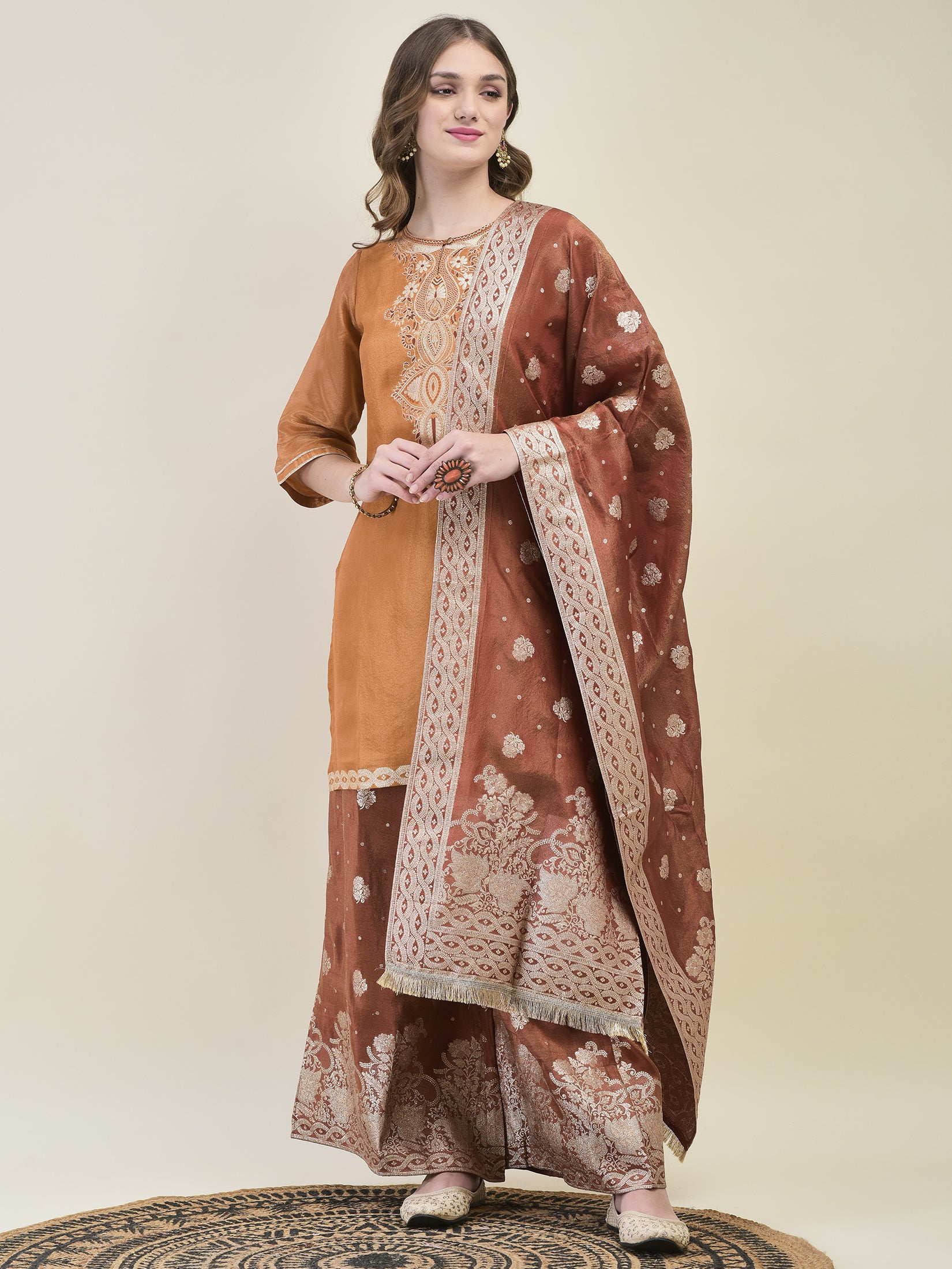Women Dola Jacquard Rust Woven Kurta Wide Leg Pant Dupatta Sale priceRs. 3,999.00 Regular priceRs. 7,999.00