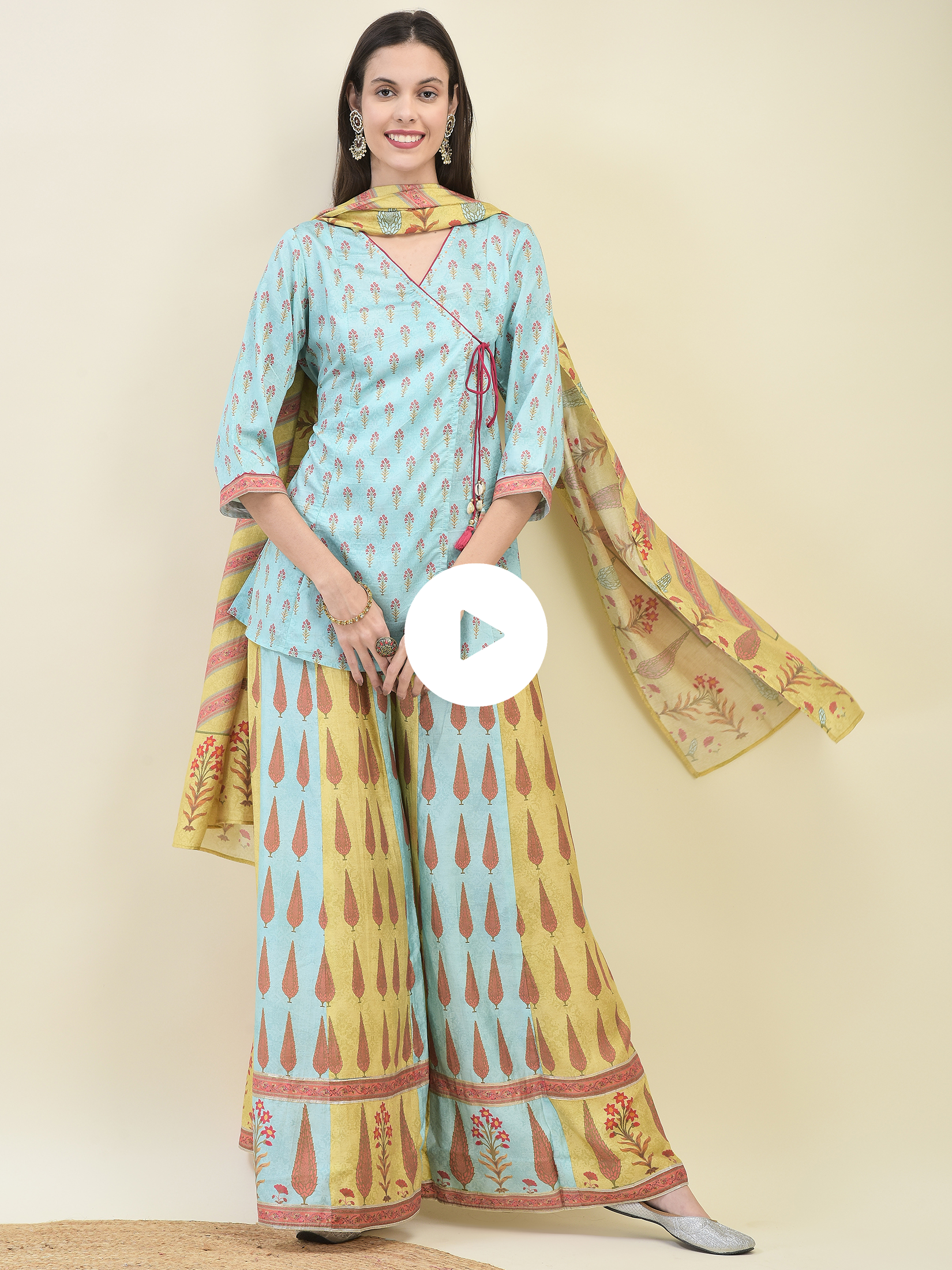 Women Chanderi Blue Ornamental Print Top Split Pant Dupatta