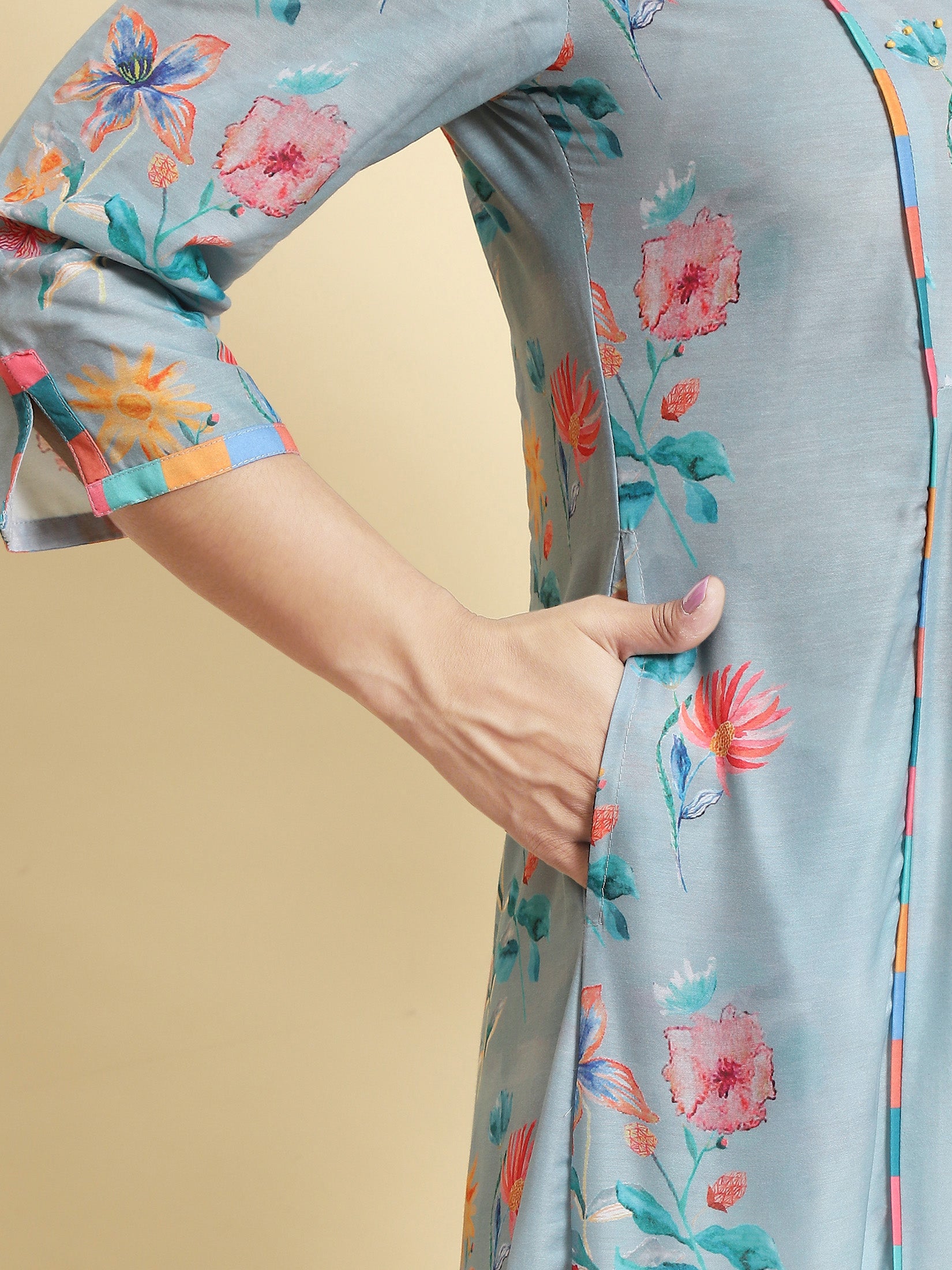 Introducing our exquisite sea green floral printed kurta trouser dupatta" from the stunning Vasant Bahar collection! This ensemble is designed to perfectionfeaturing a sea green muslin kurta with three-quarter sleeves and a charming mandarin collar neckline. The fit and flare hemline adds a touch of elegance to the outfit. The comfort pants are crafted from Liva fabric (rayon)ensuring utmost comfort and a flattering fit. And let's not forget the chiffon dupatta with its breathtaking floral printadding a graceful allure to the entire ensemble. Versatile and stylishthis outfit is a must-have for both family time and work wear. It strikes the perfect balance between comfort and sophistication. Experience the beauty of this outfit and embrace the essence of the Vasant Bahar collection. Elevate your wardrobe with this enchanting ensemble today!