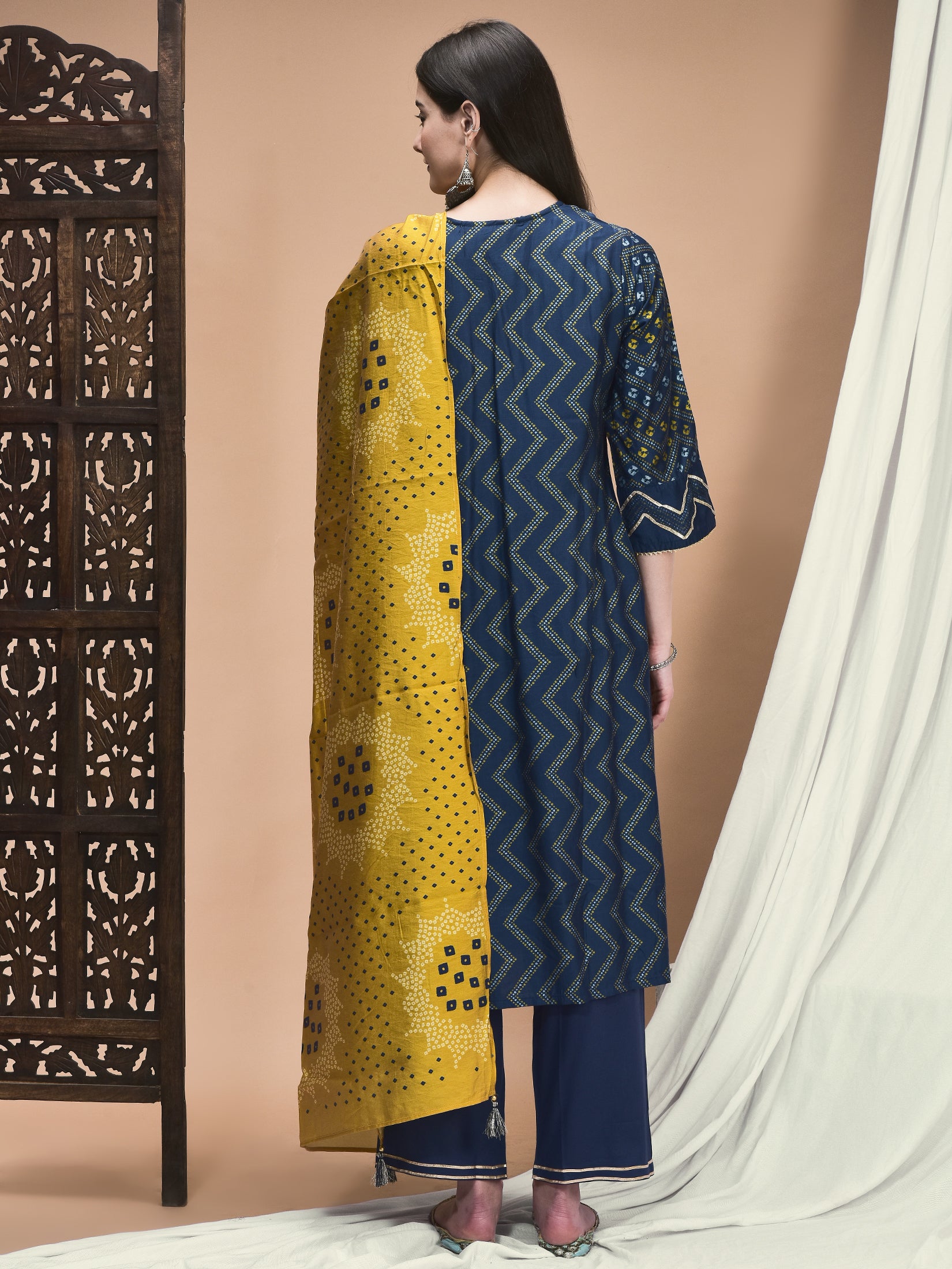 Women Cotton Navy Blue Embroidered Kurta Comfort Pant Dupatta