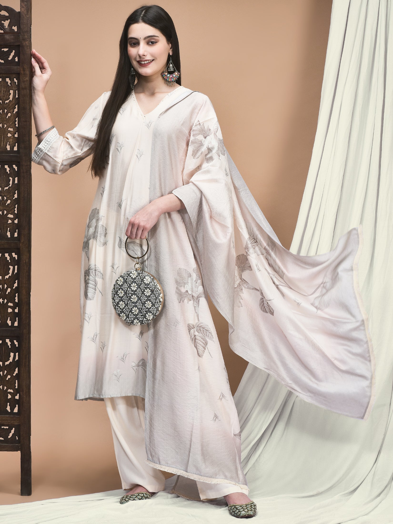 Women Poly Viscose Off White Embroidered Kurta Comfort Pant Dupatta