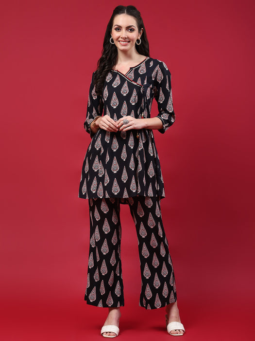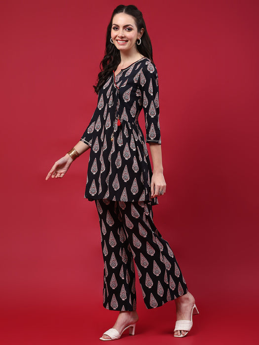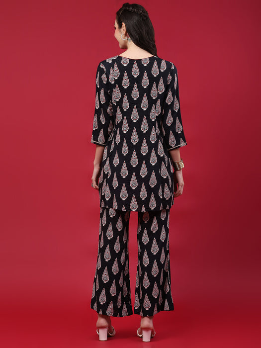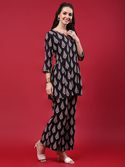Indulge in the captivating allure of our Black Stripe Print Co-Ord Set from the exclusive Ratna collection. This ensemble is a perfect fusion of style and tradition, designed to make a statement at festive occasions. Adorned with a chic stripe print, each line adds a touch of sophistication and modernity. Crafted from Liva fabric (rayon), this co-ord set offers a luxurious feel against your skin, ensuring comfort with every step. The 3/4 sized sleeves bring a hint of modesty, while the mandarin collar neckline imparts an elegant charm. The fit and flare silhouette enhance your feminine grace, creating a look that is both flattering and comfortable. Celebrate in style with the Black Stripe Print Co-Ord Set, a masterpiece from the Ratna collection. Whether it's a cultural event or a festive gathering, let this ensemble be your go-to choice for an effortlessly chic and elegant look. Revel in the richness of design and fabric, making every moment a memorable one.
