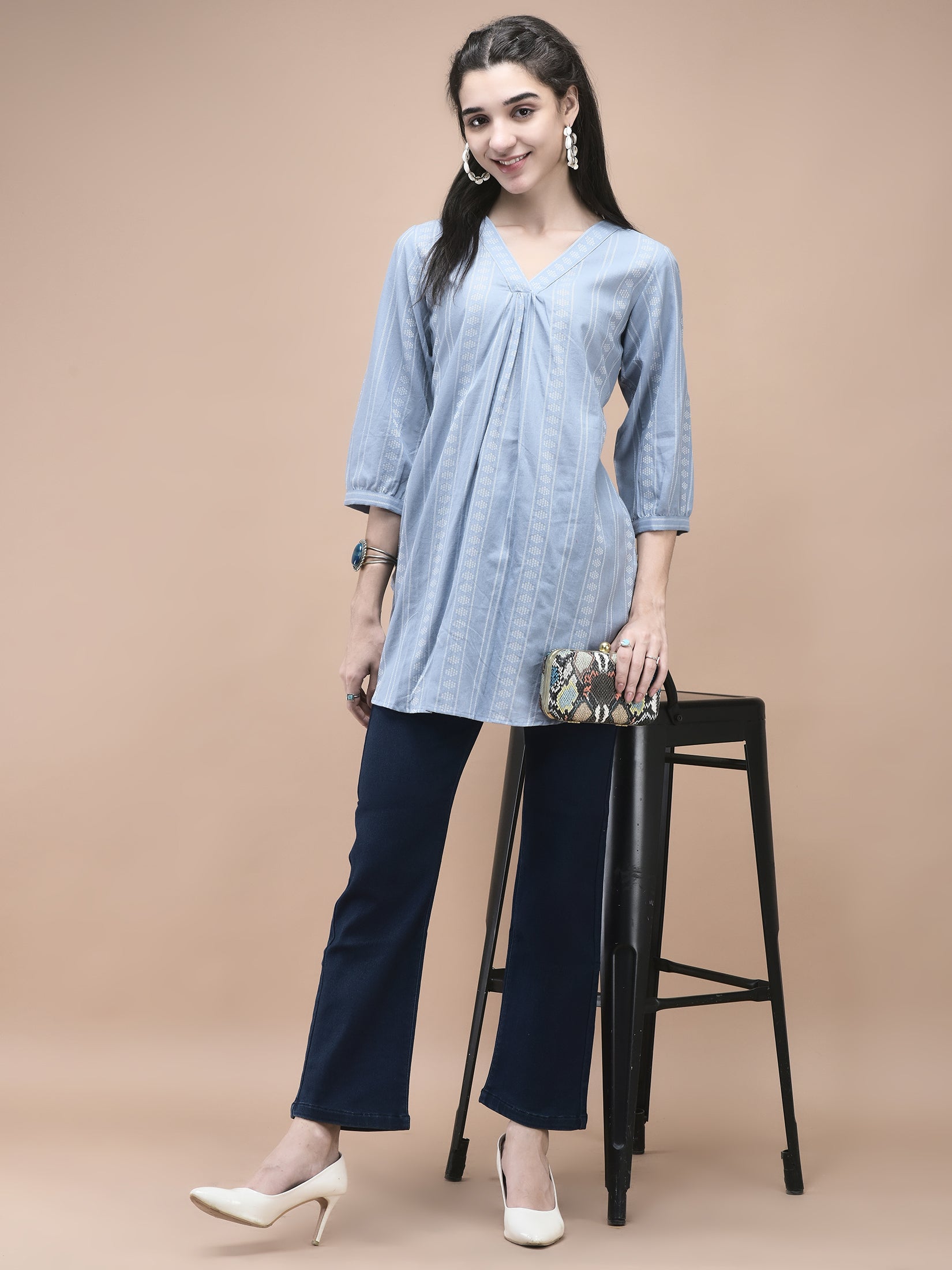 Made for everyday ease, this blue yarn dyed tunic brings together comfort and simple style. The soft cotton fabric feels light and breathable, making it a great pick for long hours. It features a flattering A-line cut with a neat V-neck and 3/4 sleeves that give it a laid-back yet polished look.