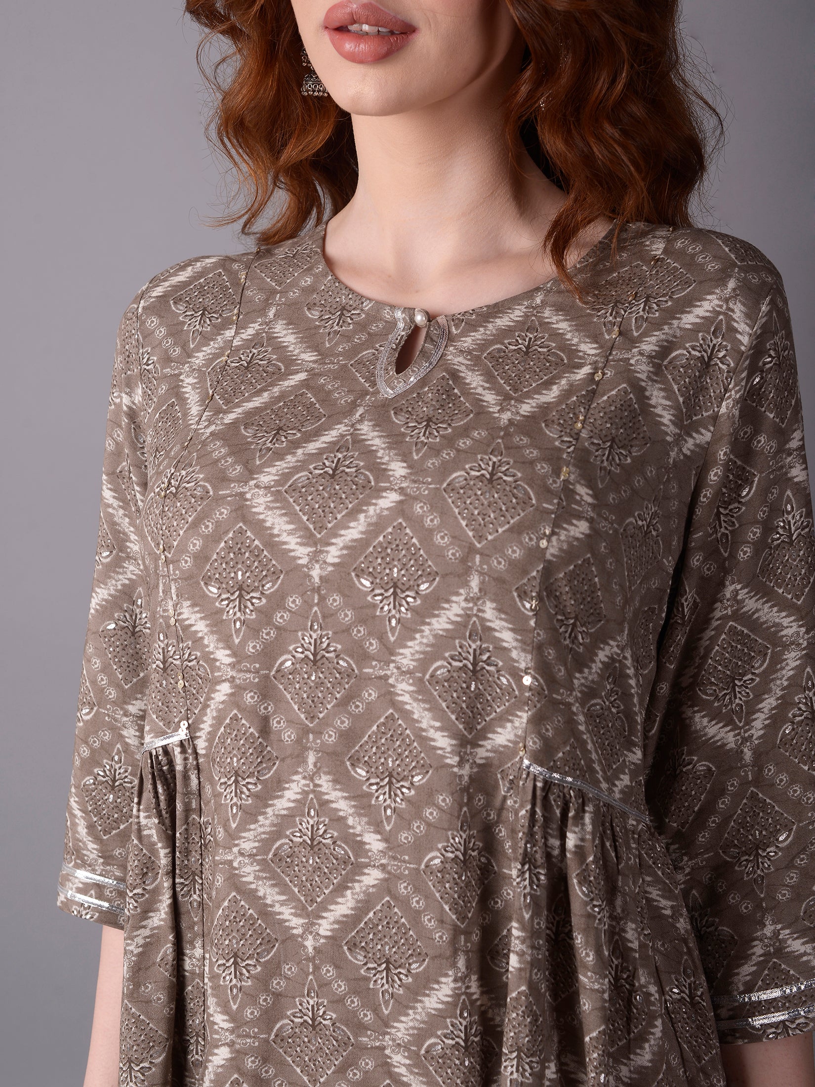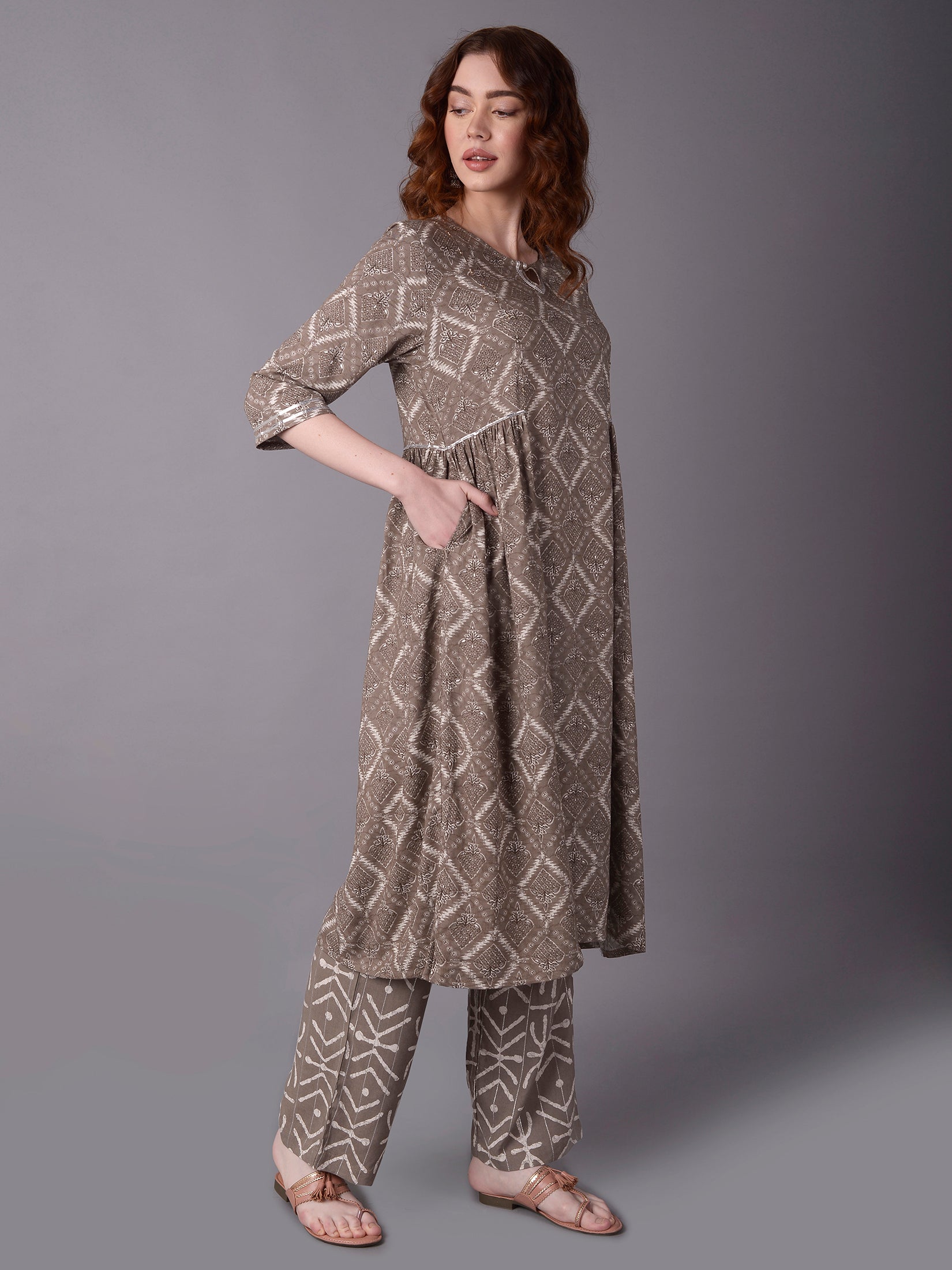 If you are a lady who loves to wear outfits that are differently-coloredthen were sure that you would adore this grey floral printed kurta with comfort pantsavailable at SHREE at the most affordable prices. The grey kurta comes packed with awesome featuressome of which are a round necklinea fit and flare silhouetteand three-quarter sleeves. Floral print adorns the grey kurtamaking it look absolutely stunning. To add more functionality to the garmentthe grey kurta has been adorned with a side pocket. It comes paired with comfort pantswhich are made of Liva fabric same as the kurta. Both the kurta and the comfort pants are adorned with floral print. Go for this Festive Wear outfit from SHREE today!