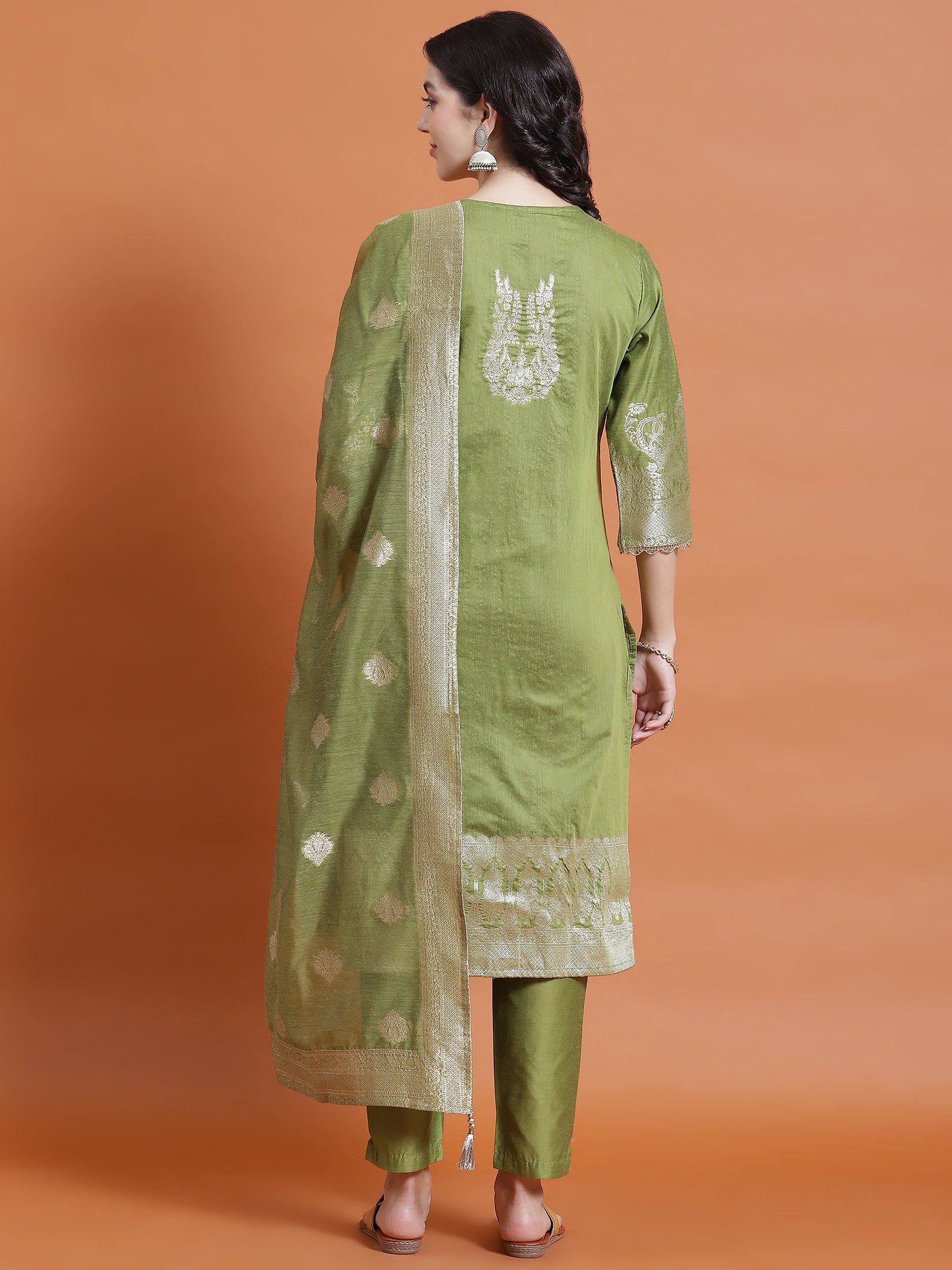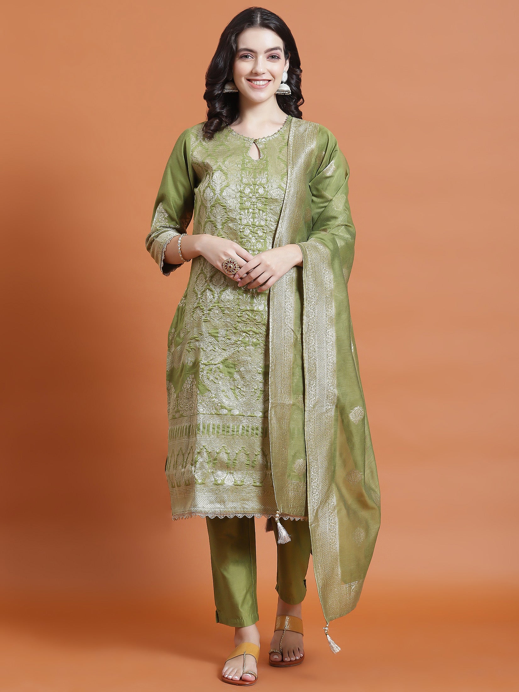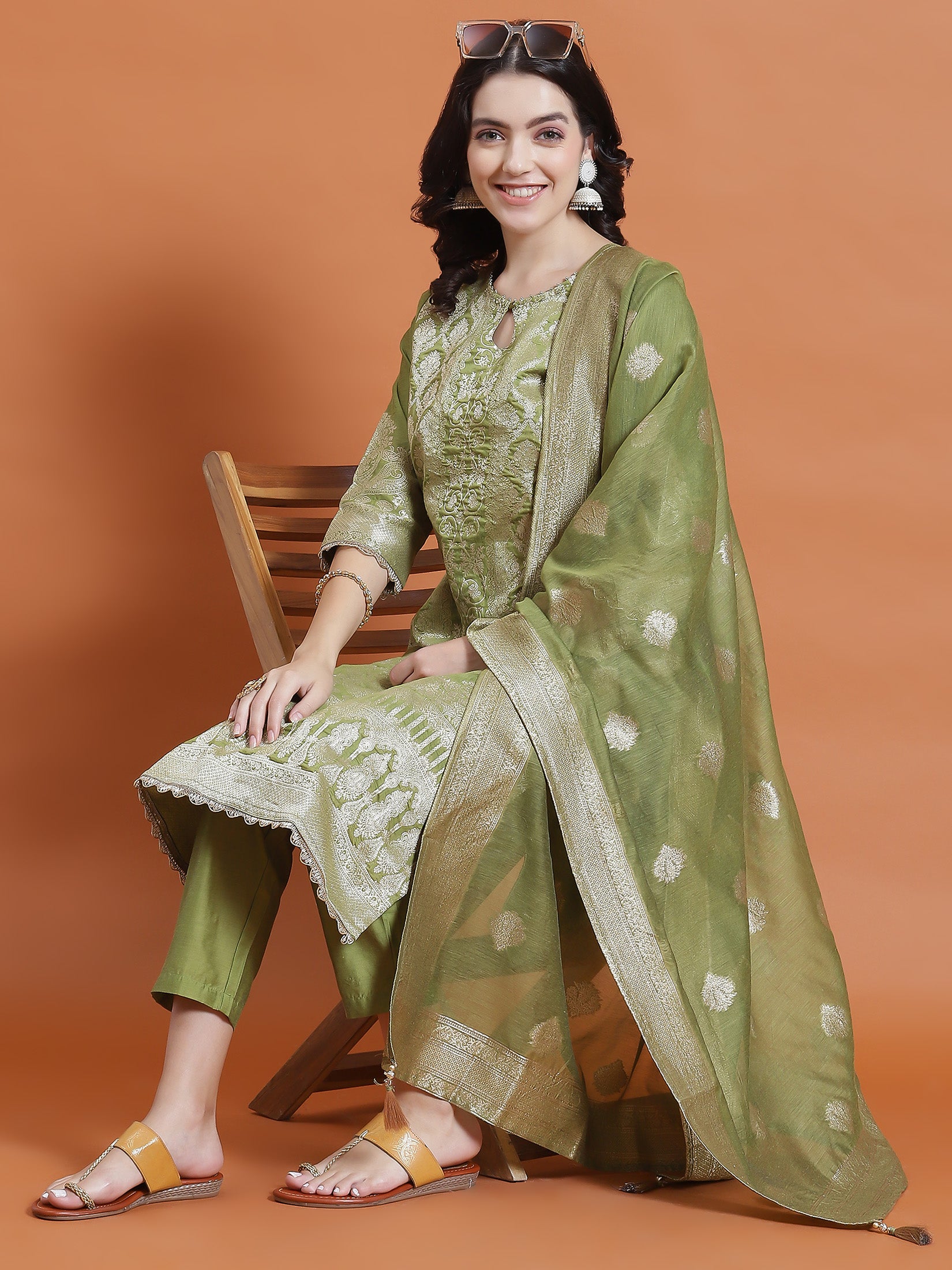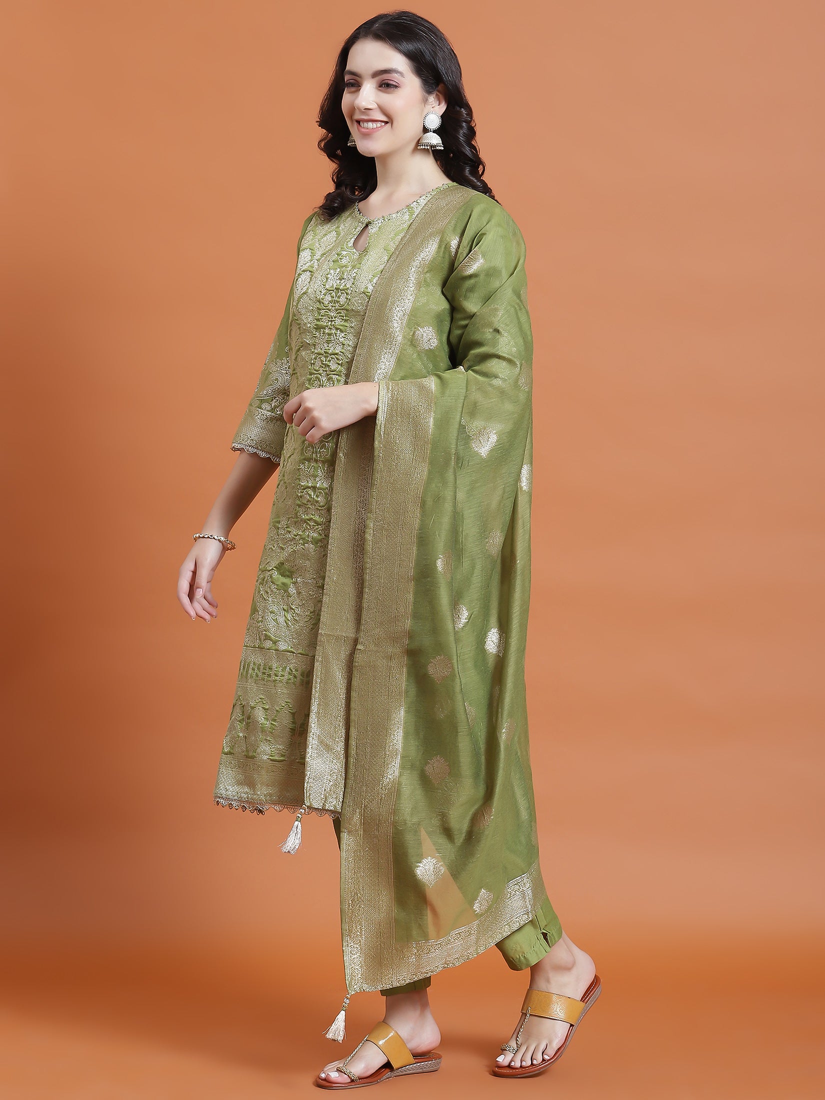 Women Chanderi Olive Embroidered Kurta Trouser Dupatta