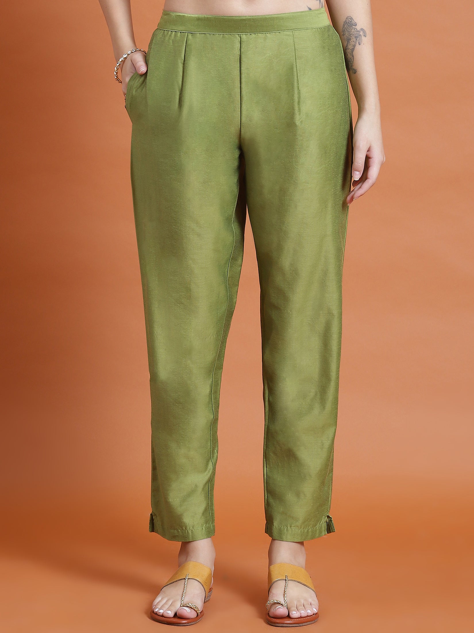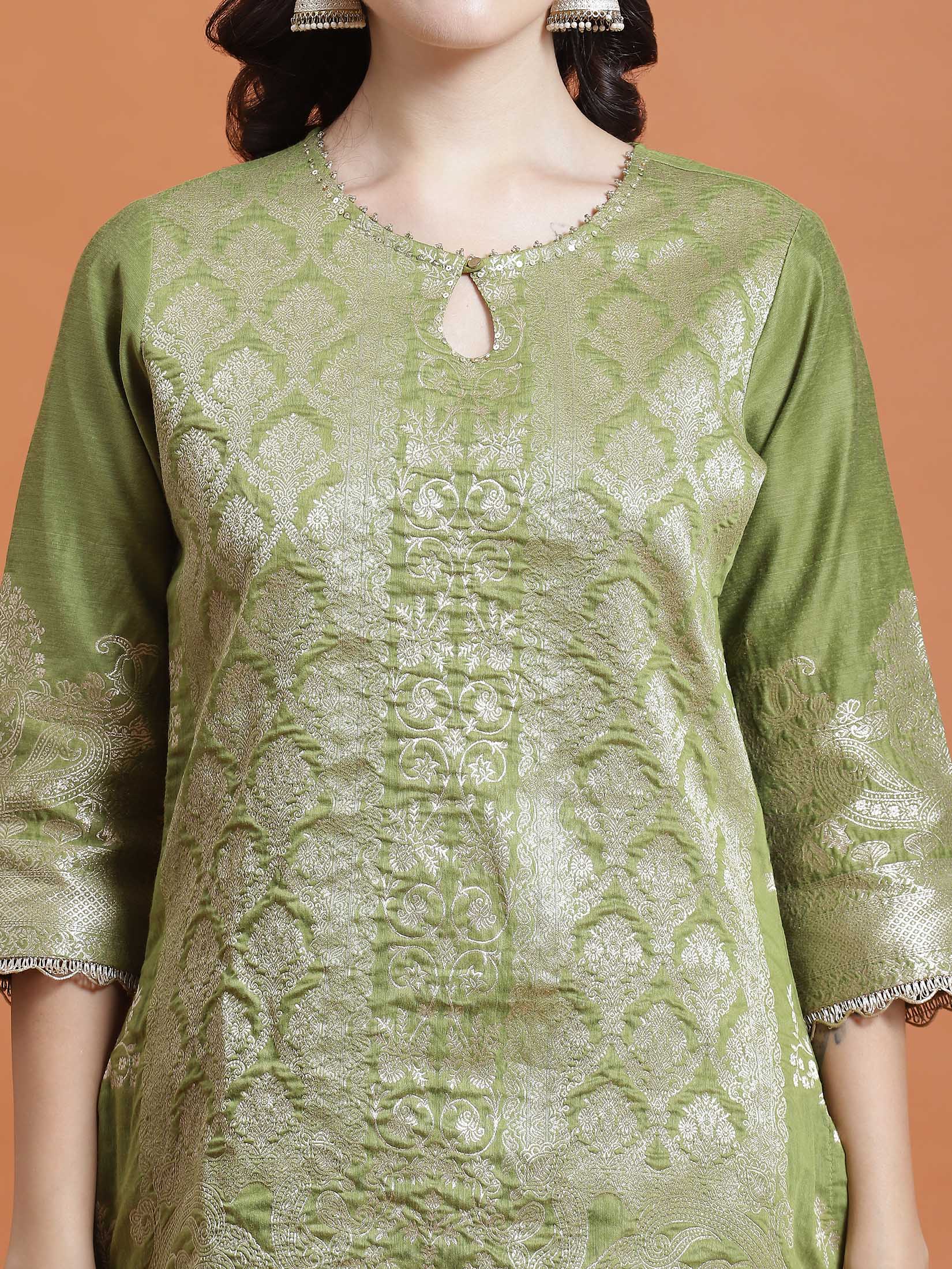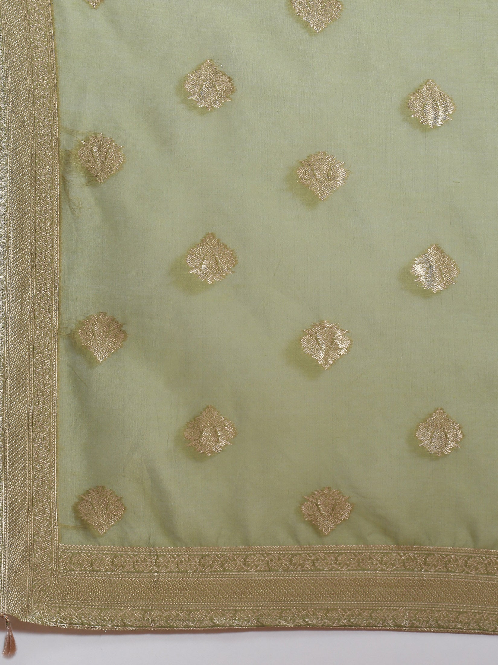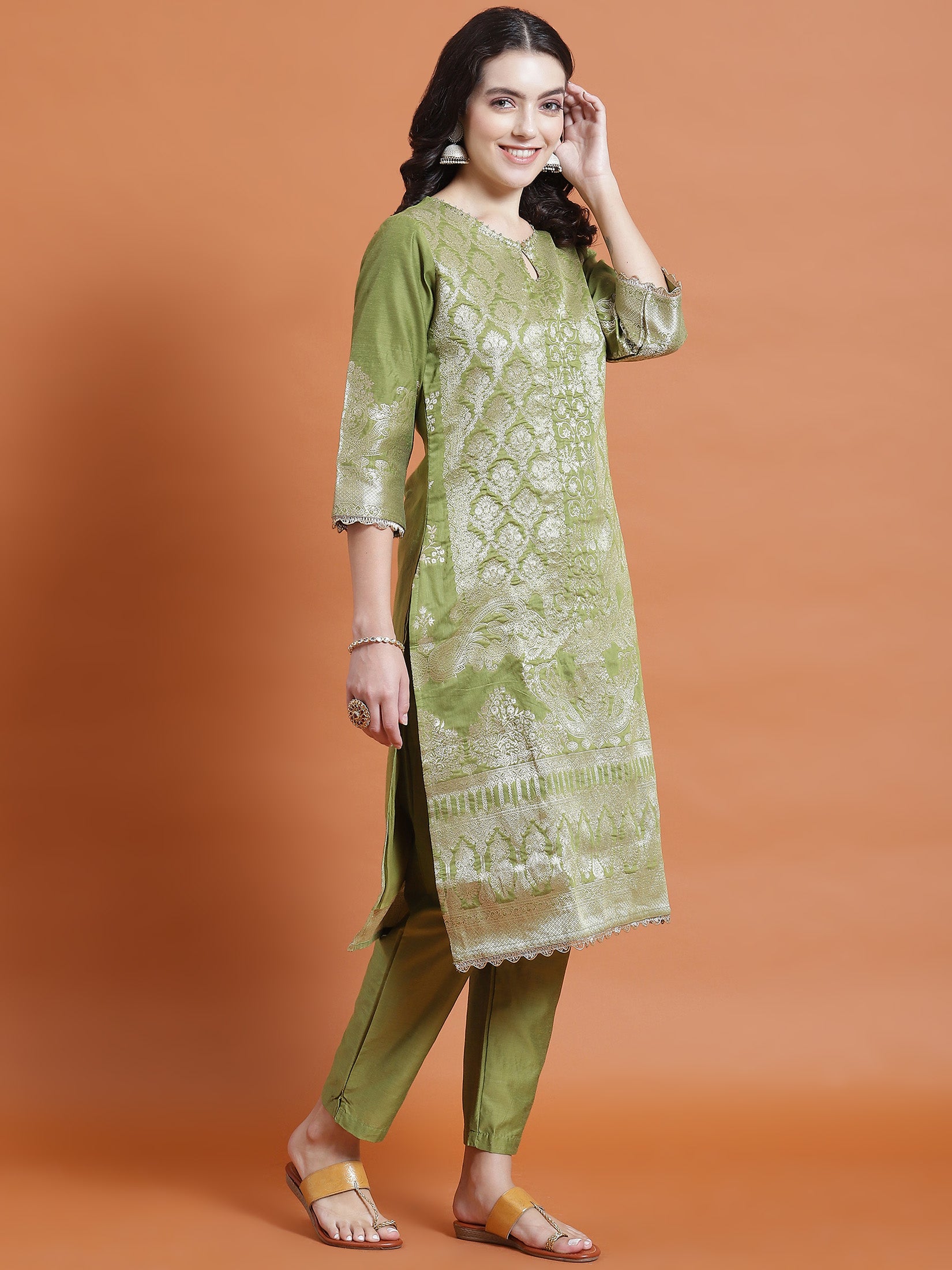 Women Chanderi Olive Embroidered Kurta Trouser Dupatta
