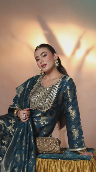 Women Silk Jacquard Blue Woven Kurta Split Pant Dupatta Sale priceRs. 3,999.00 Regular priceRs. 7,999.00