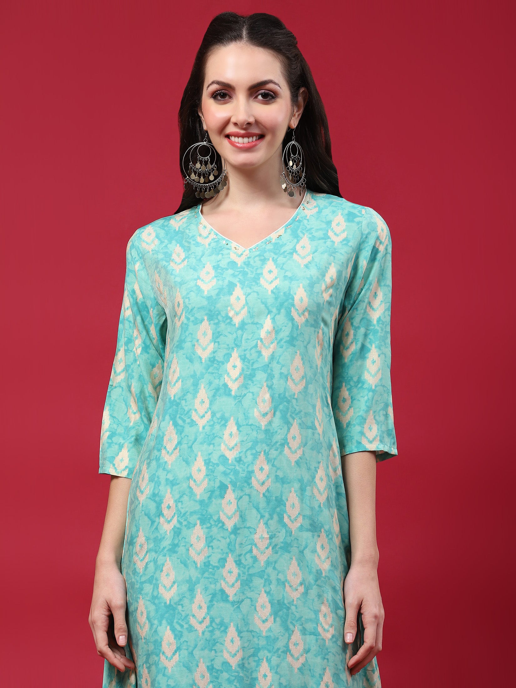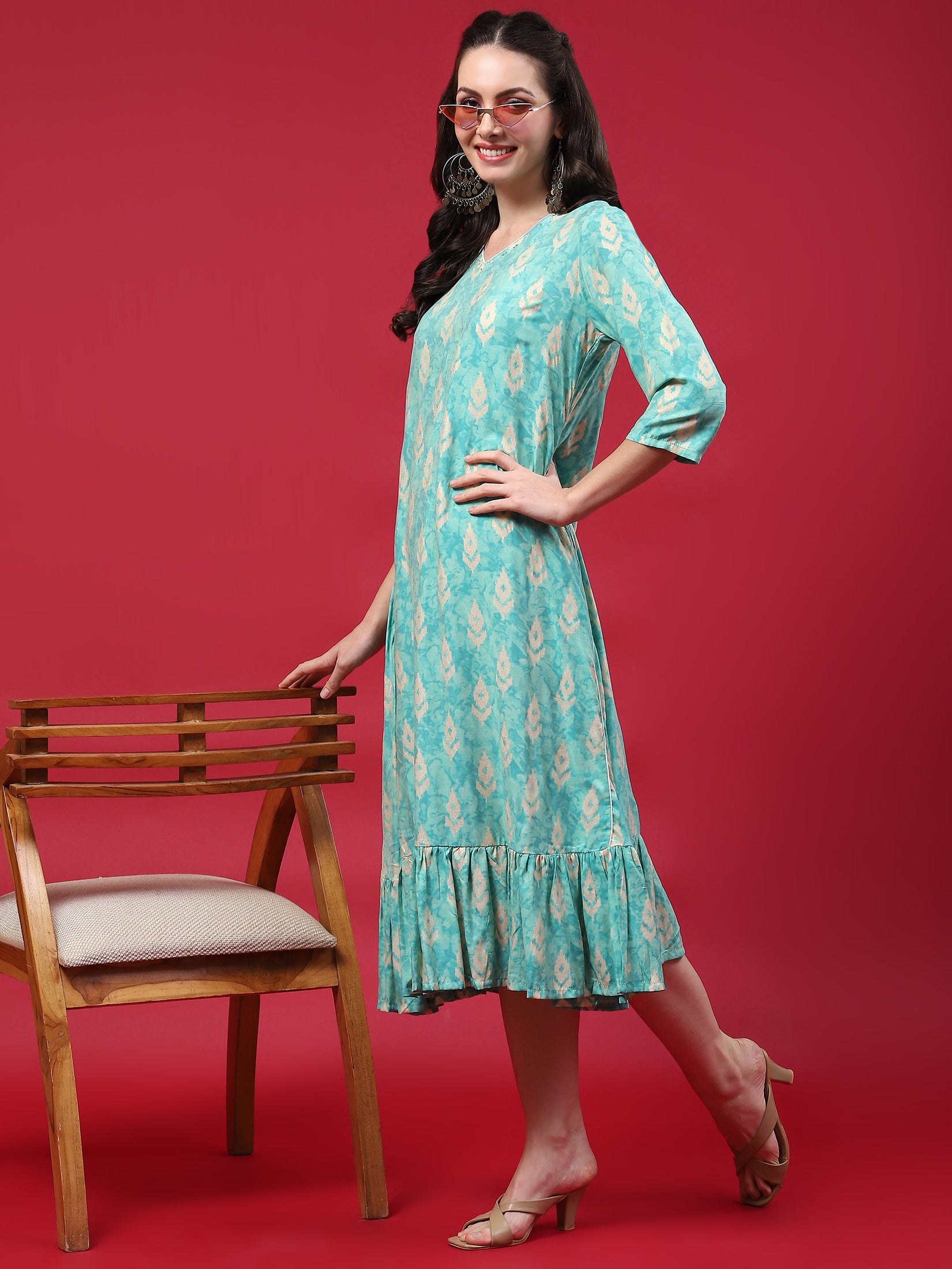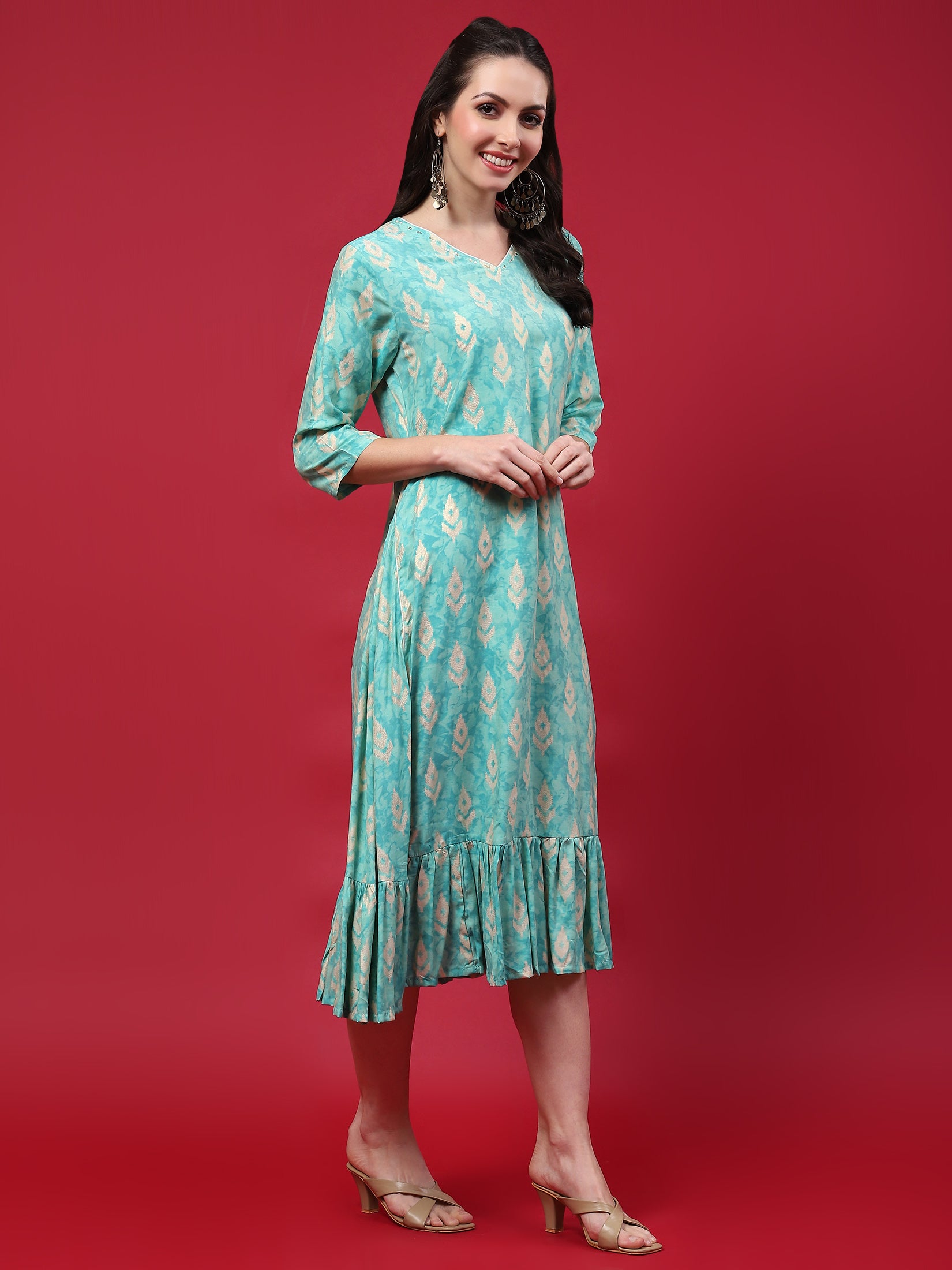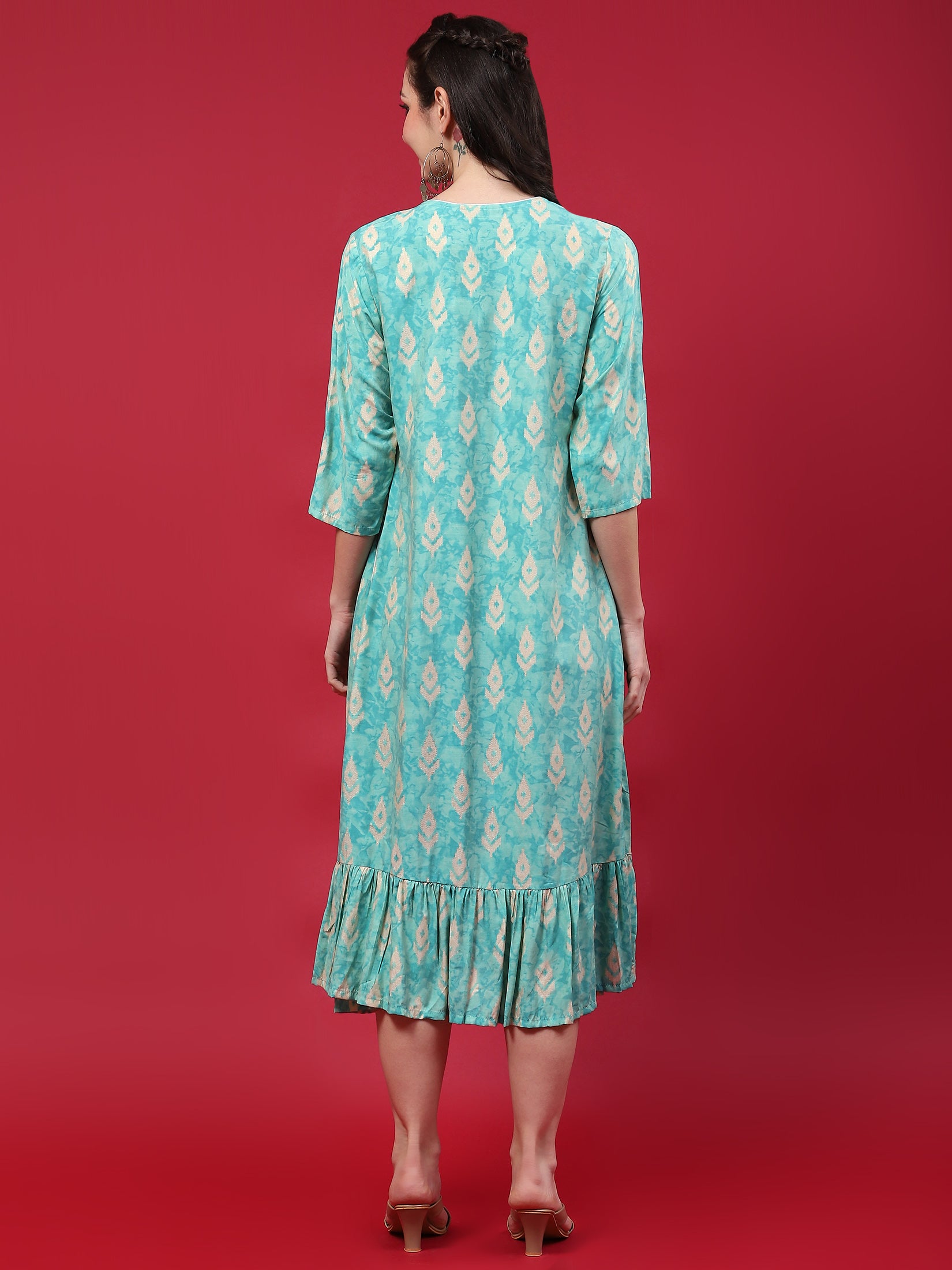 This exquisite dress showcases a perfect blend of tradition and modernity, catering to your impeccable style. Crafted from premium muslin fabric, the Teal Ikat Printed Dress offers unparalleled comfort and durability. The three-quarter sleeves add a touch of sophistication, while the graceful V neckline enhances your neckline. The fit and flare hemline creates a flattering silhouette, making you stand out at any occasion. Adorned with a captivating ikat print, this dress celebrates the rich heritage of Indian textiles. The intricate patterns and vibrant teal hues add a unique charm, allowing you to make a bold fashion statement. Whether it's a cultural event, festive celebration, or casual outing, this ethnic ensemble is your go-to choice. Embrace the allure of tradition with a modern twist. Elevate your wardrobe with the Teal Ikat Printed Dress by SHREE and make every moment memorable.