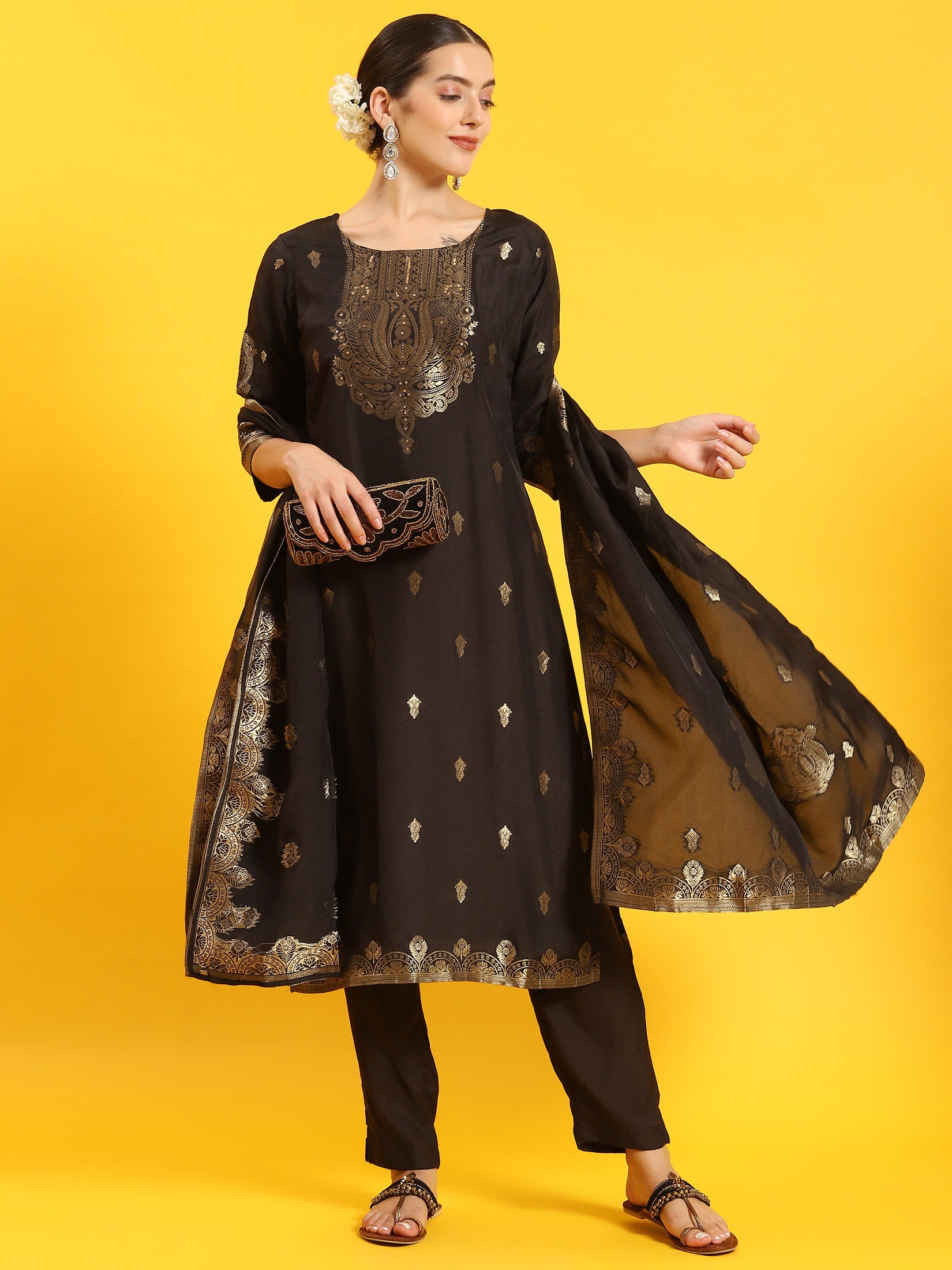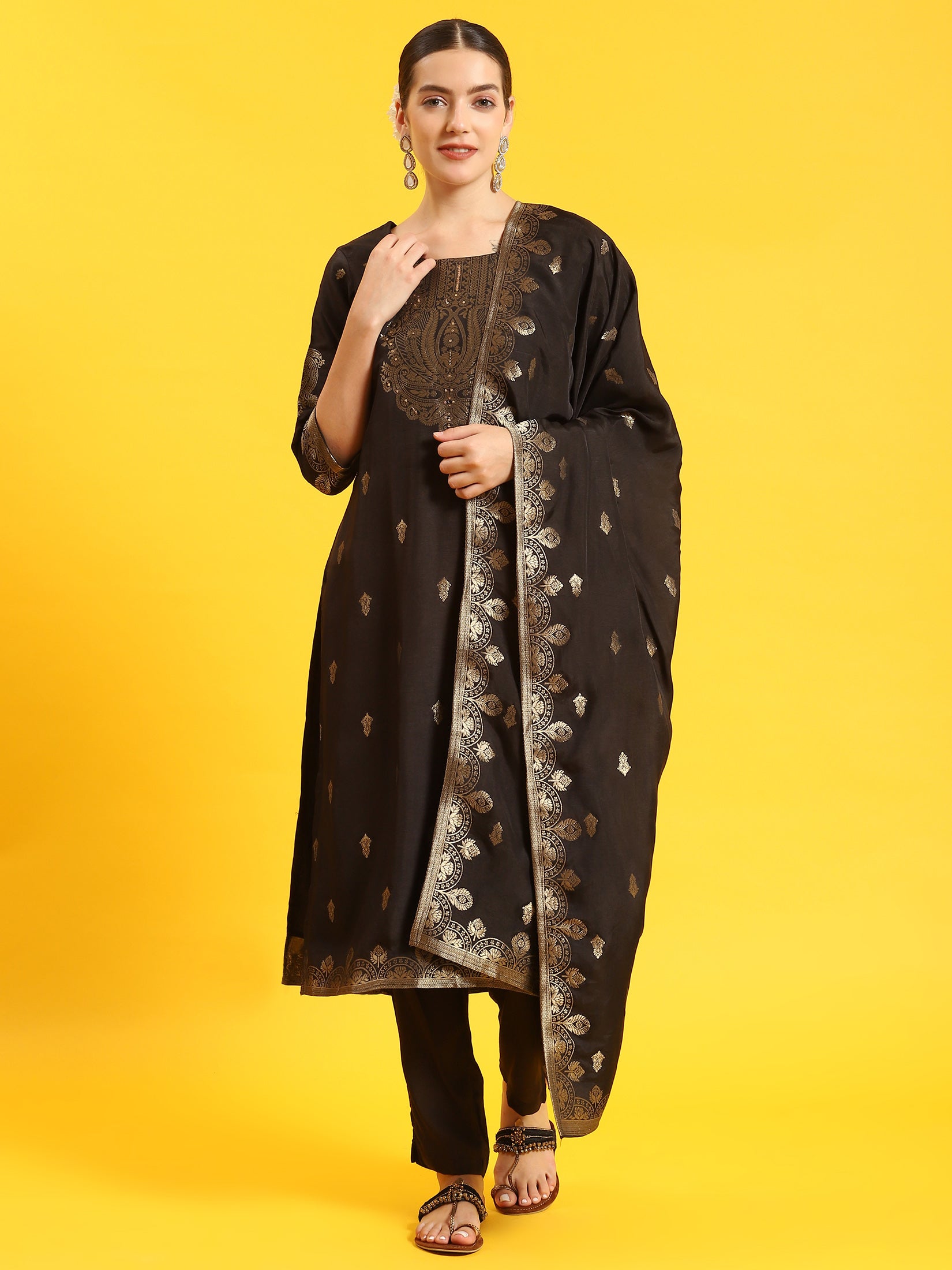 Re-do your style this festive season with this authentic black printed kurta trouser dupatta set from SHREE?s Autumn-Winter?23 collection, under the Umang theme. This ethnic set is designed for the modern woman who appreciates both elegance and comfort. The kurta and dupatta are crafted from luxurious silk fabric, exuding grace and finesse. With 3/4 sized sleeves and a round neckline, the kurta offers a timeless charm. Its straight-fit silhouette flatters any body type, making it suitable for both everyday wear and work attire. The accompanying trousers are made from breathable muslin fabric, ensuring a comfortable fit throughout the day. The distinctive jacquard print adds an artistic touch, making this outfit a symbol of sophistication and style. Embrace the essence of Umang with this ensemble and make a statement wherever you go.