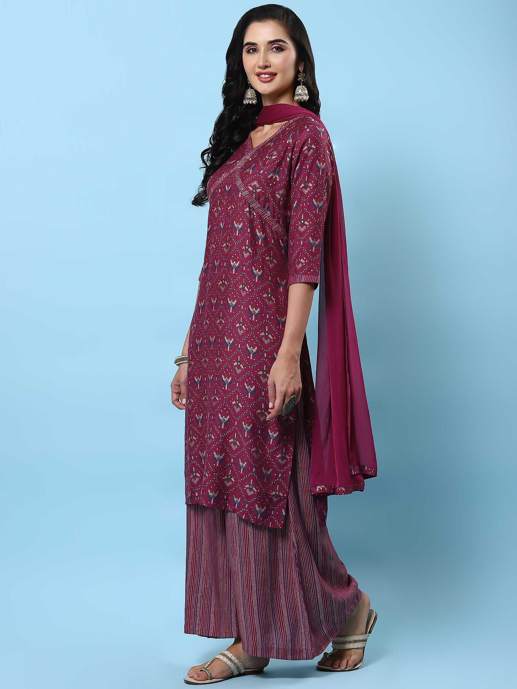 Women Burgundy Abstract Printed Kurta Wide Pant Dupatta