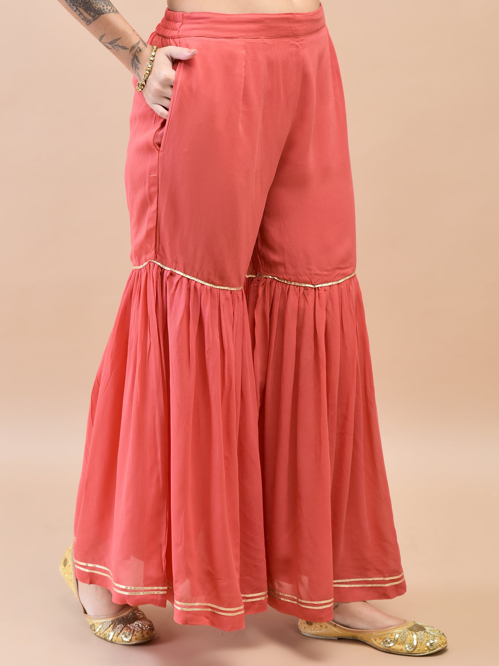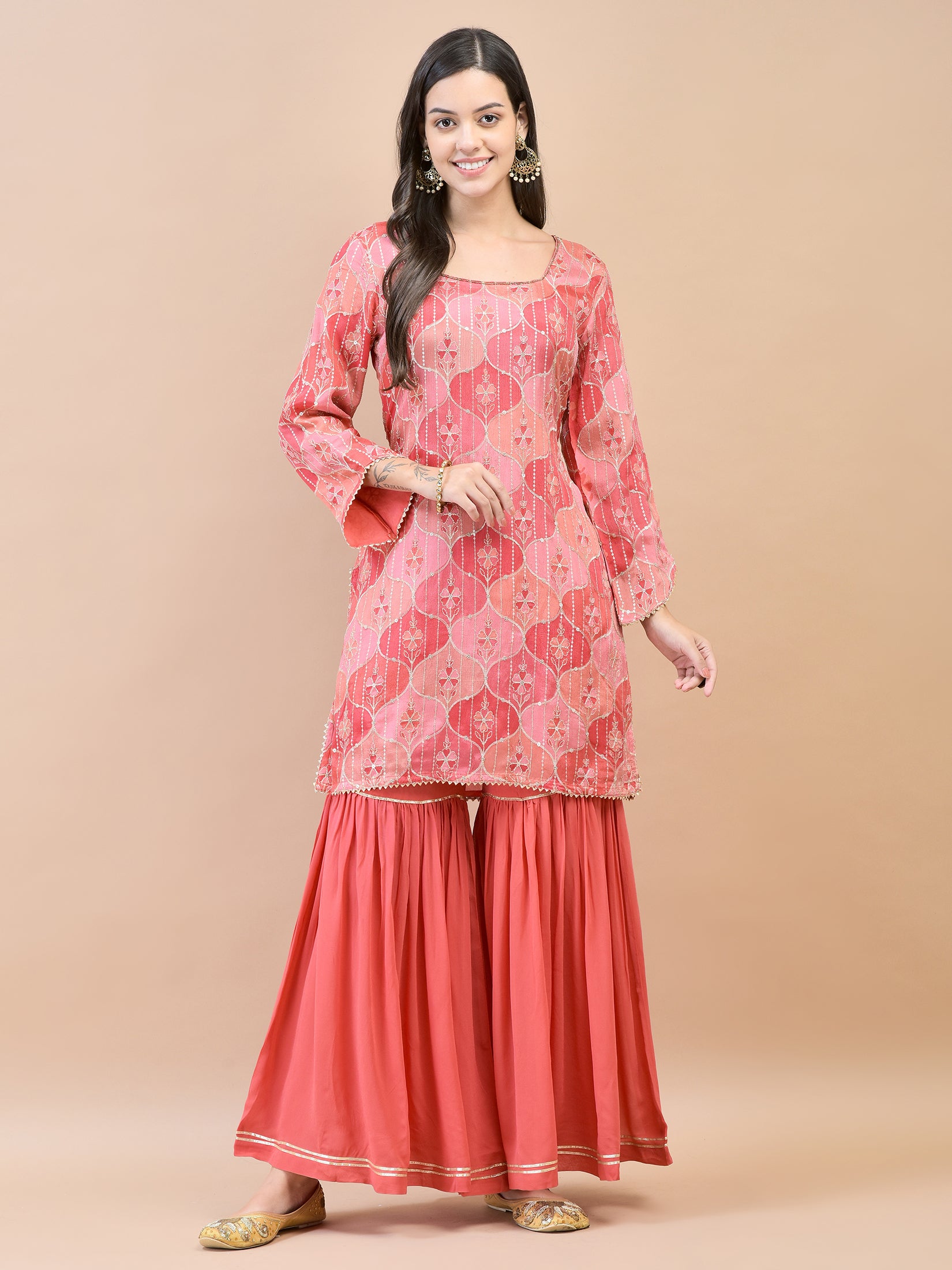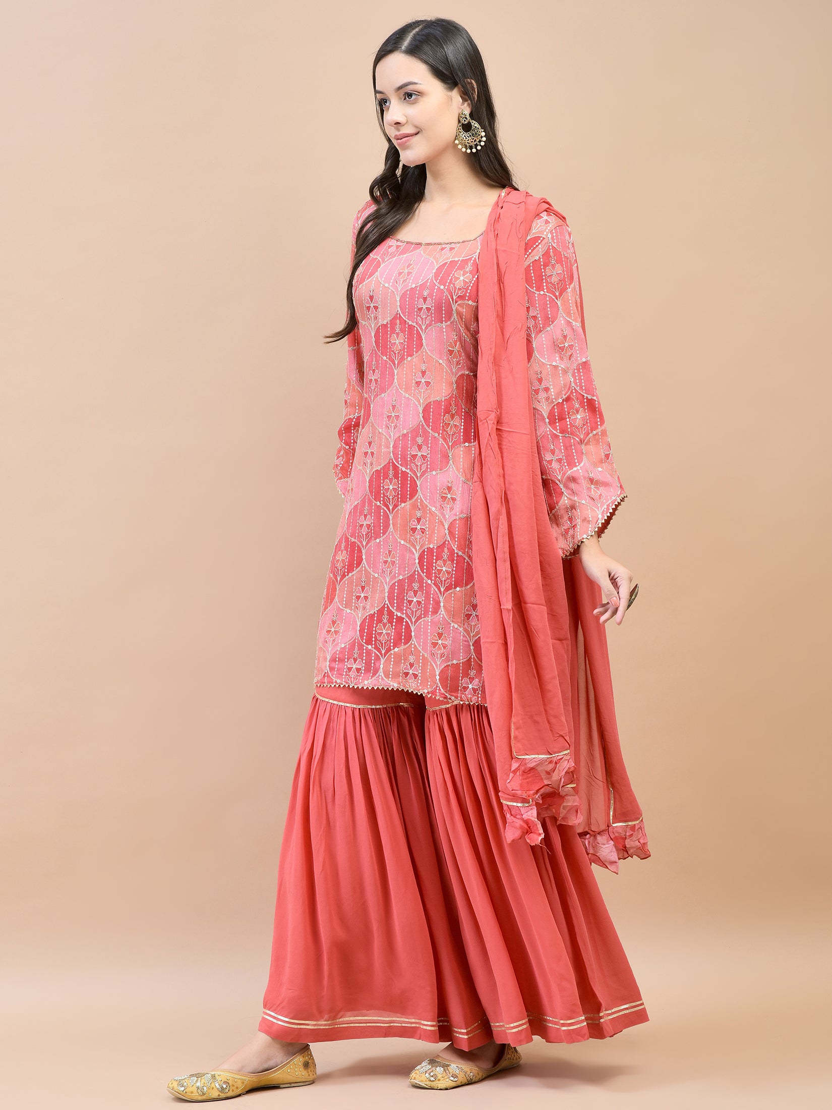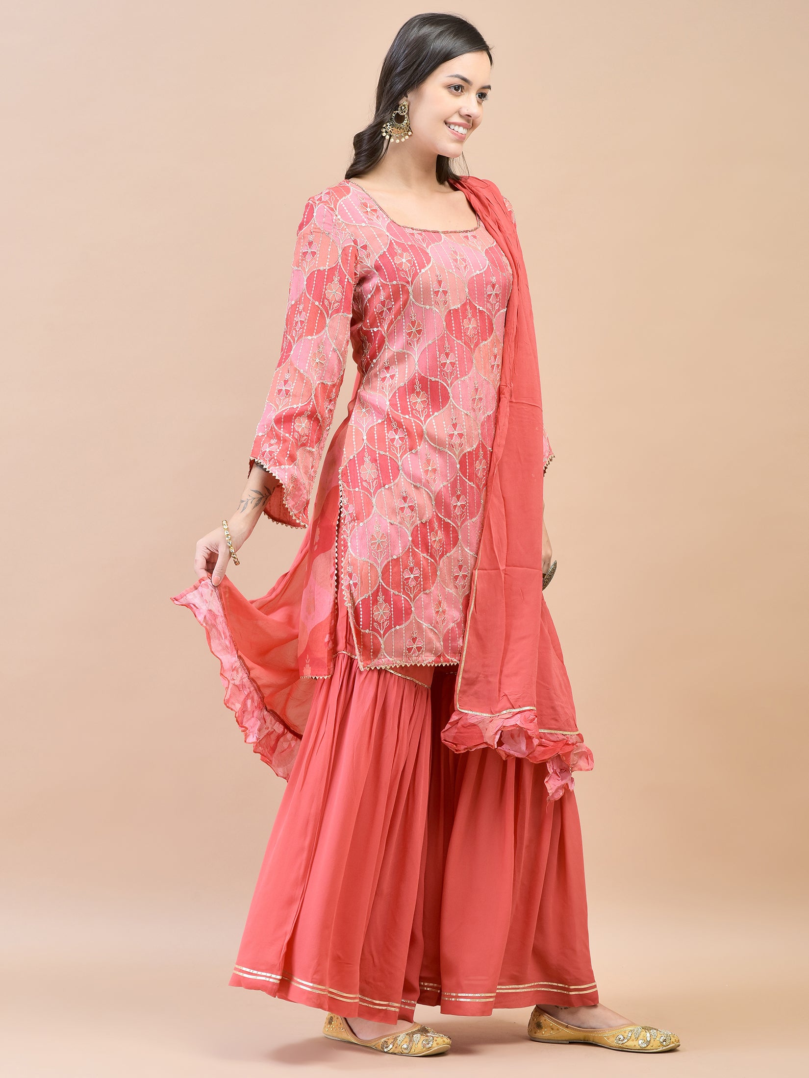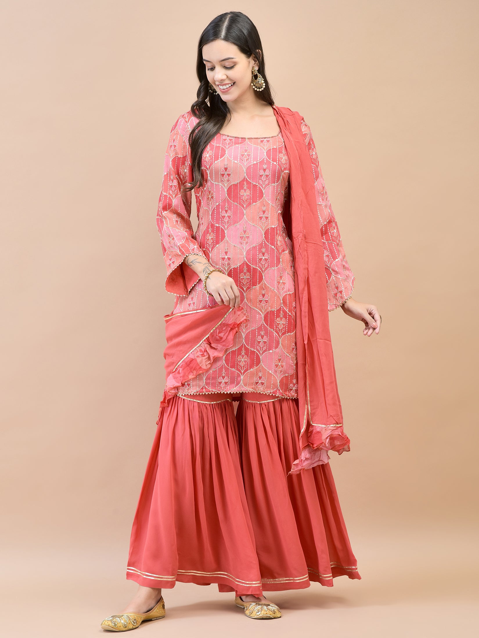 Women Chinon Red Floral Print Kurta Sharara Dupatta