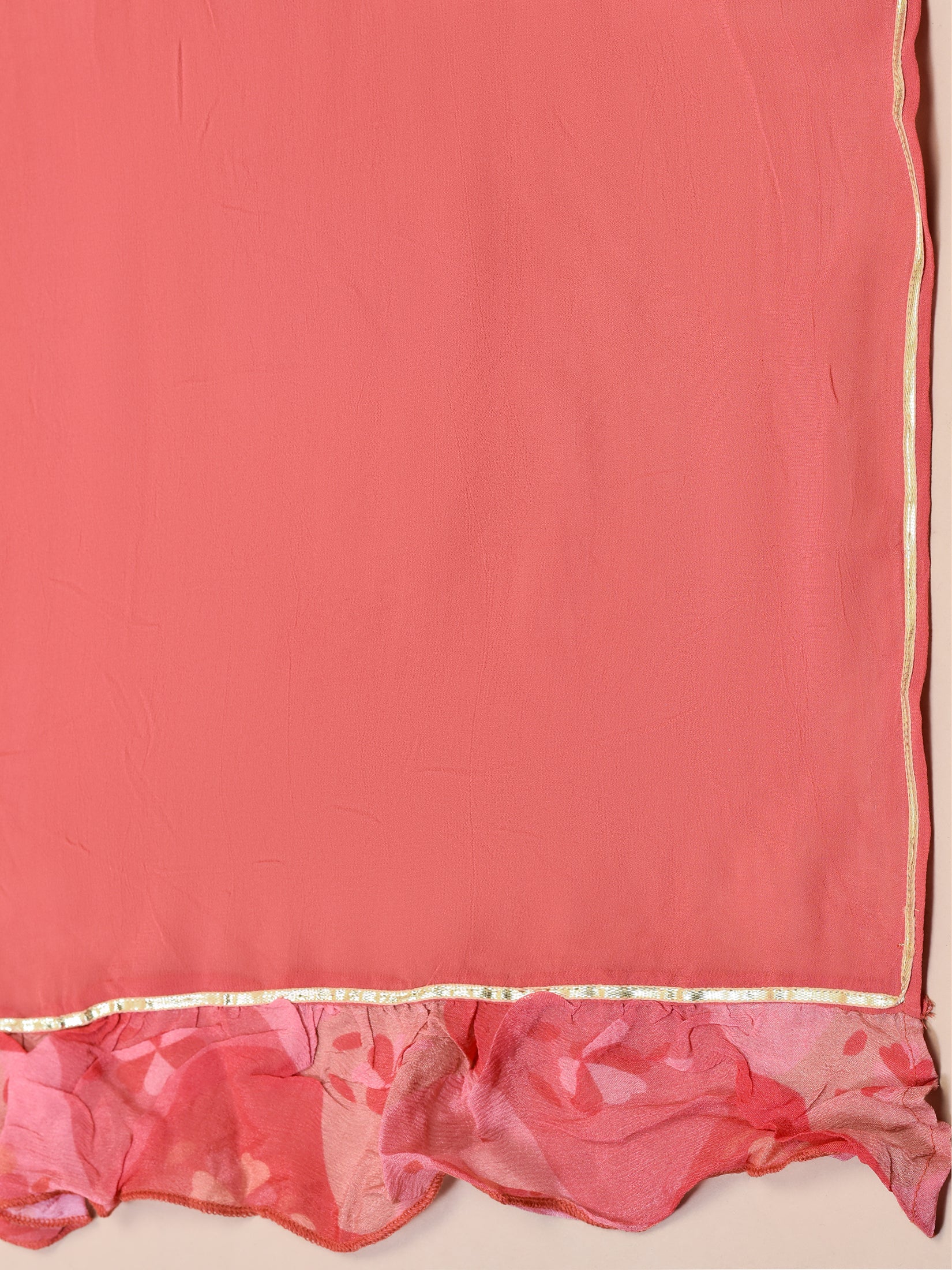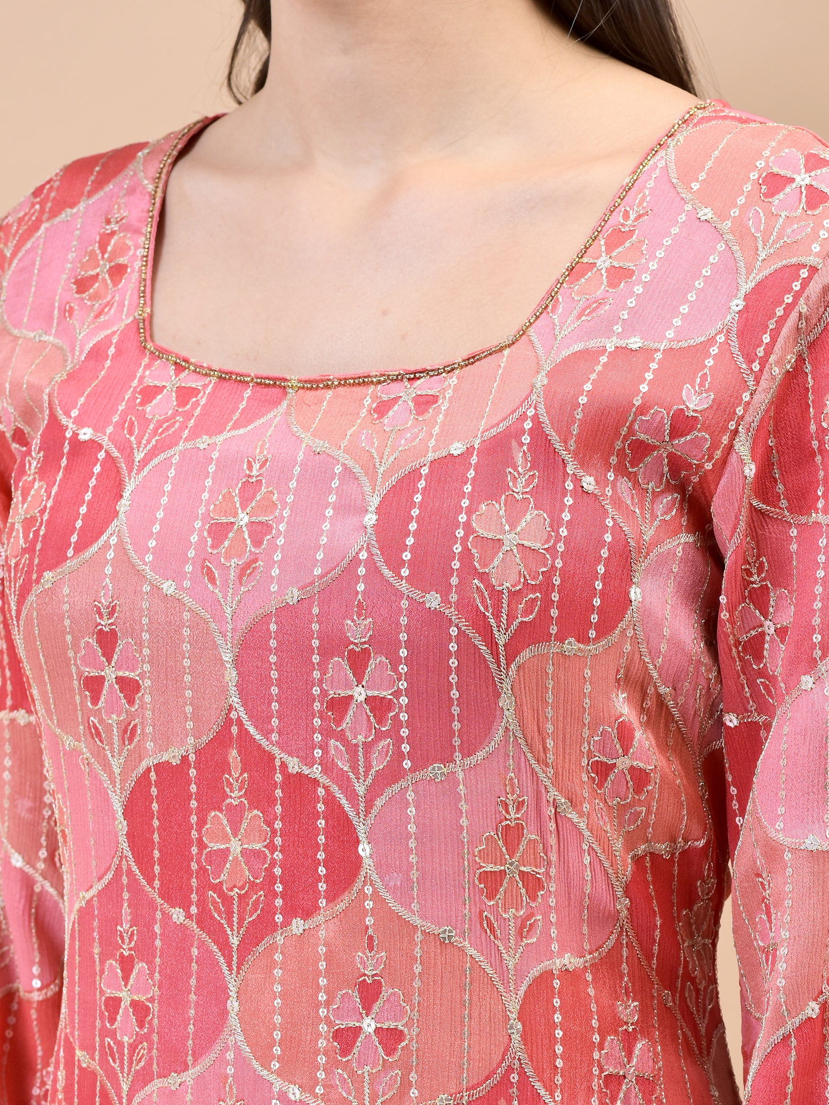 Add a touch of elegance to your festive wardrobe with the Chinon Red Floral Print Kurta Sharara Dupatta from the Privie collection. This stunning ensemble features a vibrant red kurta with a charming floral print, designed with 3/4 sized sleeves and a stylish square neckline. The straight hemline provides a flattering fit, making it perfect for festive occasions. Crafted from luxurious poly chinon fabric, the kurta offers a smooth and lightweight feel. Paired with a matching sharara and dupatta made from soft georgette fabric, this outfit ensures both comfort and style. The flowing sharara adds a touch of drama and flair, while the georgette dupatta enhances the overall look with its elegant drape. Perfect for festive celebrations, this outfit combines traditional charm with contemporary design, ensuring you look your best. Shop away charming chinon attires.