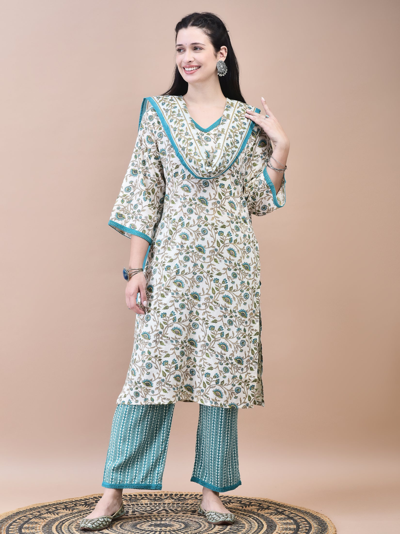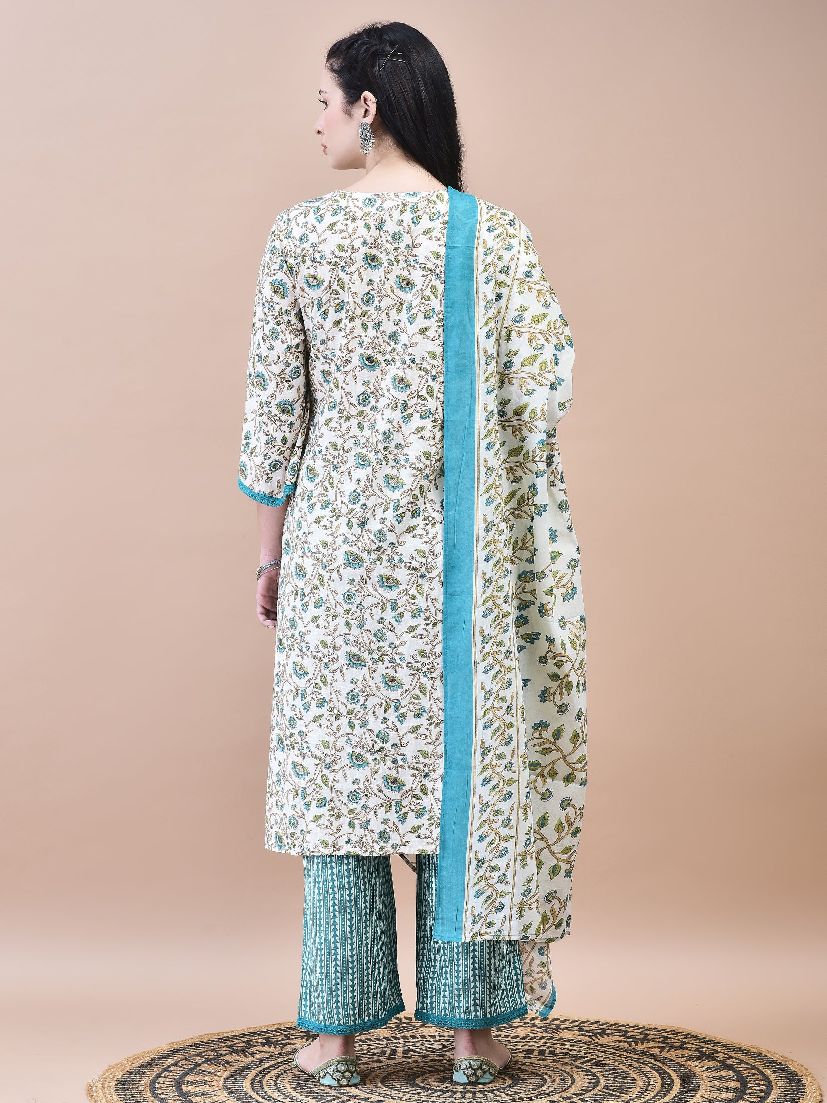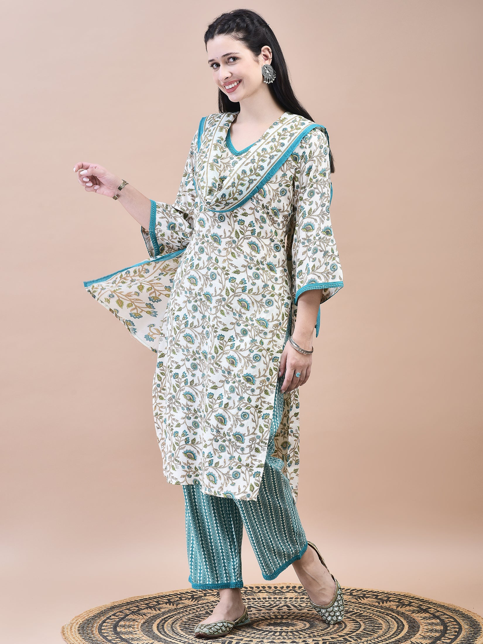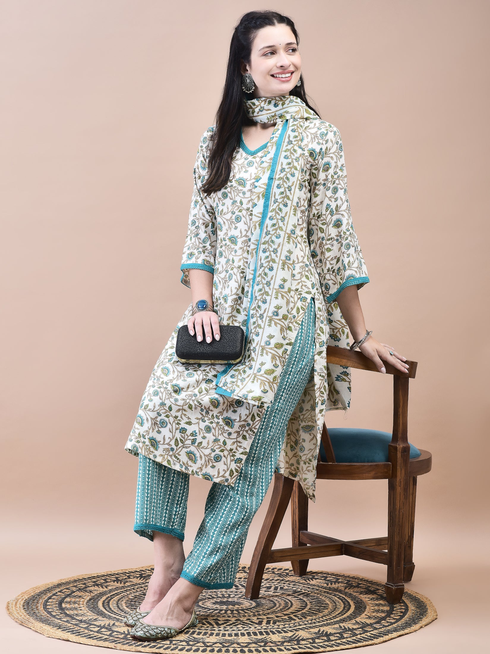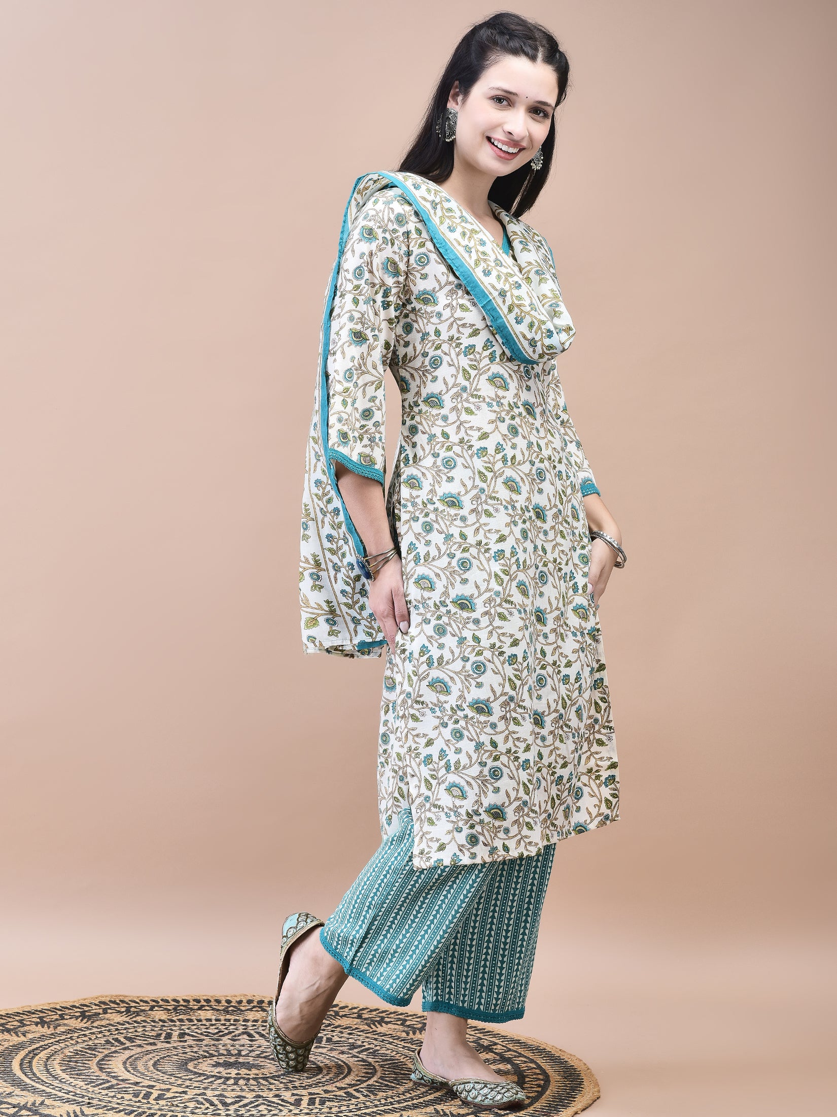 Women Cotton Off-White Teal Floral Print Kurta Comfort Pant Dupatta
