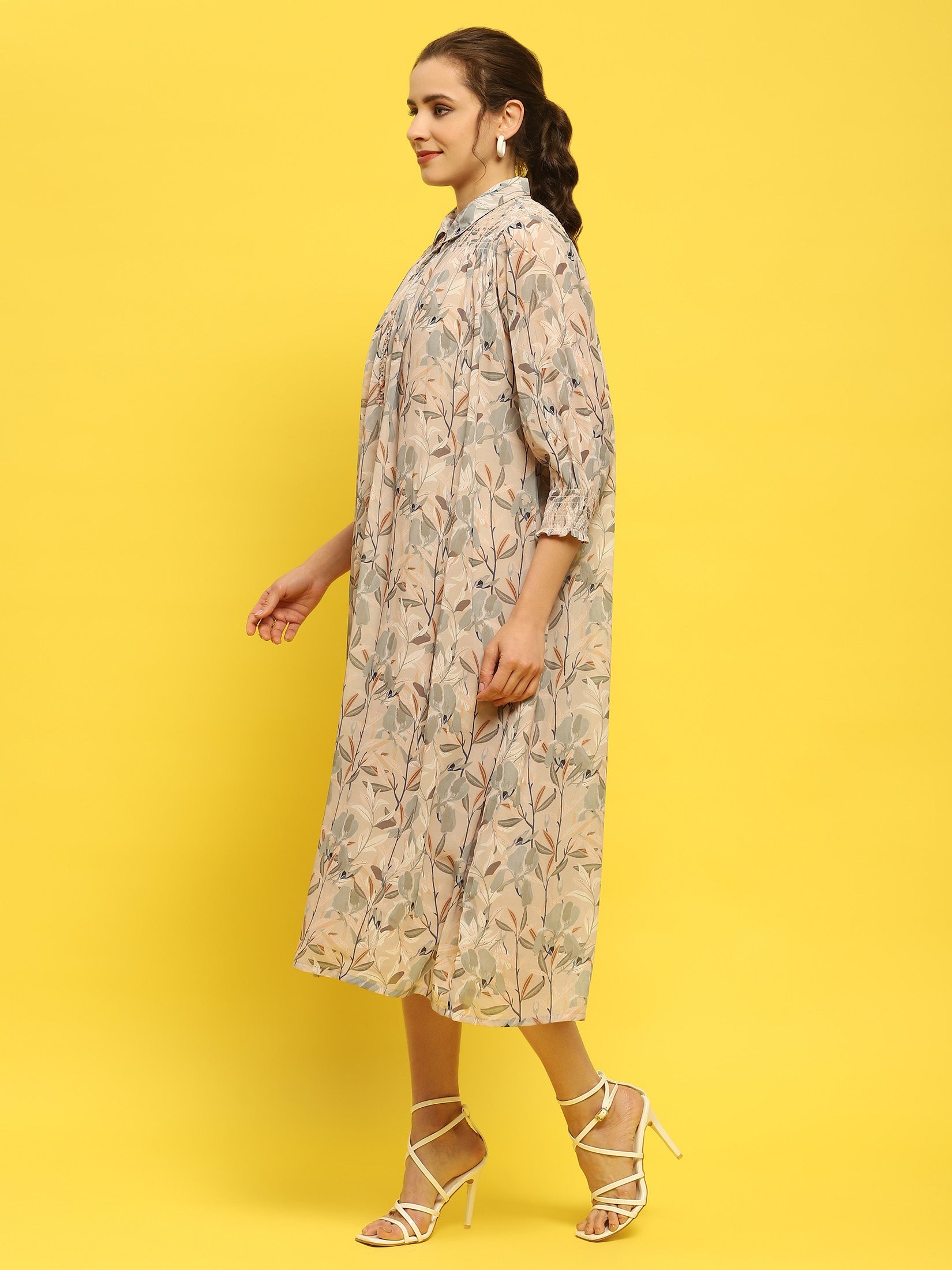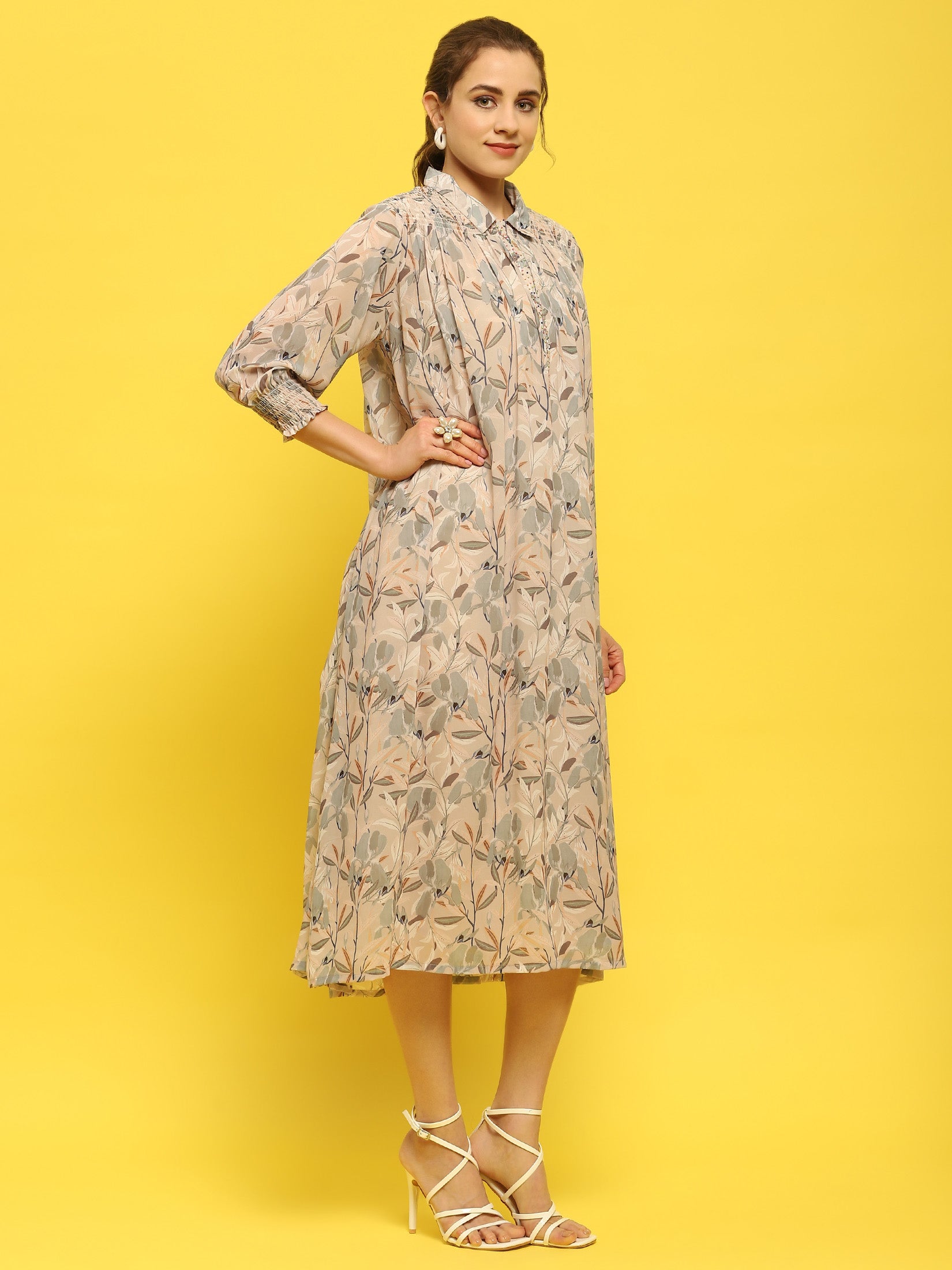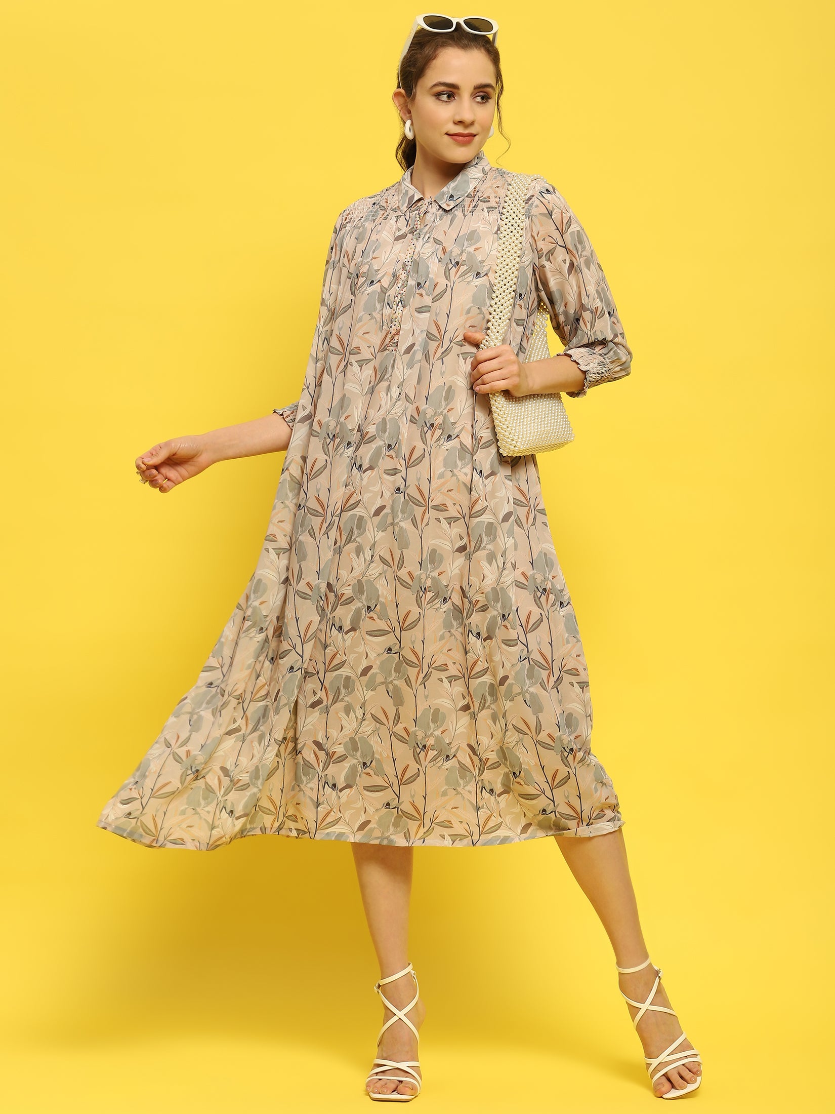 Introducing the Georgette Beige Abstract Print Dress, a fusion of elegance and versatility designed for both everyday wear and professional settings. This dress features 3/4 sized sleeves and a sophisticated shirt collar neckline, enhancing its chic appeal. Crafted from lightweight georgette fabric, it offers a breezy, comfortable fit ideal for all-day wear. The abstract print adds a modern twist, elevating its charm and making it a standout piece in your wardrobe. Its flattering fit and flare silhouette accentuates your figure gracefully, ensuring a flattering look on any occasion. Whether you're attending meetings or enjoying a casual outing, the Georgette Beige Abstract Print Dress promises to keep you stylish and confident. Embrace effortless sophistication and timeless style with this wardrobe essential that seamlessly transitions from day to evening with ease.