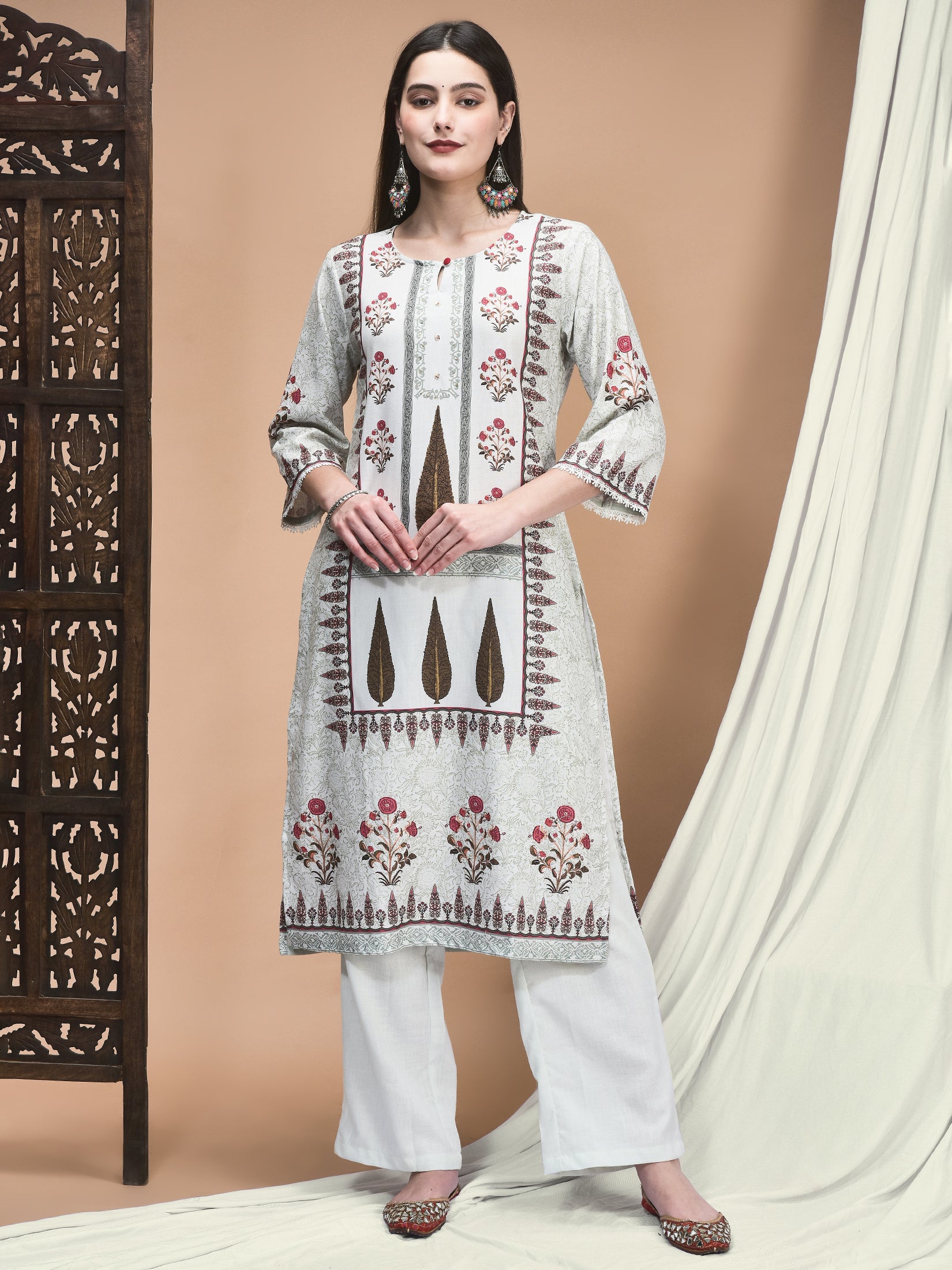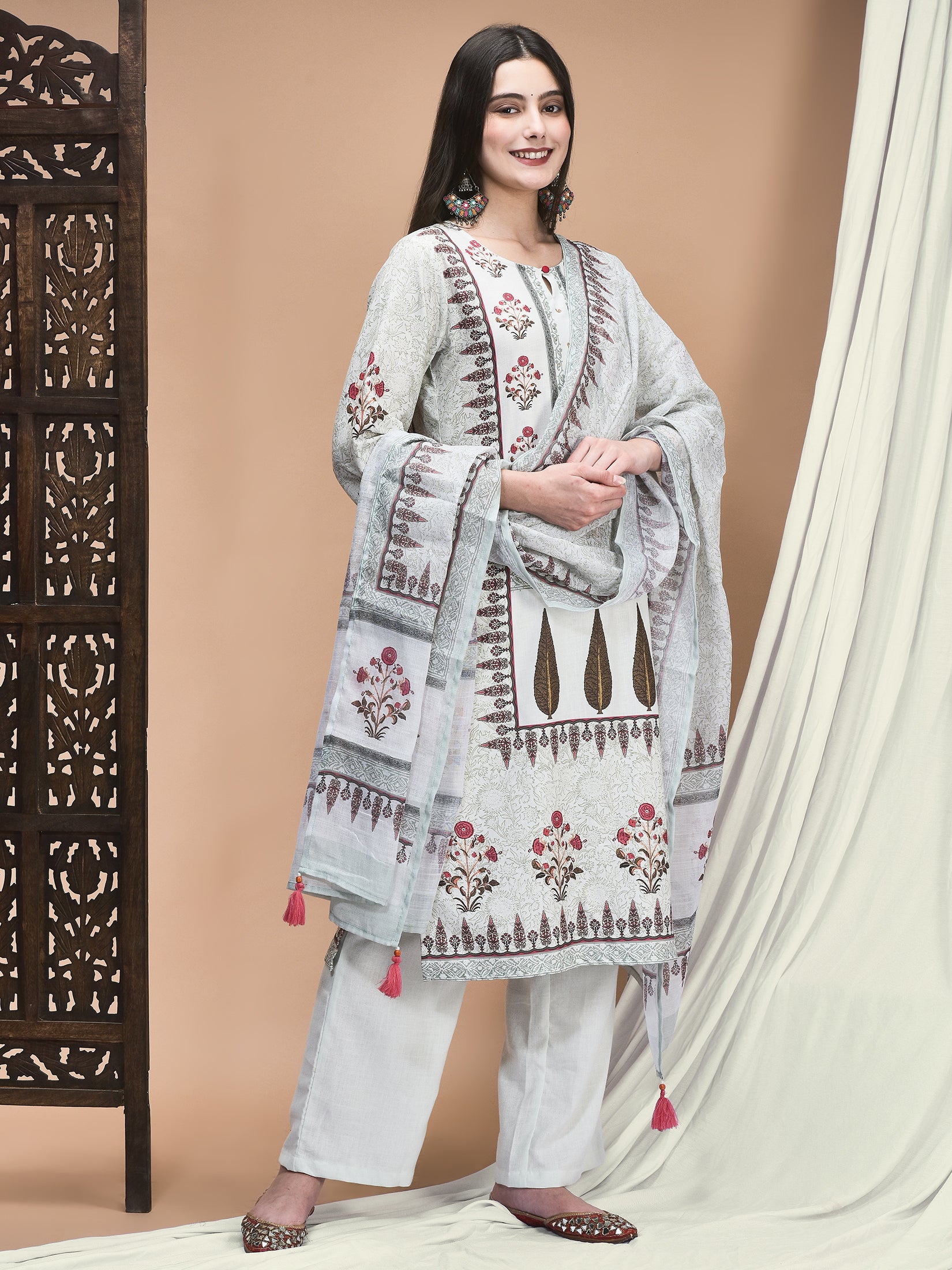 Women Linen Green Floral Print Kurta Comfort Pant Dupatta