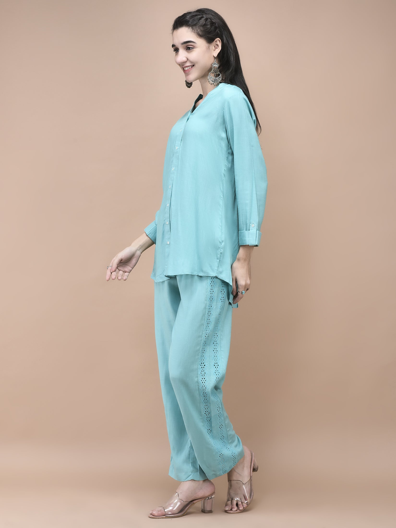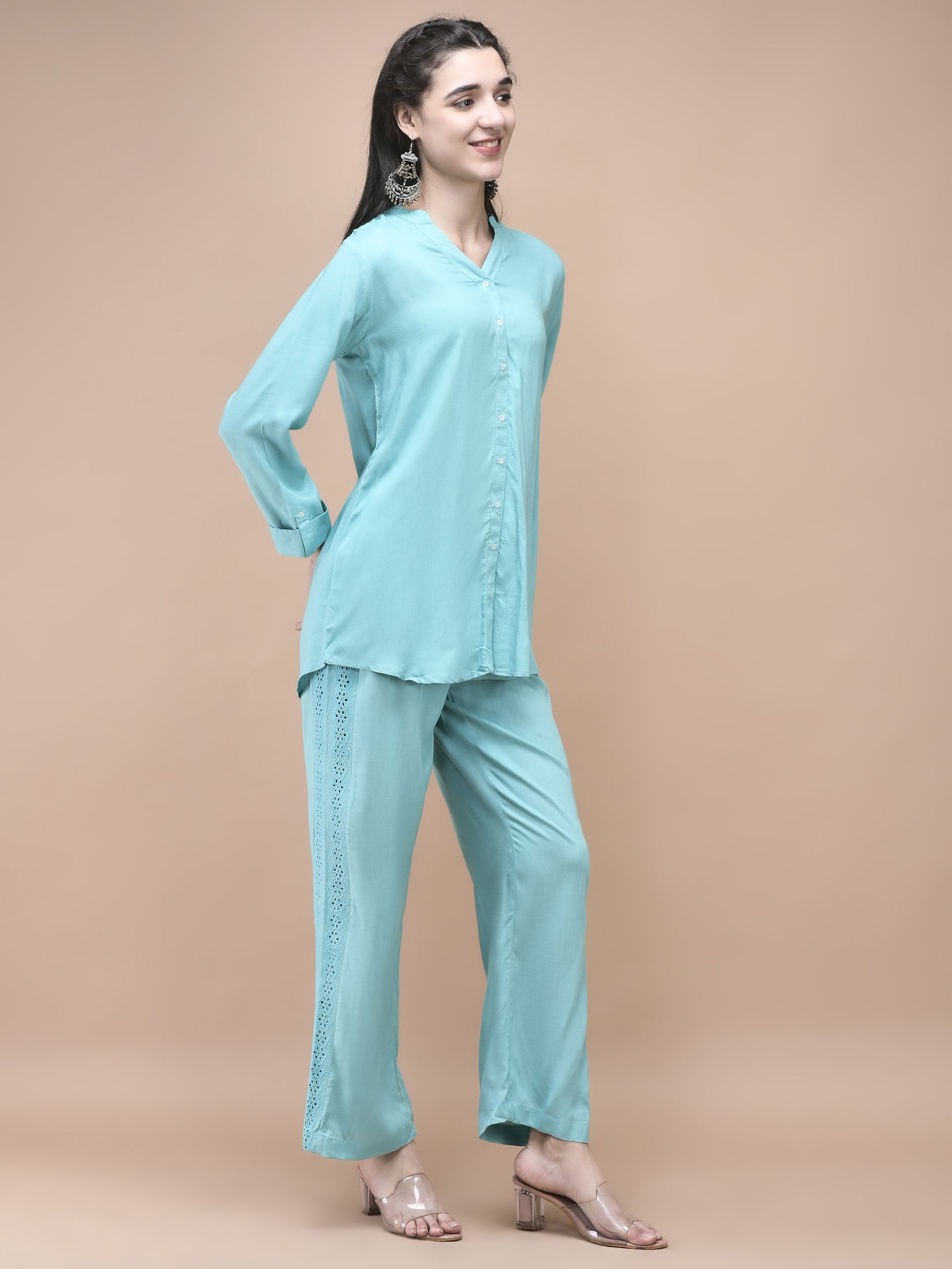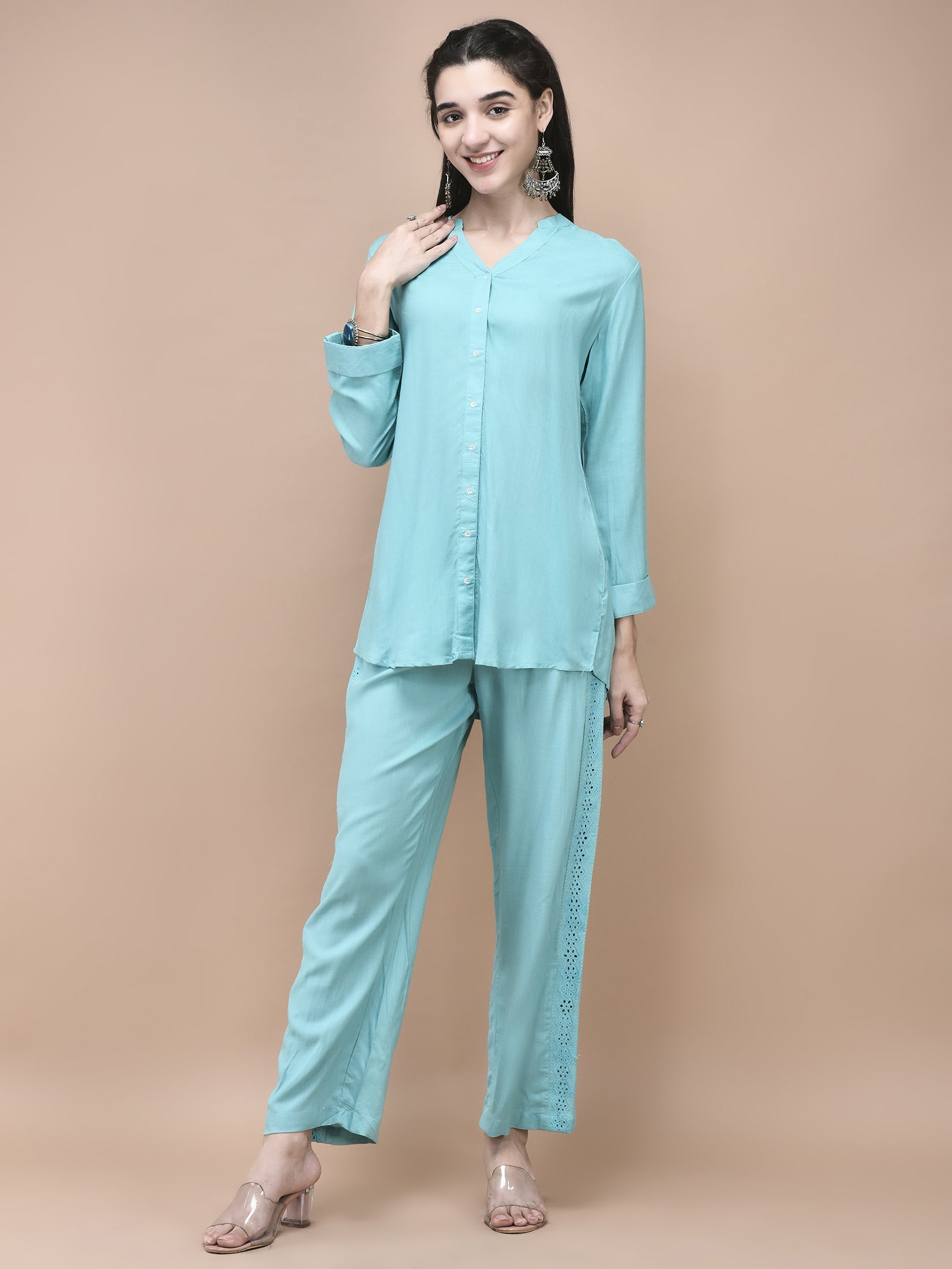 Add a touch of elegance to your everyday wardrobe with this blue embroidered co-ord set crafted from soft Liva rayon. The top features a stylish mandarin collar and long sleeves, while the straight-cut silhouette offers a comfortable fit. Paired perfectly with matching bottoms, this set blends sophistication with ease, making it ideal for daily wear or casual outings. This creation by SHREE - She is Special celebrates a simple yet refined style.