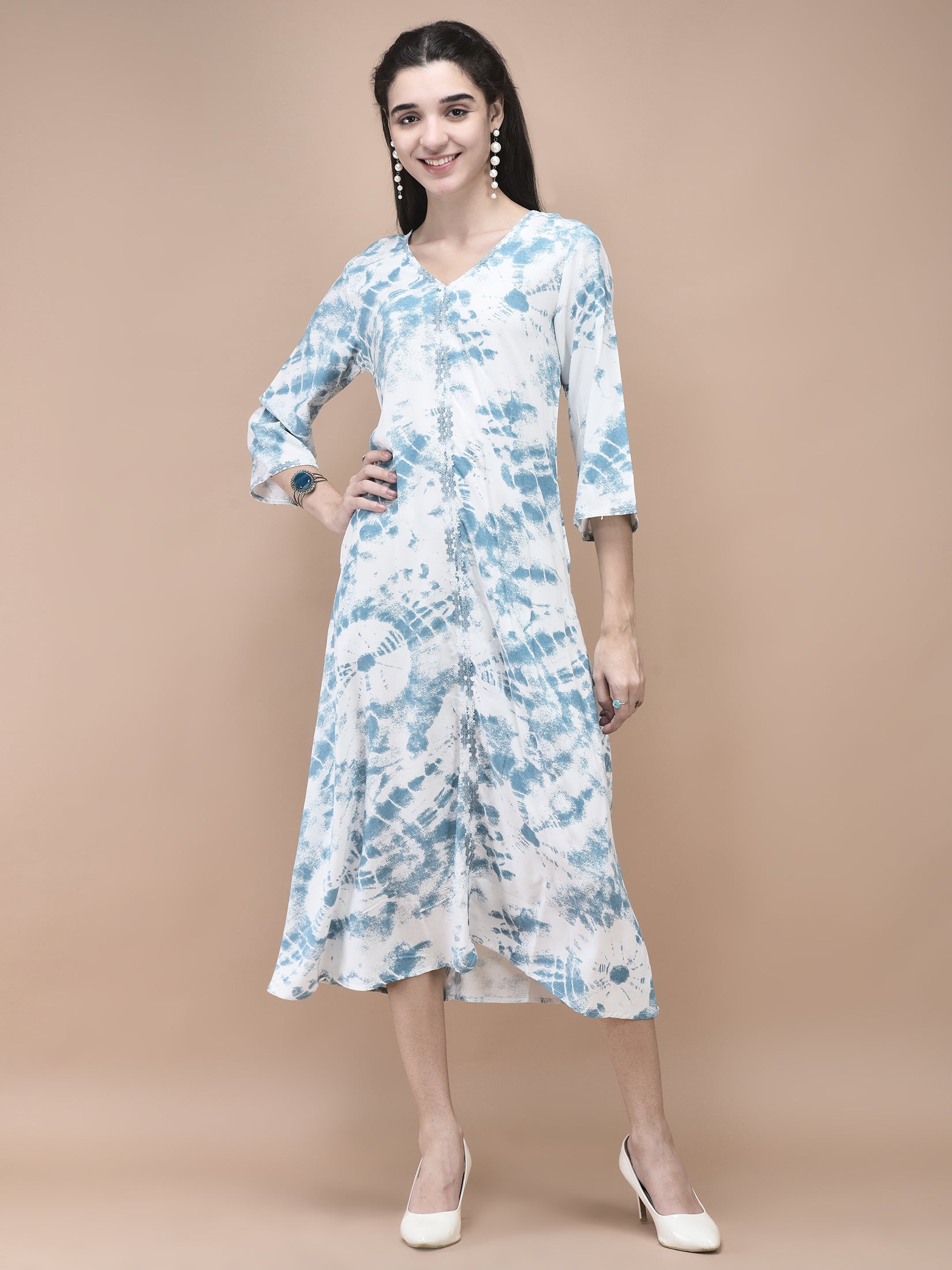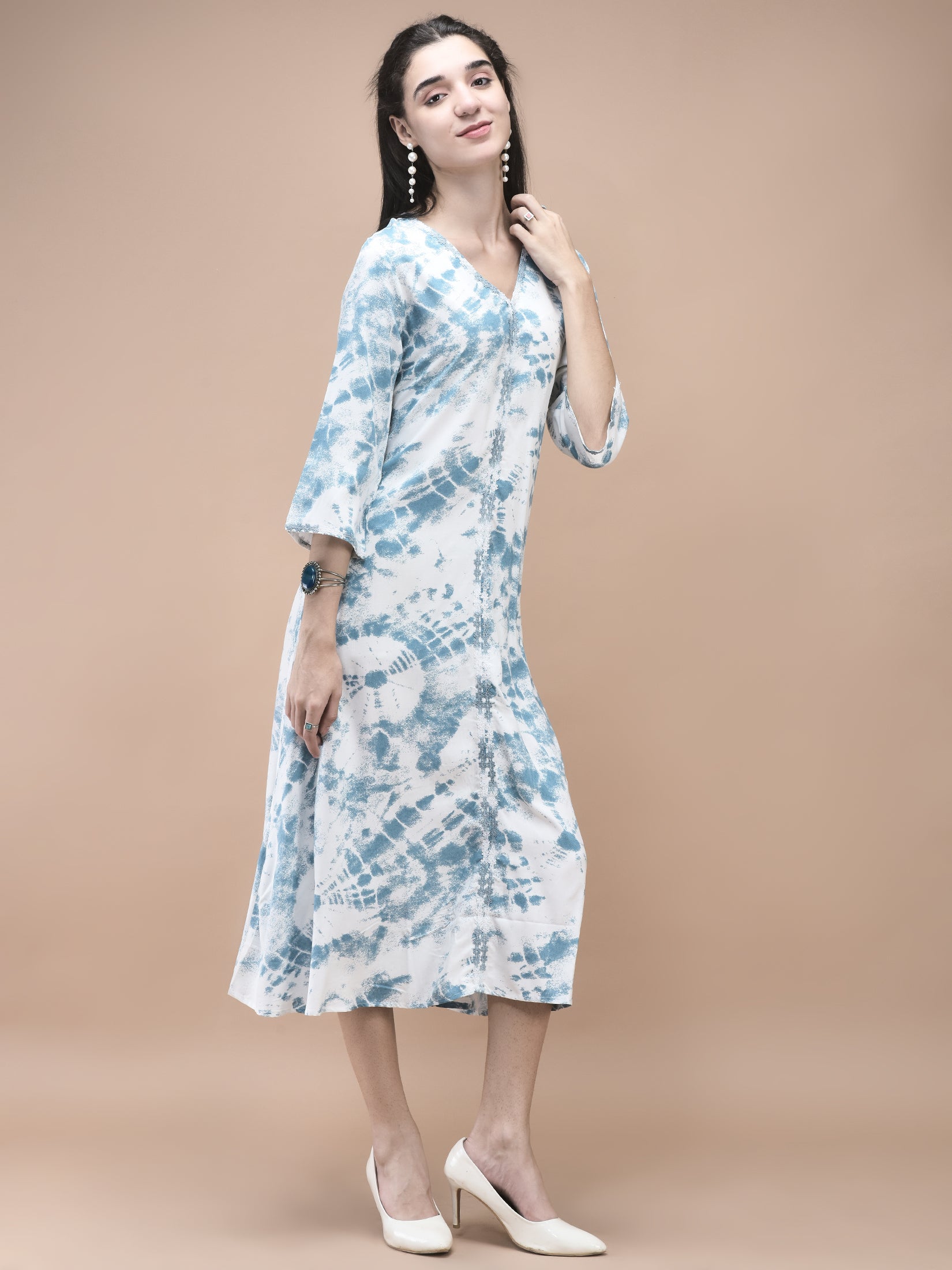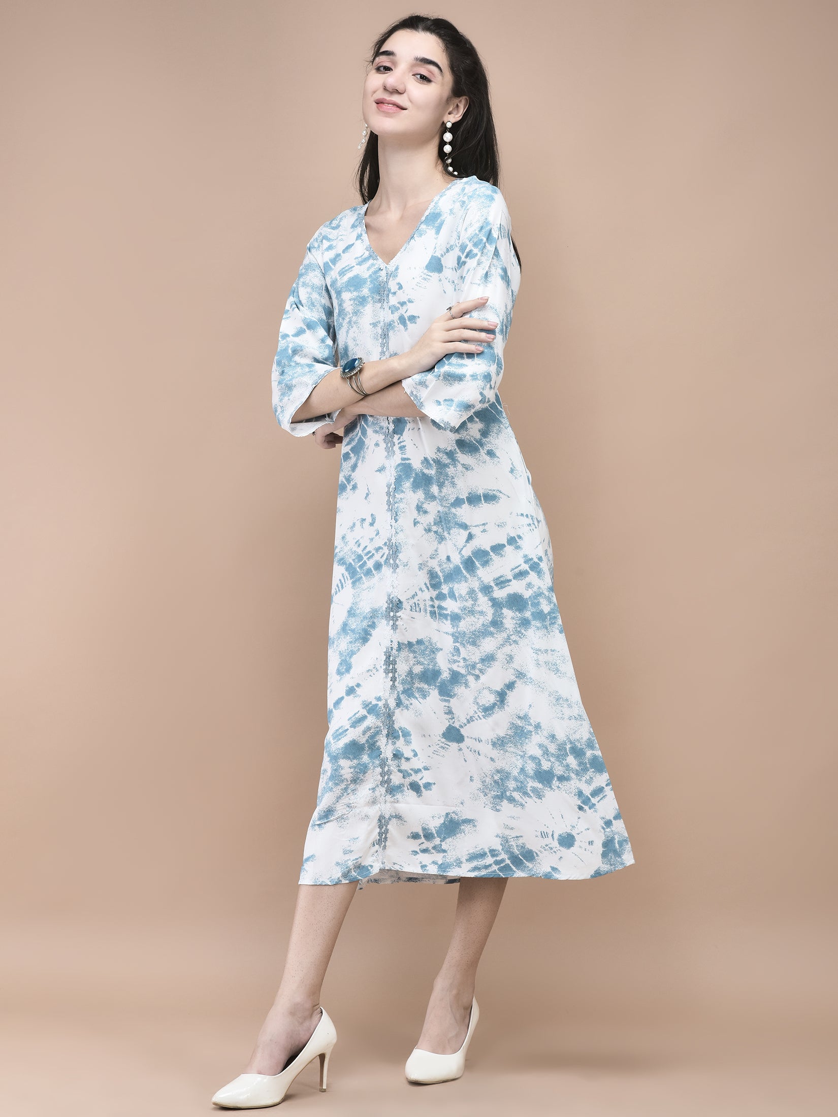 This blue Liva dress brings effortless charm to your everyday wardrobe. Made from soft, breathable rayon fabric, it features a classic V-neck and flattering A-line shape. The subtle tie-dye print adds a touch of uniqueness, while the 3/4 sleeves make it perfect for any season. Comfortable and stylish, it?s an easy choice for daily wear.