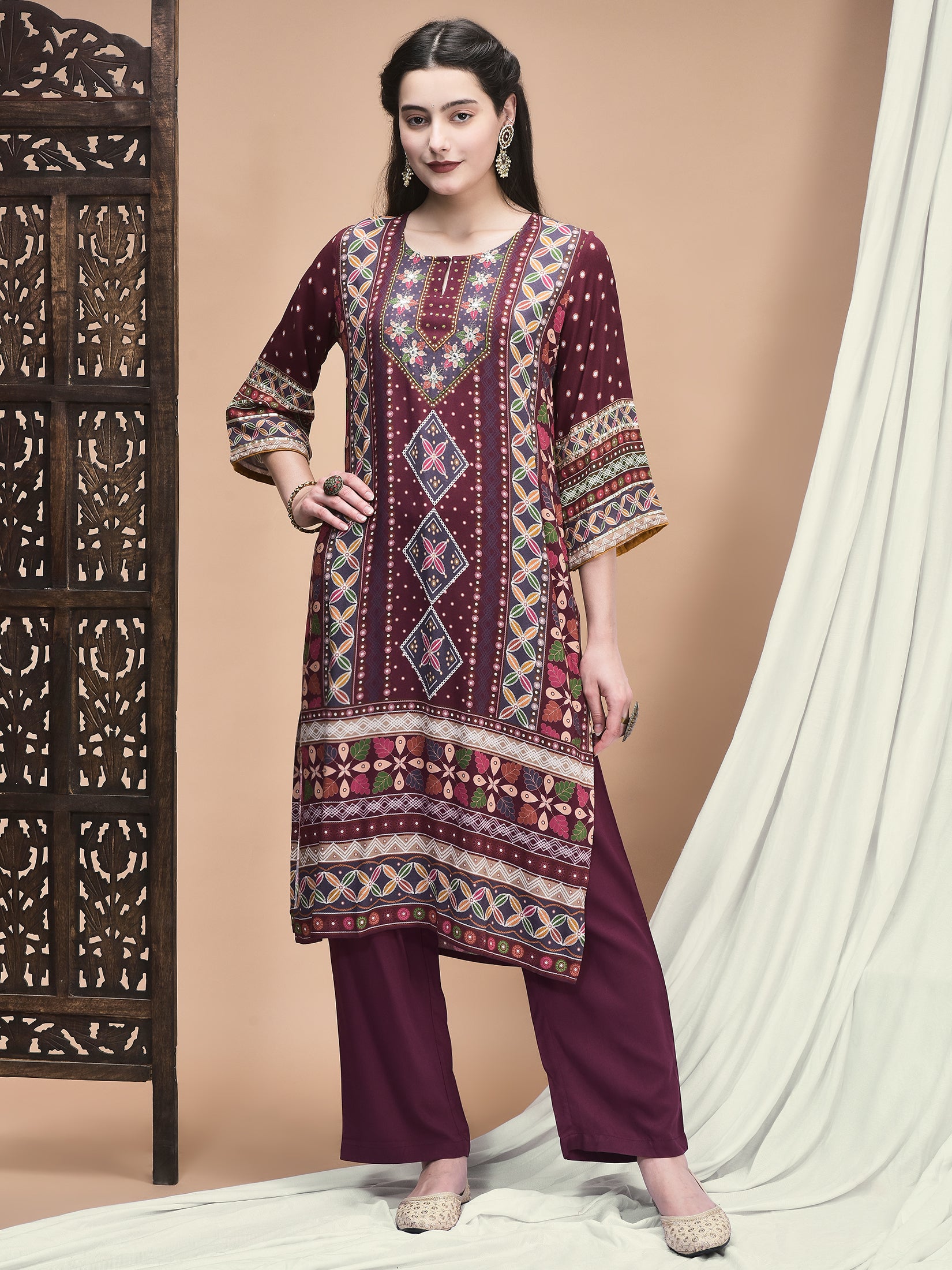 Women Liva Magenta Ornamental Print Kurta Comfort Pant Dupatta.