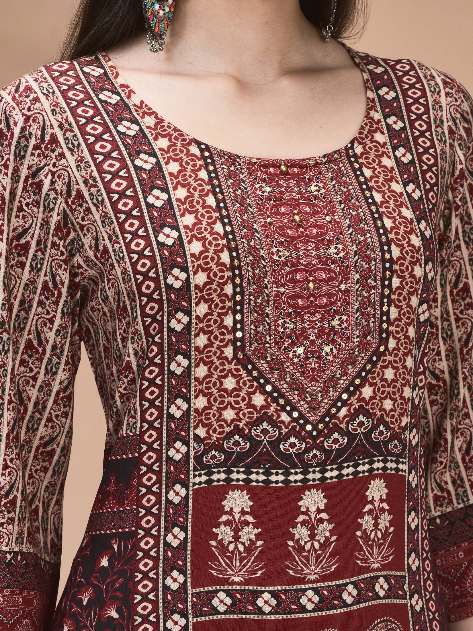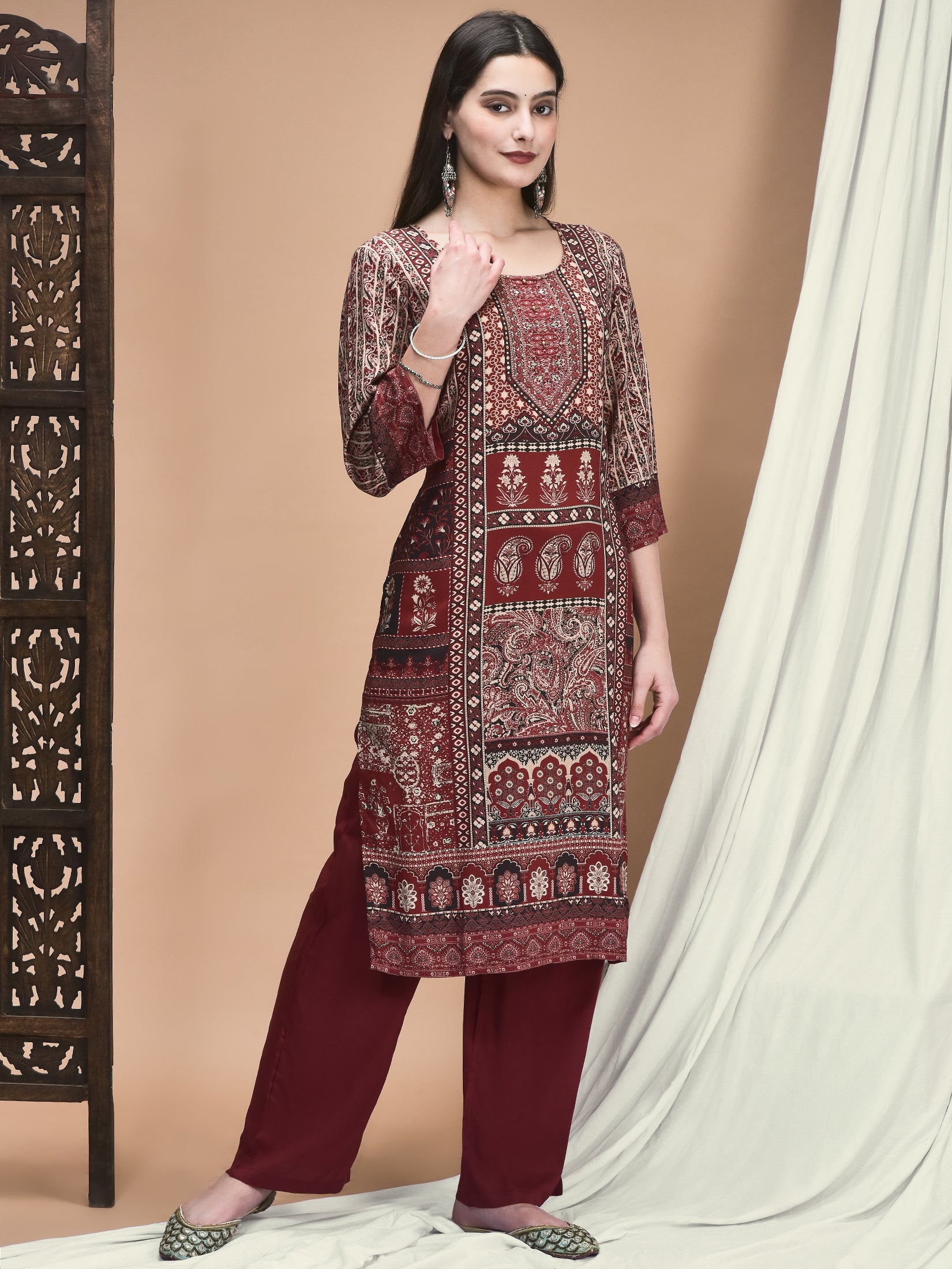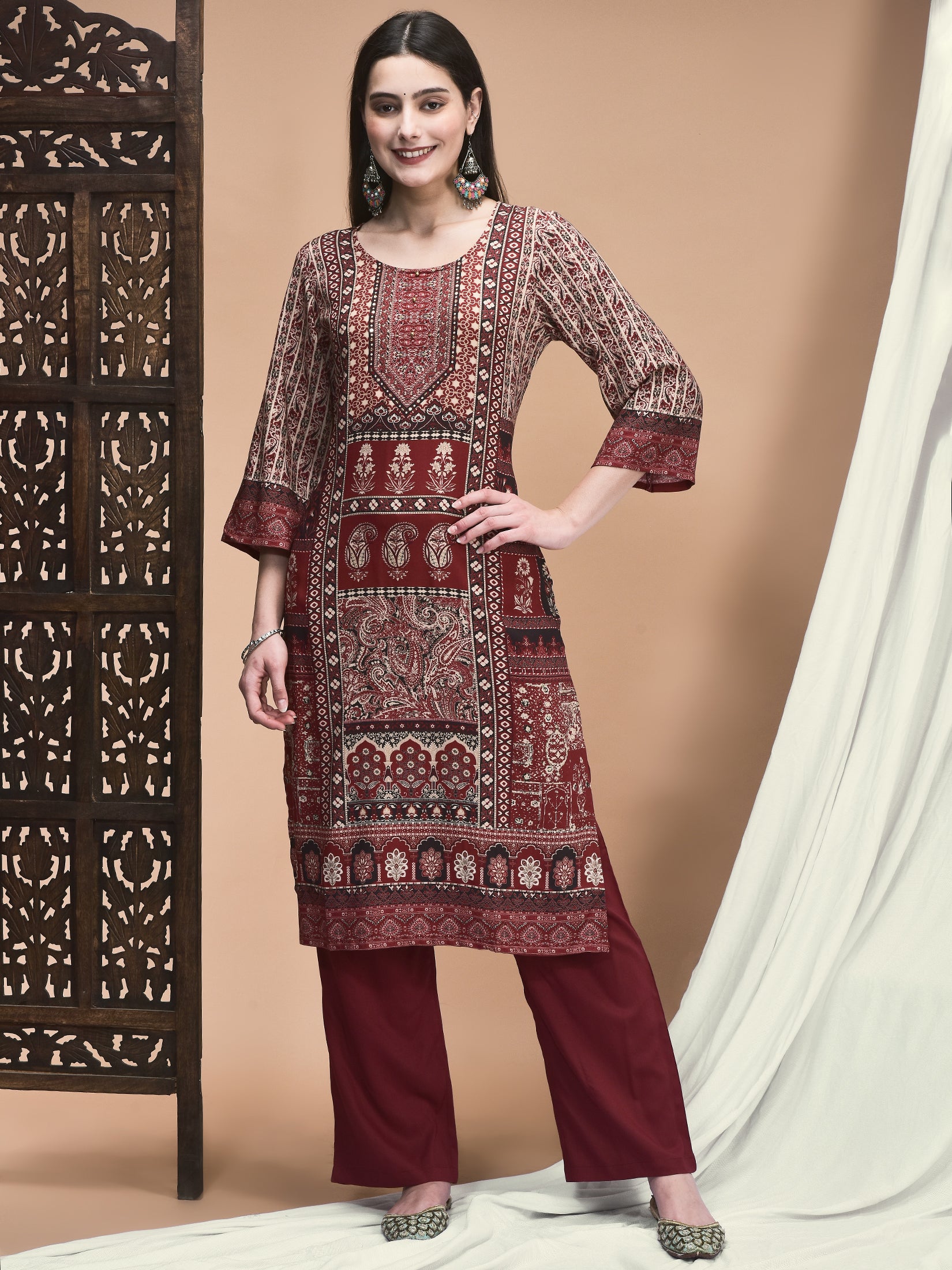 Women Liva Maroon Ornamental Print Kurta With Comfort Pant