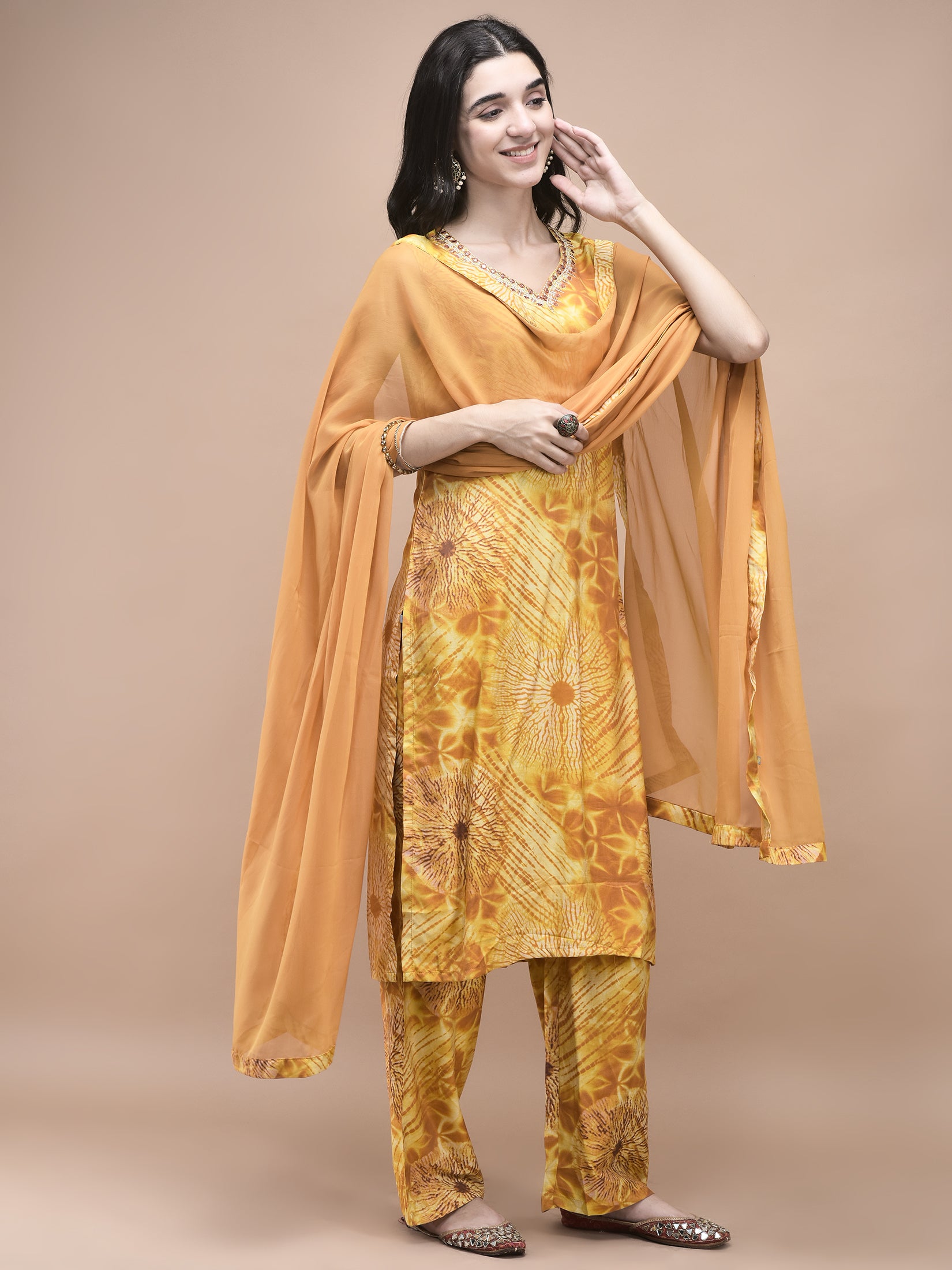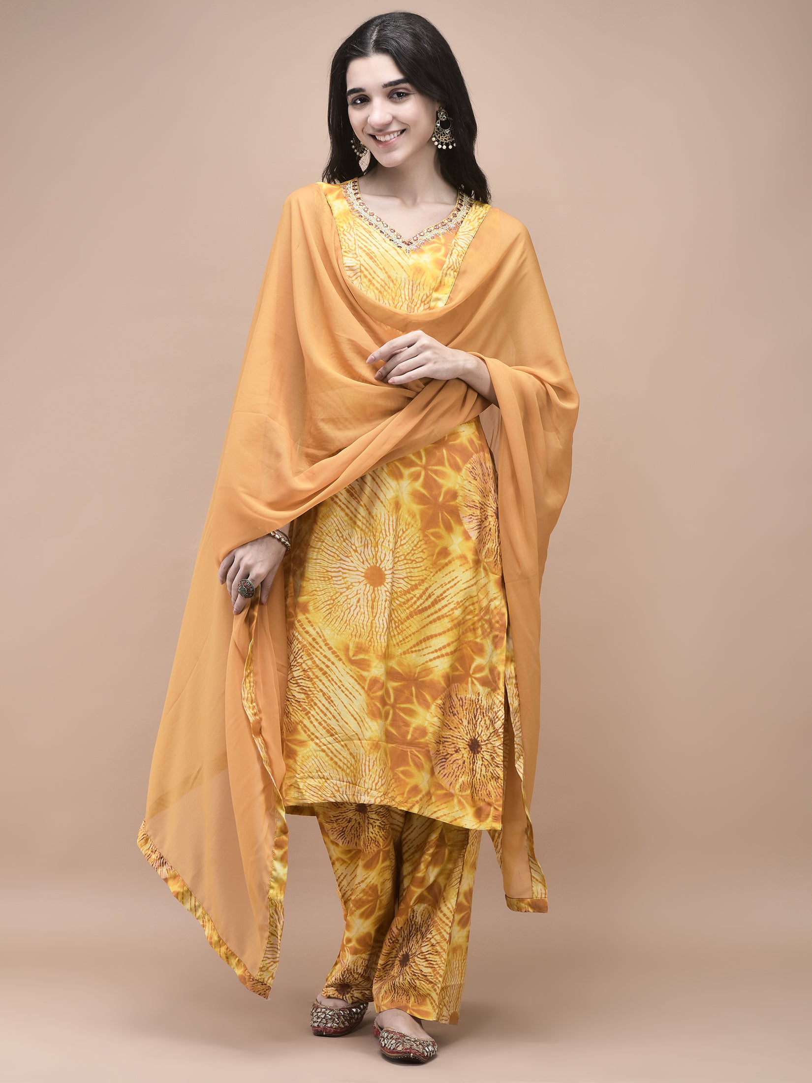Women Liva Mustard Tie Dye Print embroidered Kurta Comfort Pant Dupatta