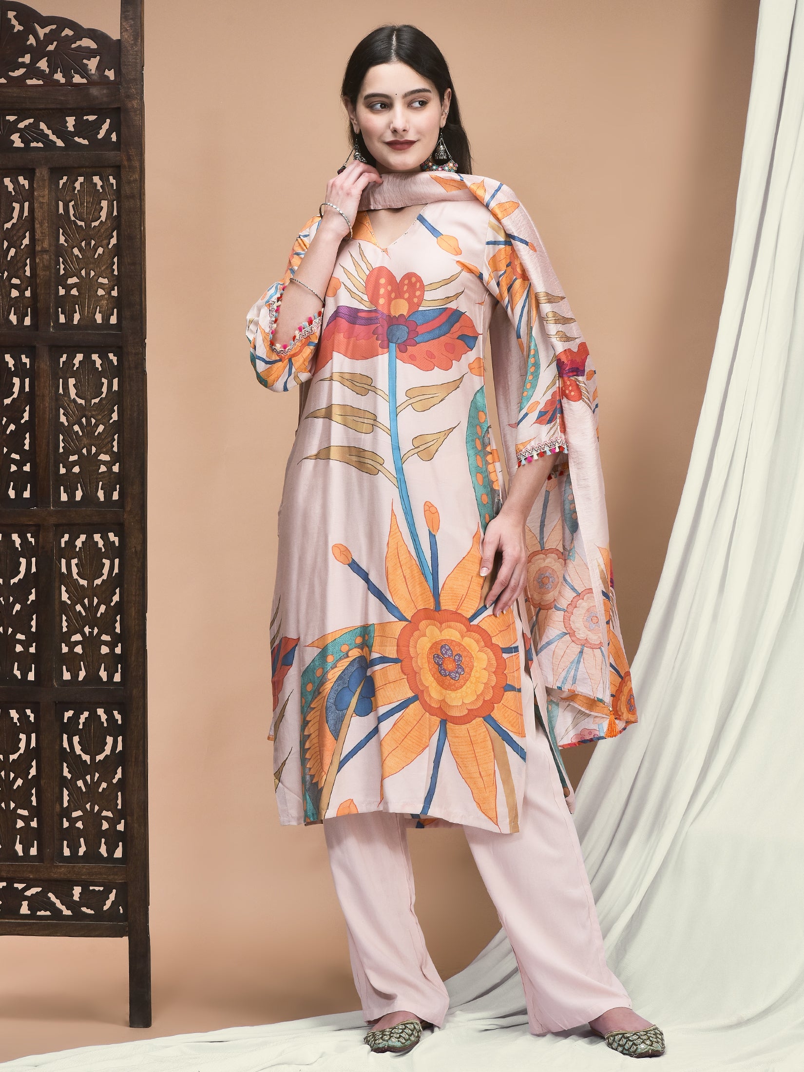 Women Liva Peach Multicolor Floral Print Kurta Comfort Pant Dupatta