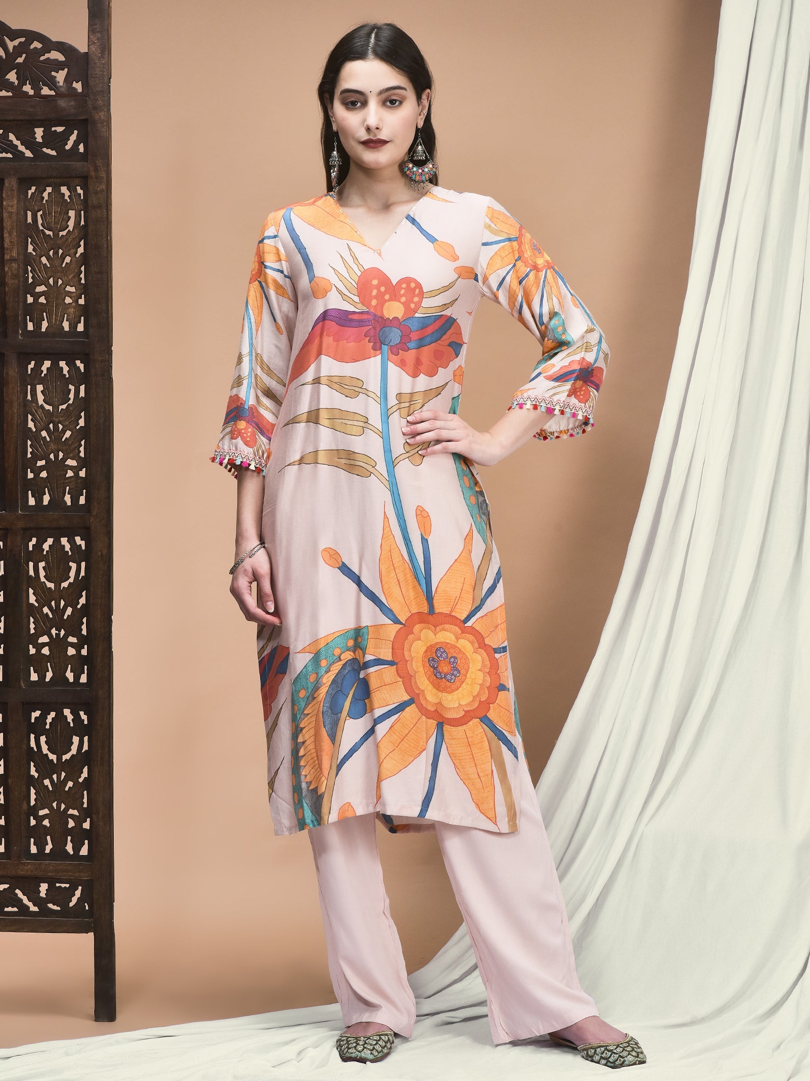 Women Liva Peach Multicolor Floral Print Kurta Comfort Pant Dupatta Skip to content