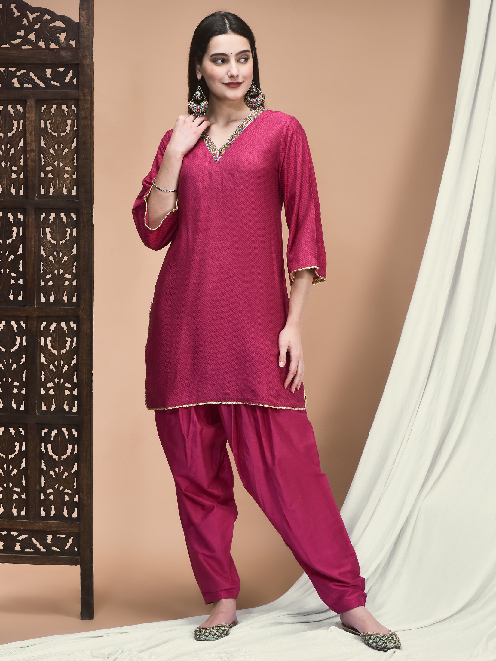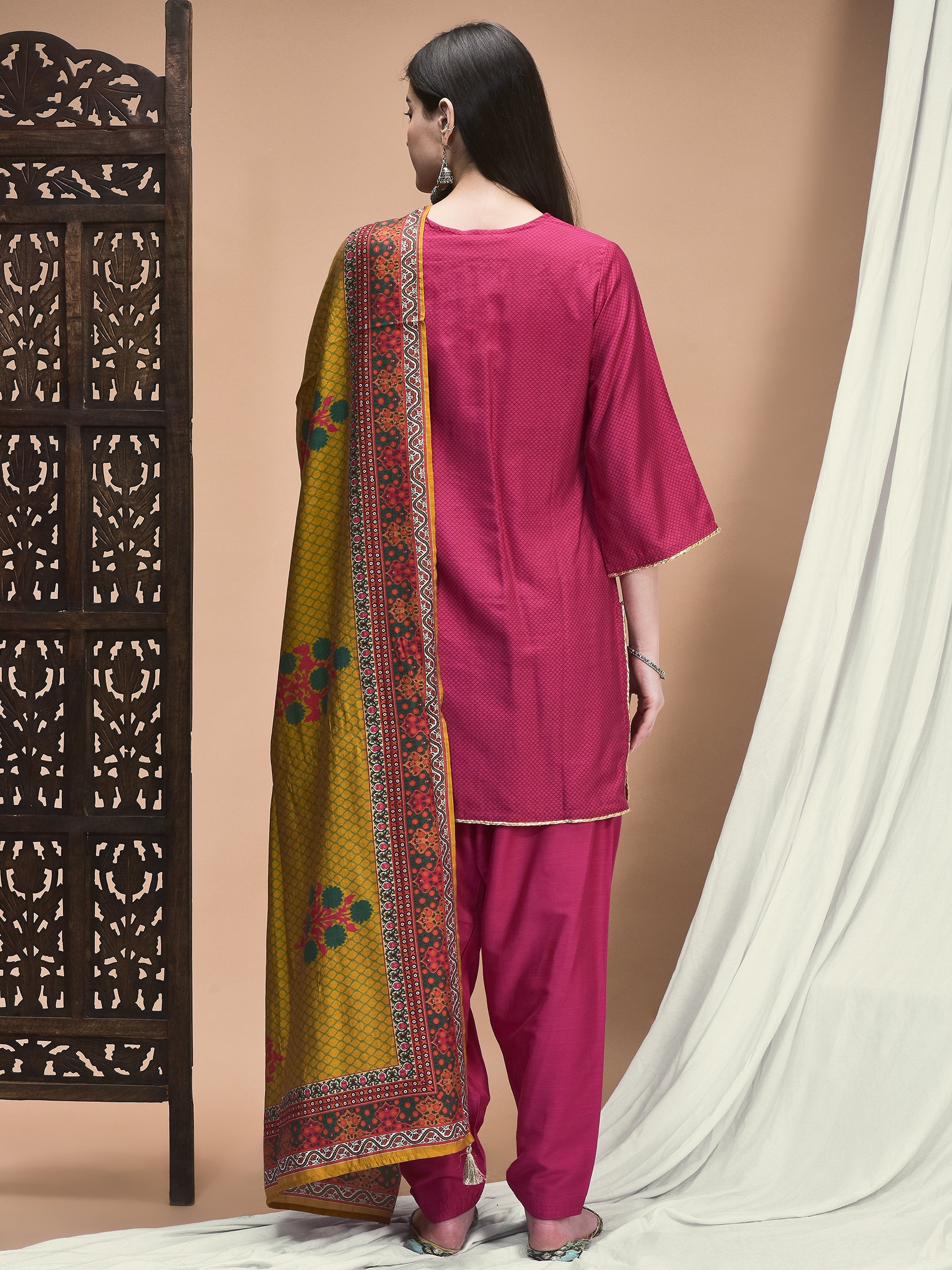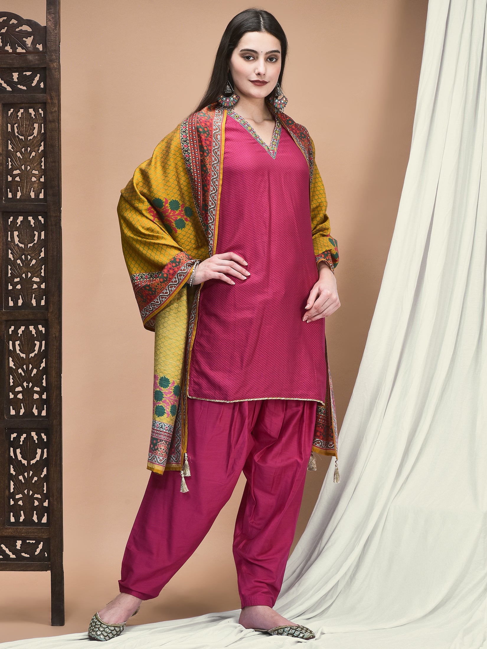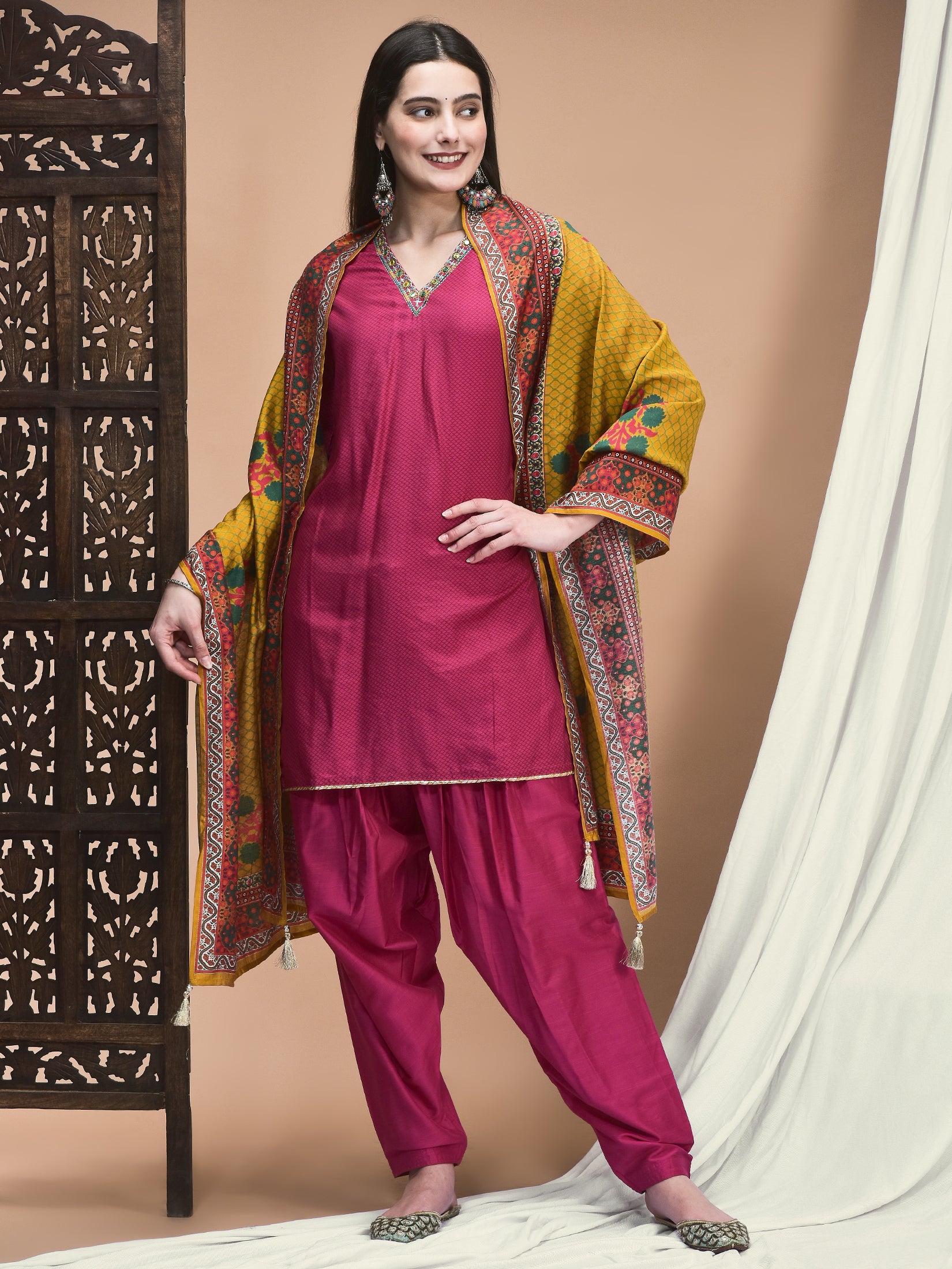 Women Liva Pink Embroidered Kurta Salwar Dupatta