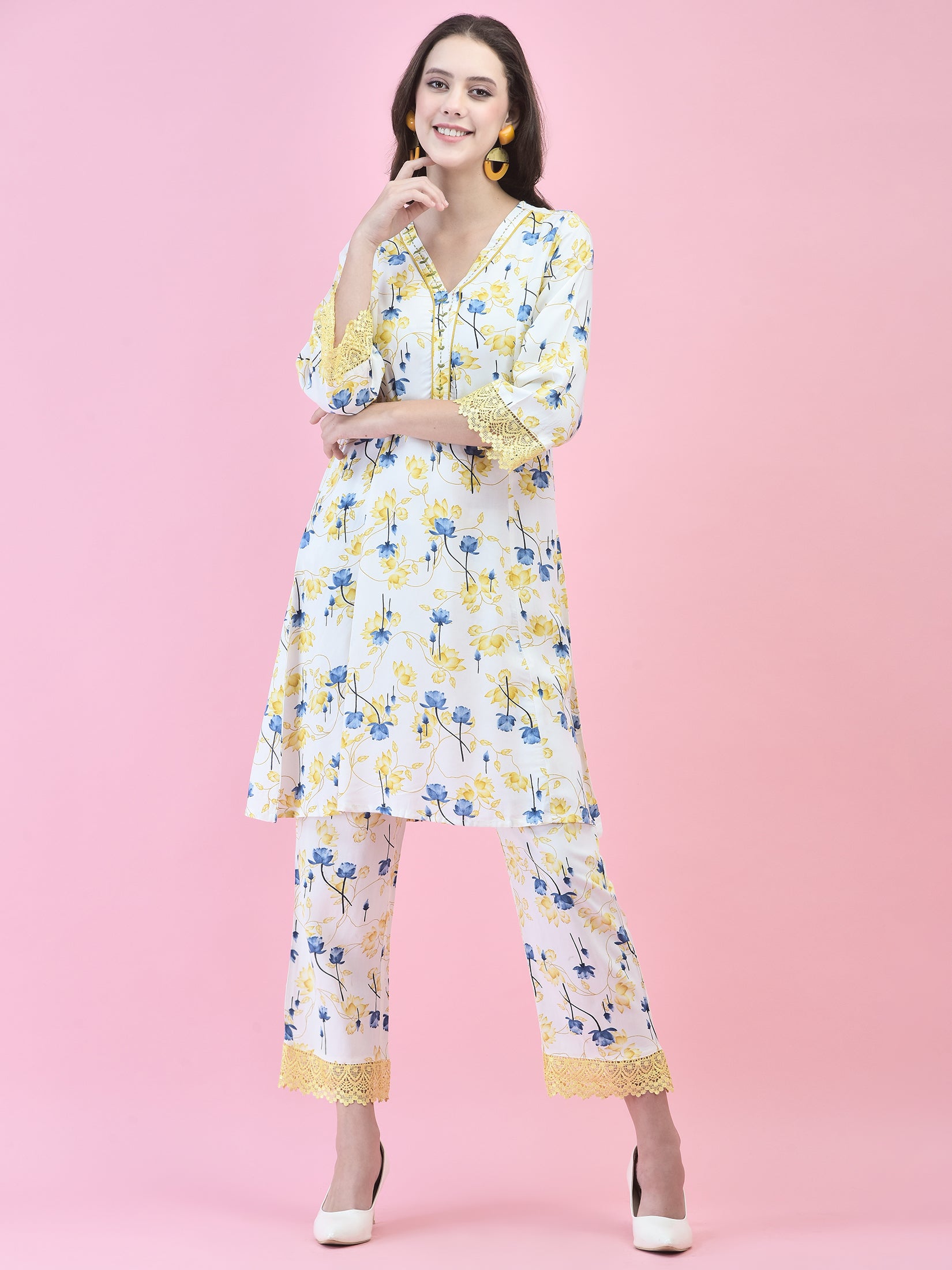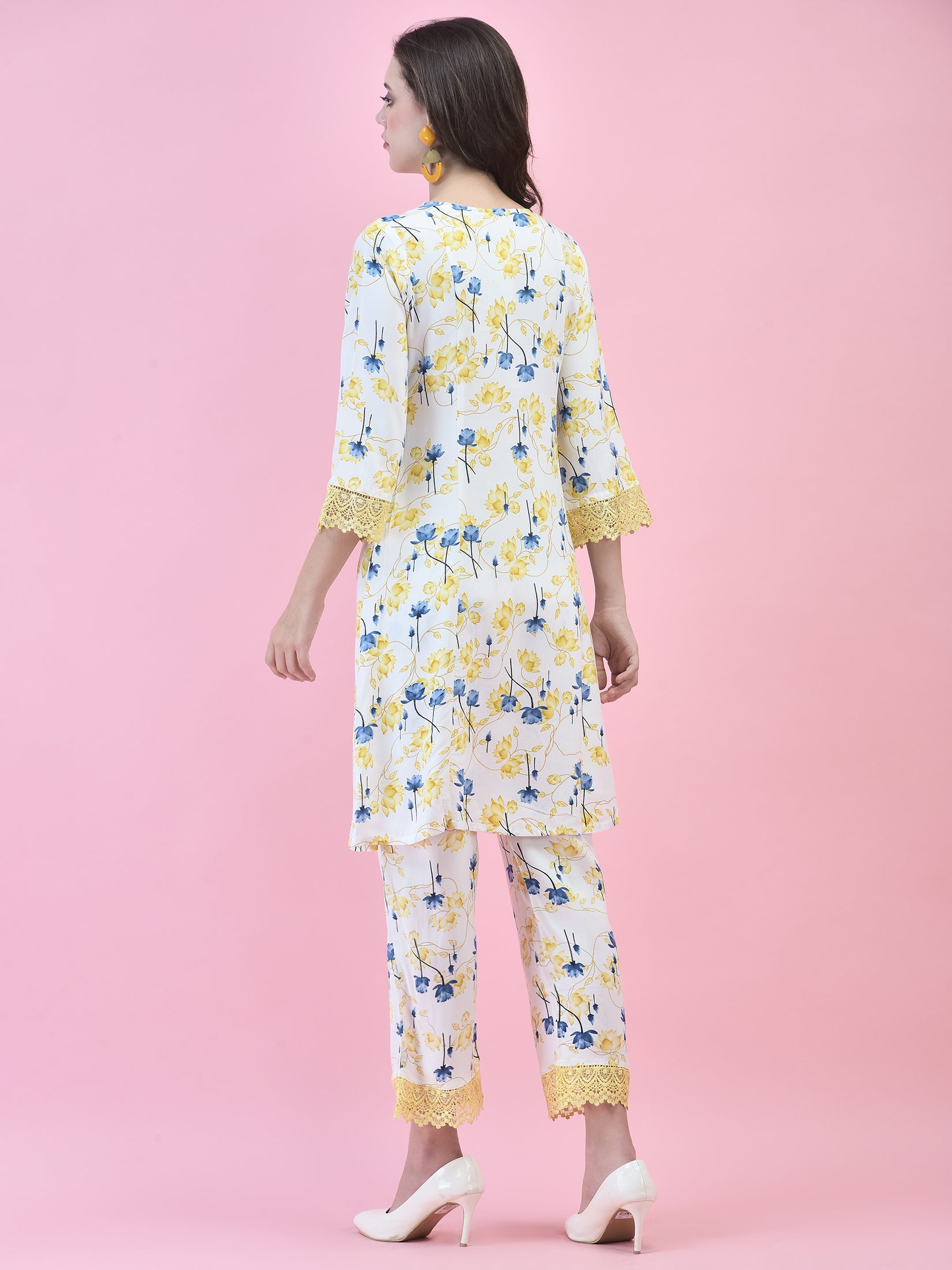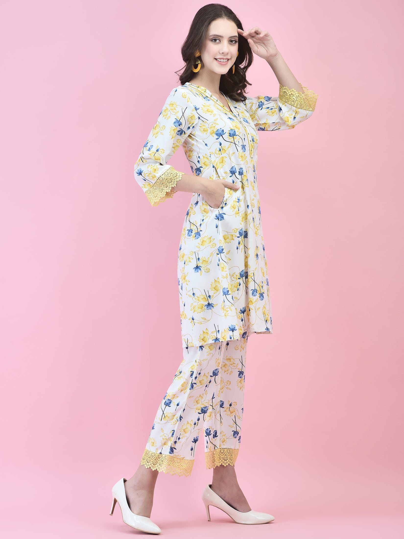 Women Liva (Rayon) White Floral Print Co-Ord Set