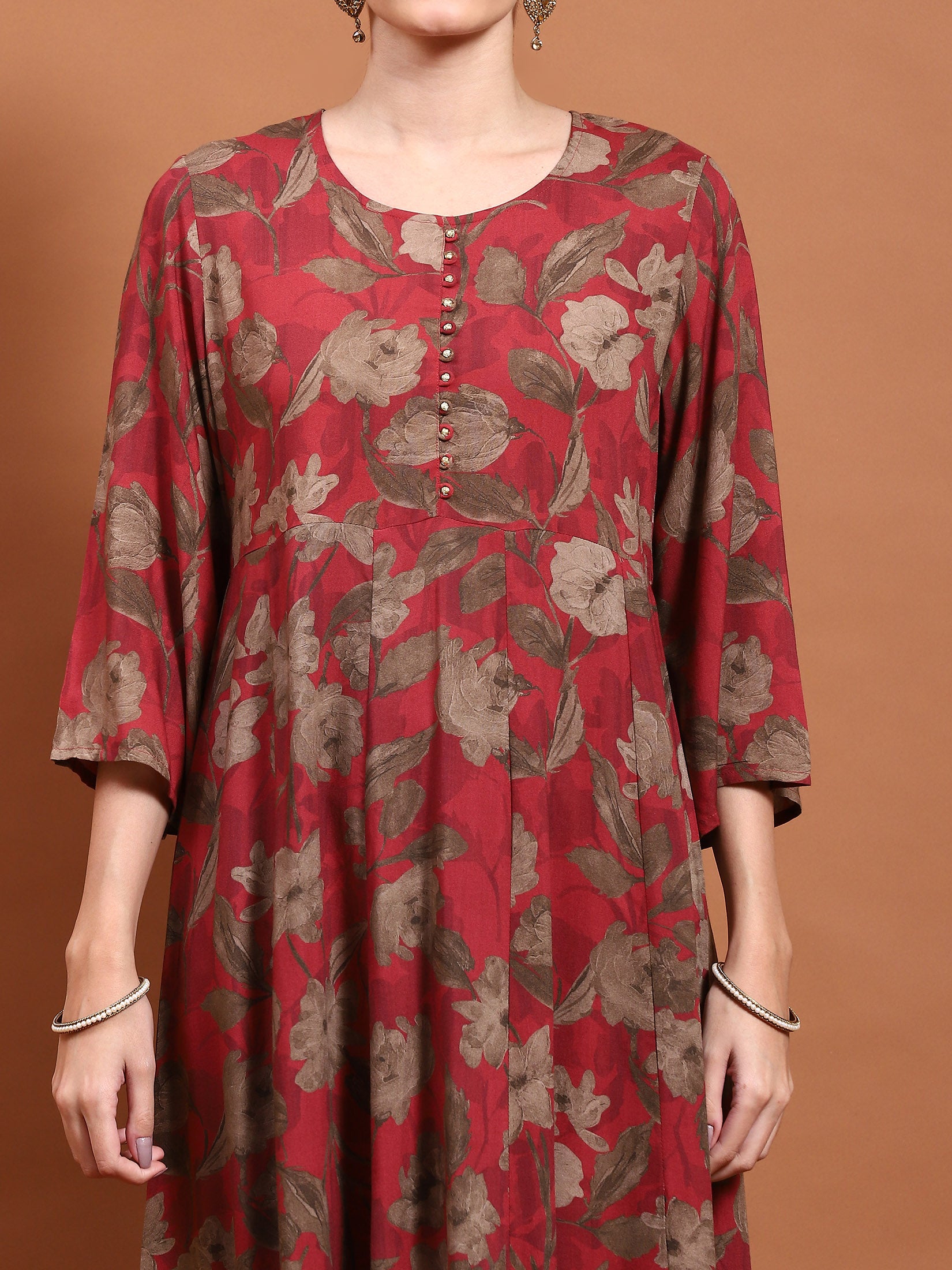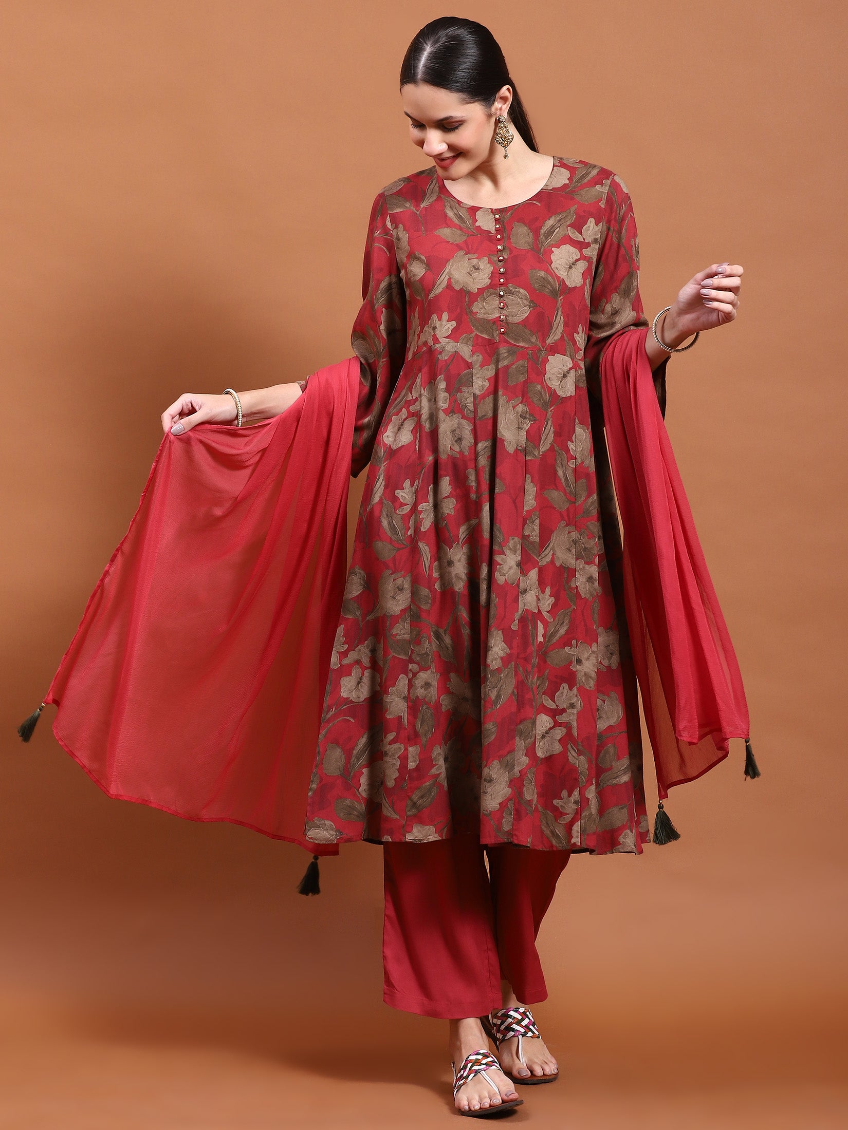 Women Maroon Floral Print Kurta Comfort Pant Dupatta