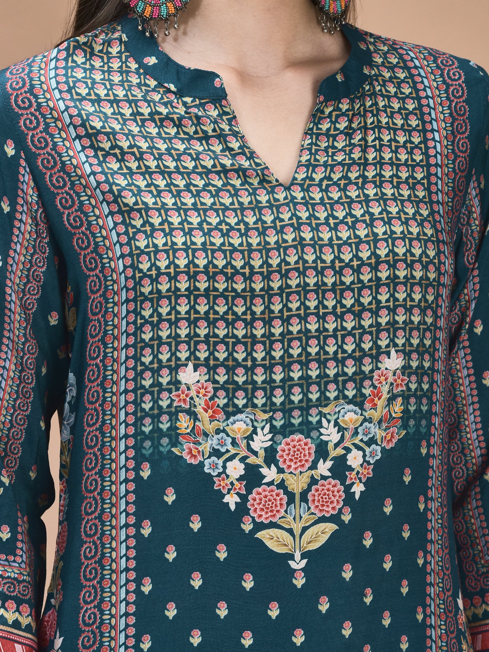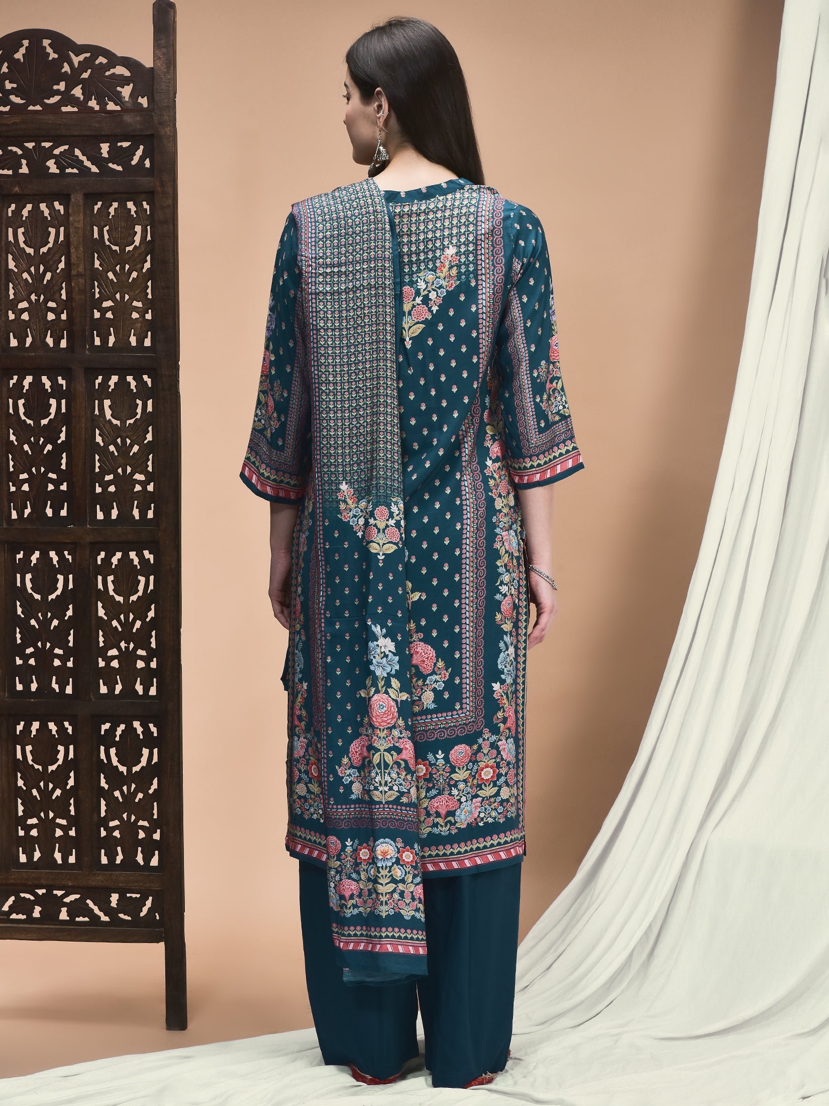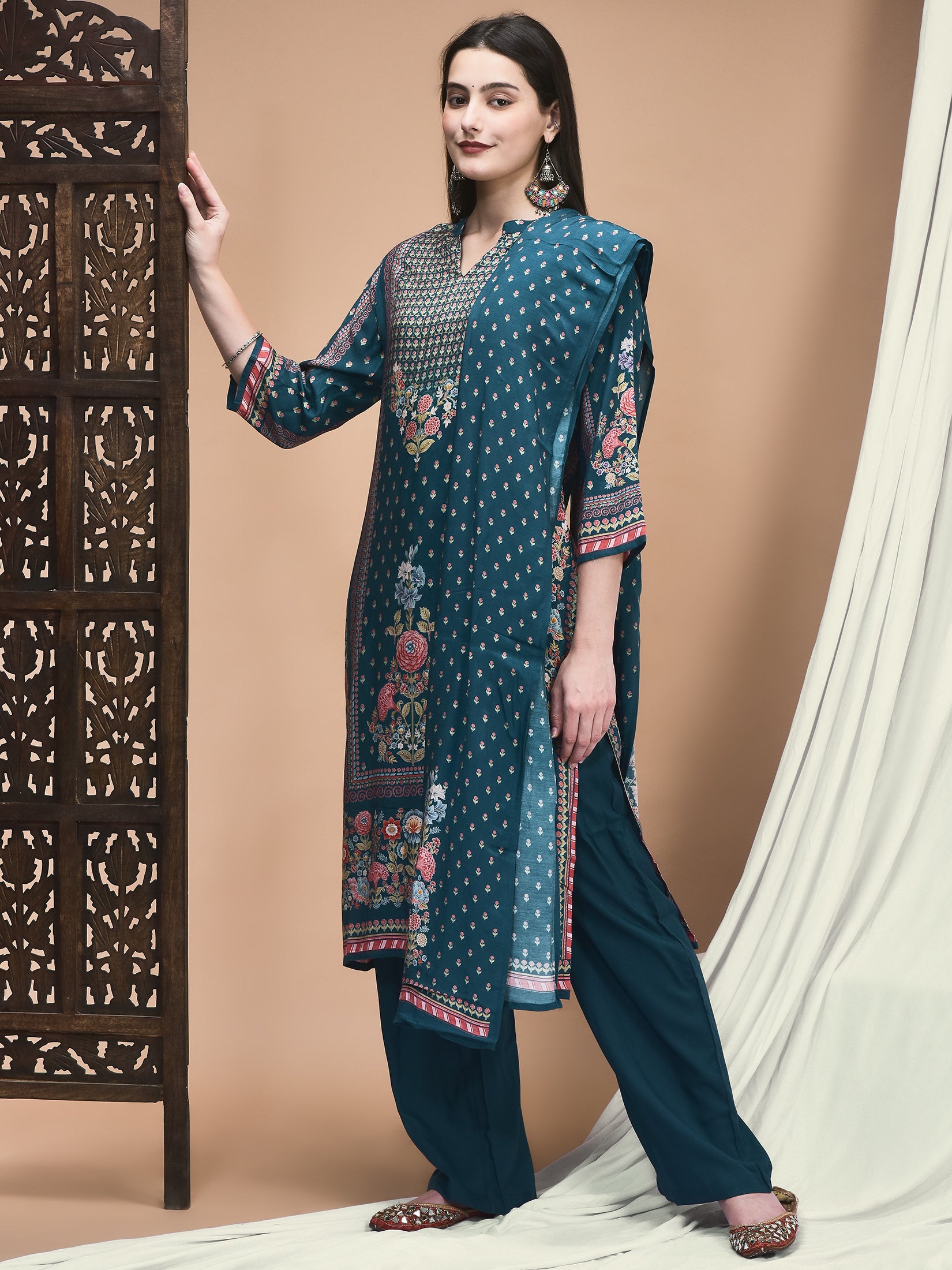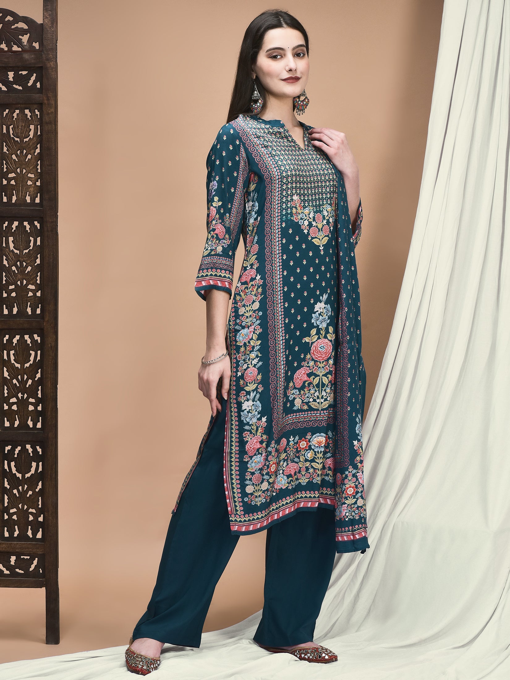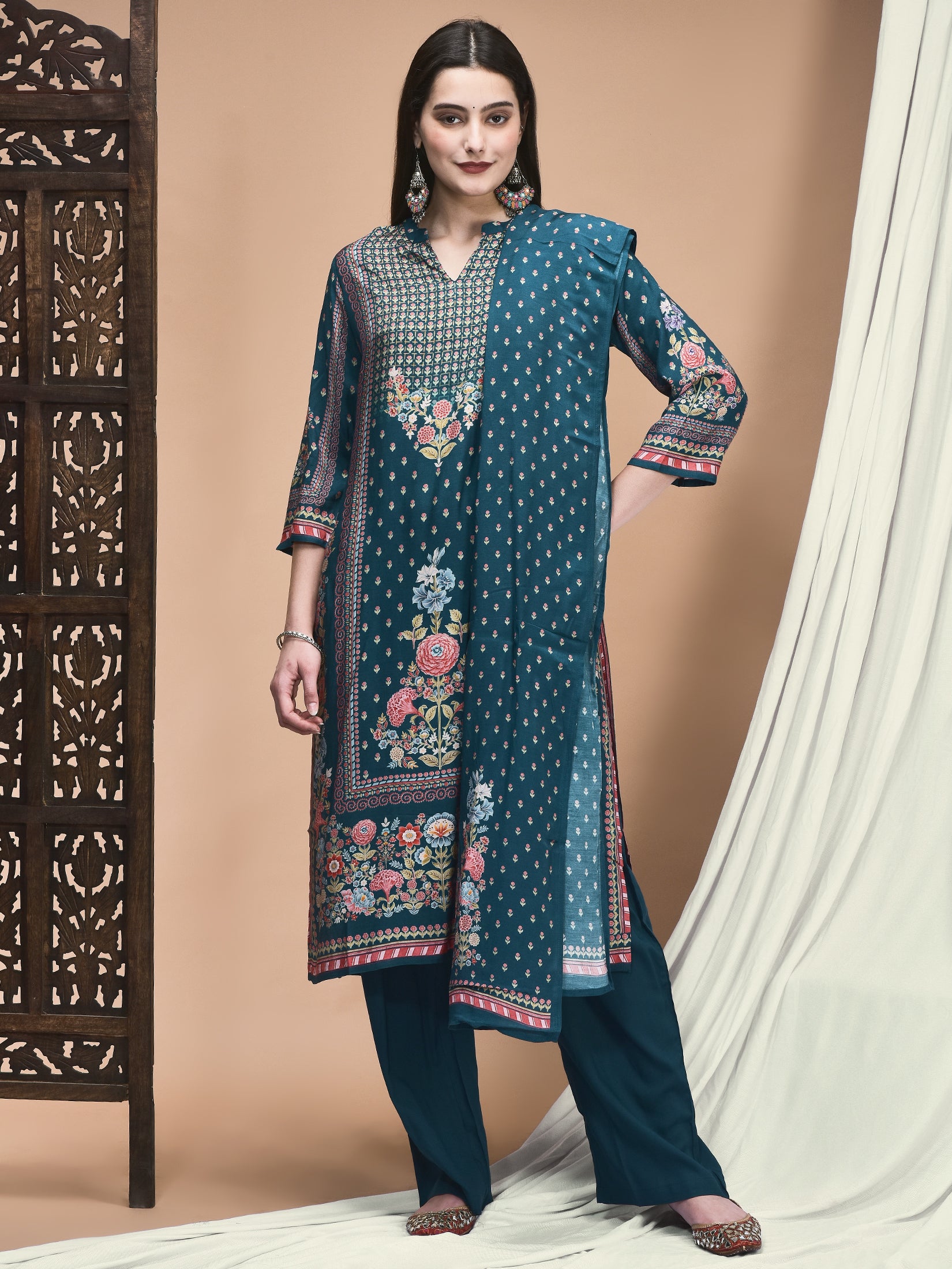 Women Muslin Blue Placement Print Kurta Comfort Pant Dupatta