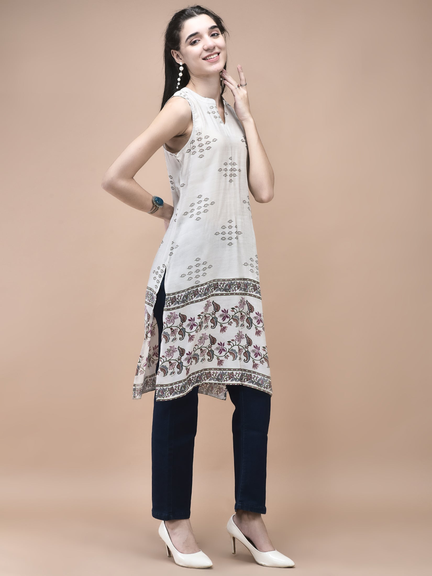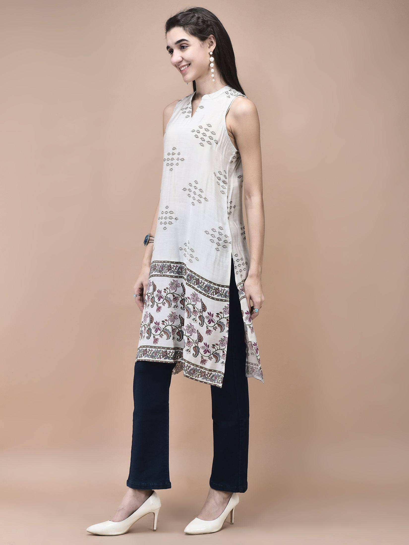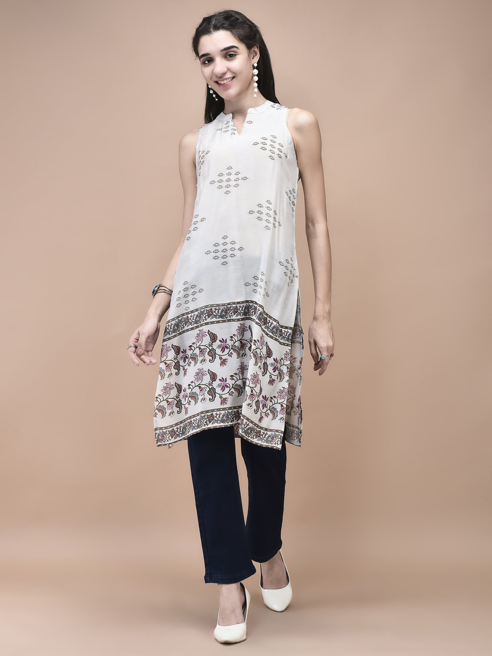 This is paired with jeans for a casual look or teamed up with your favorite bottom wear, this kurta is a versatile addition to your women's ethnic wear collection. Discover the ideal fusion of traditional women's kurta patterns and modern fashion with SHREE.