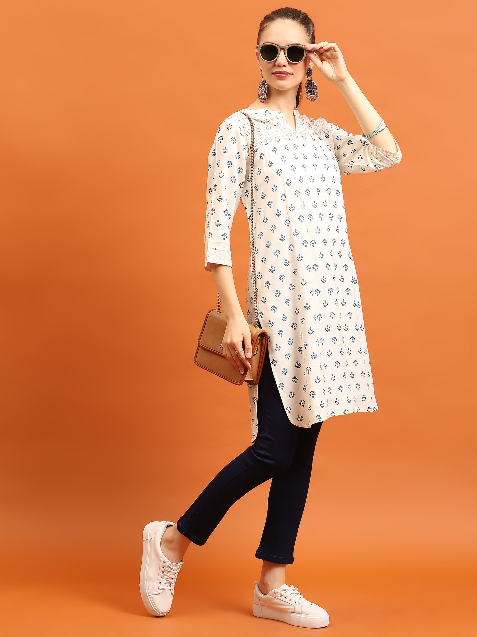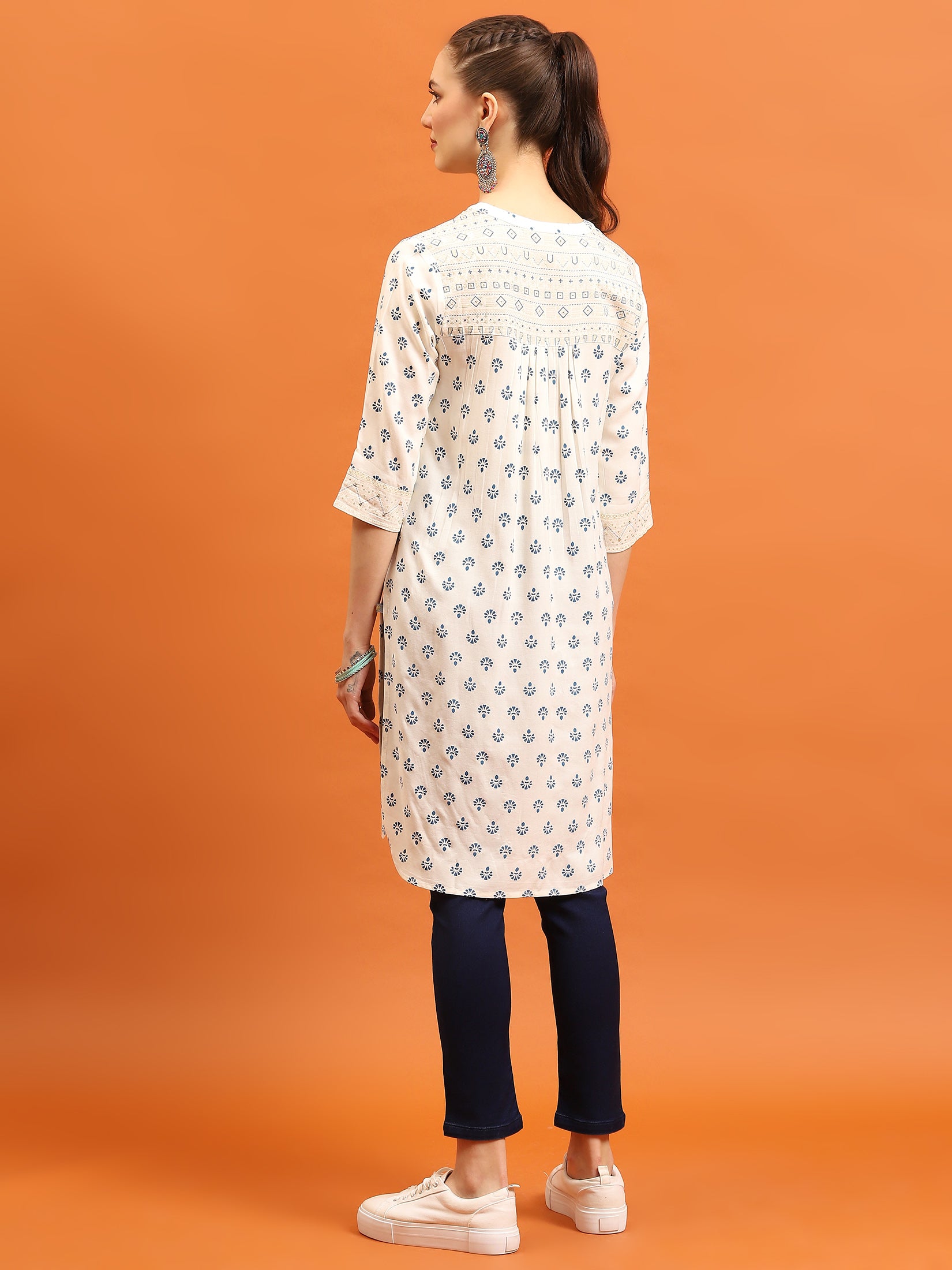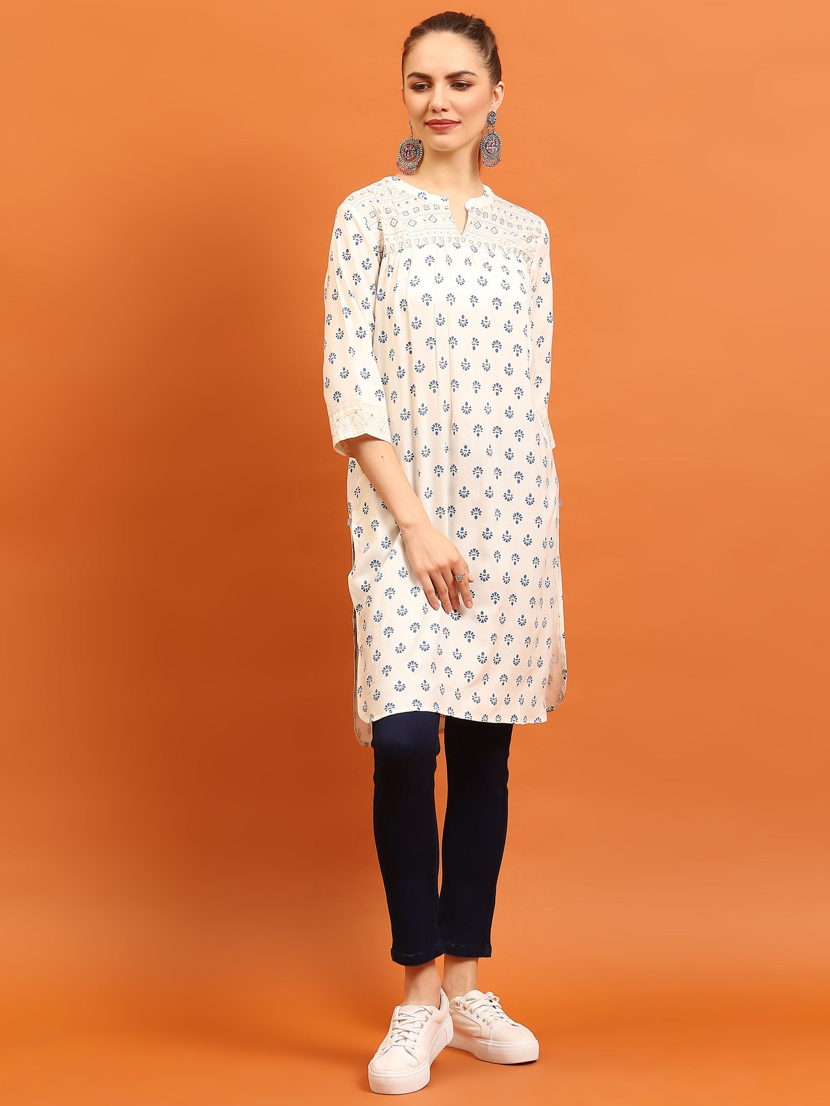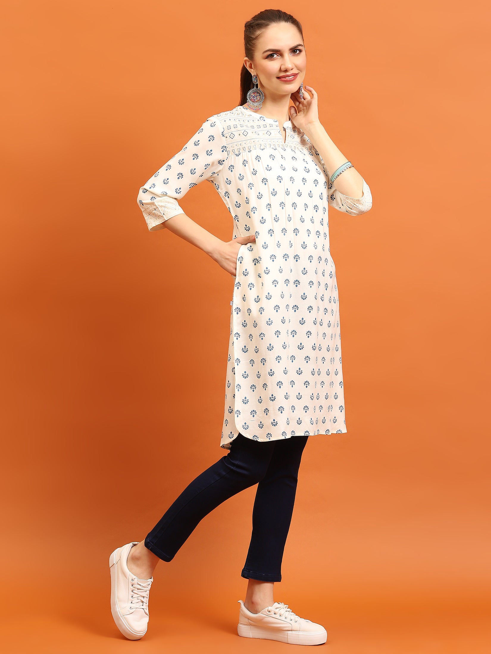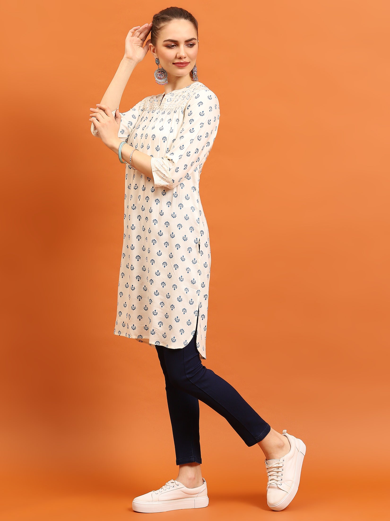 Crafted with utmost care, this off-white kurti features a flattering straight silhouette that drapes elegantly, enhancing your natural grace. The 3/4 sized sleeves offer a touch of modernity while providing comfort and ease of movement. The mandarin collar neckline adds a sophisticated touch, exuding a sense of refined style. It beautifully frames the face and lends a touch of regality to your overall look. Made from Liva fabric (rayon), this kurta set ensures a soft and luxurious feel against the skin. It offers breathability and a lightweight texture, making it perfect for all-day wear. The ornamental print on the off-white base adds a captivating allure to the ensemble. To enhance its functionality, this kurta set also includes a convenient pocket on the side. Versatile and stylish, this ethnic set can effortlessly transition from day to night. Shop away.