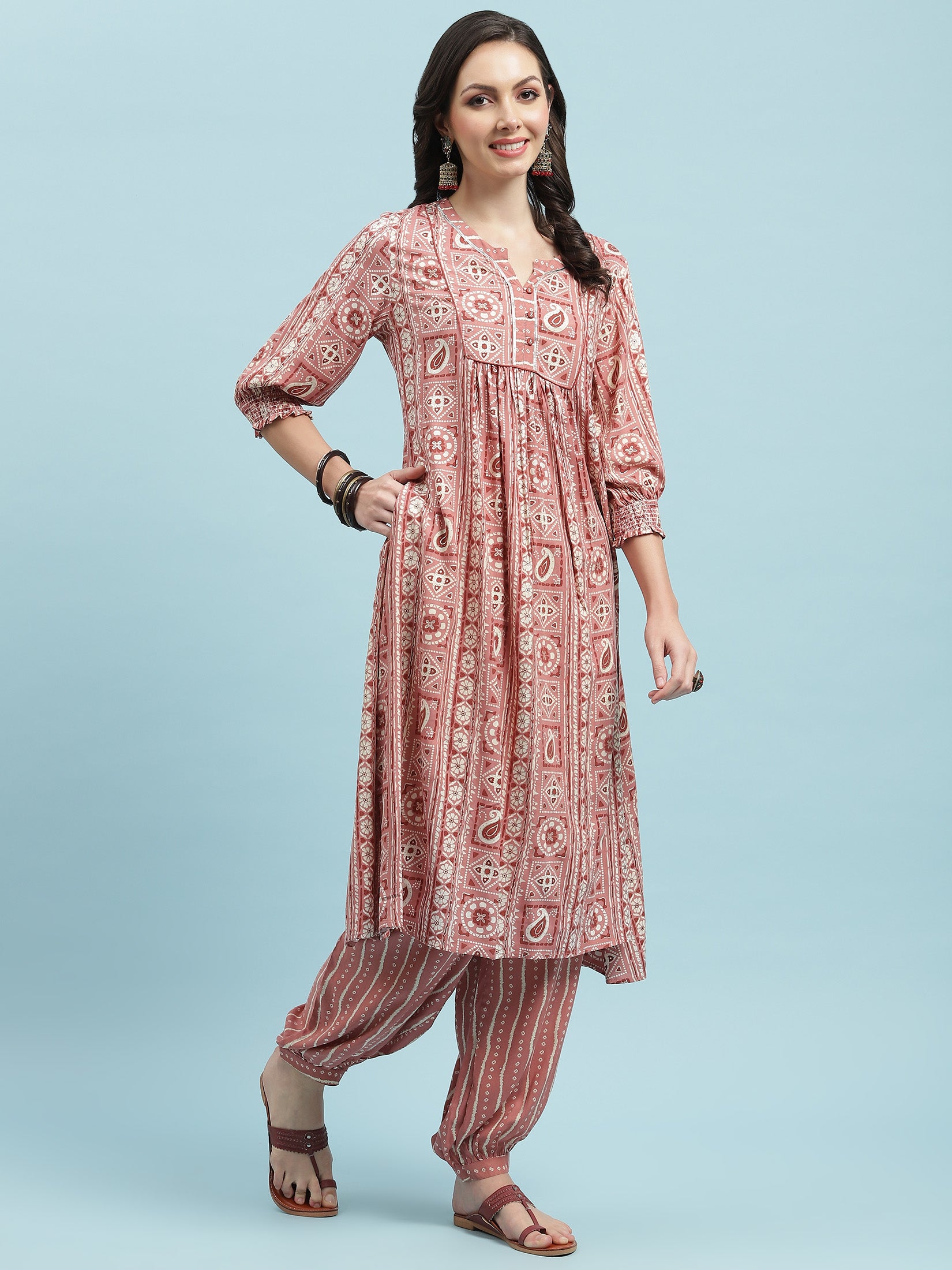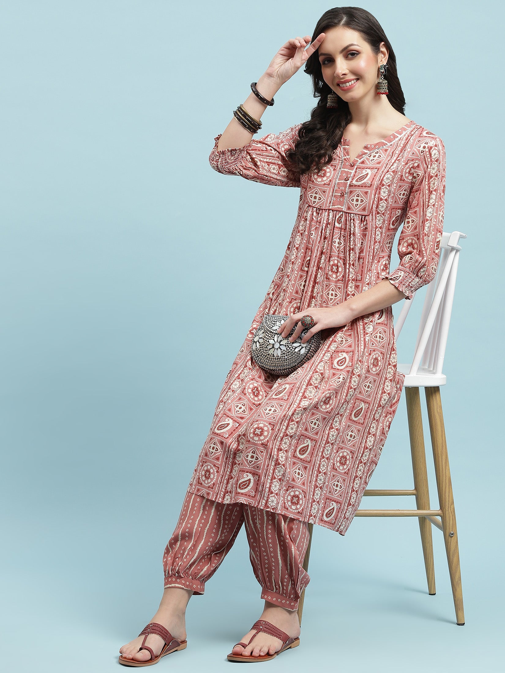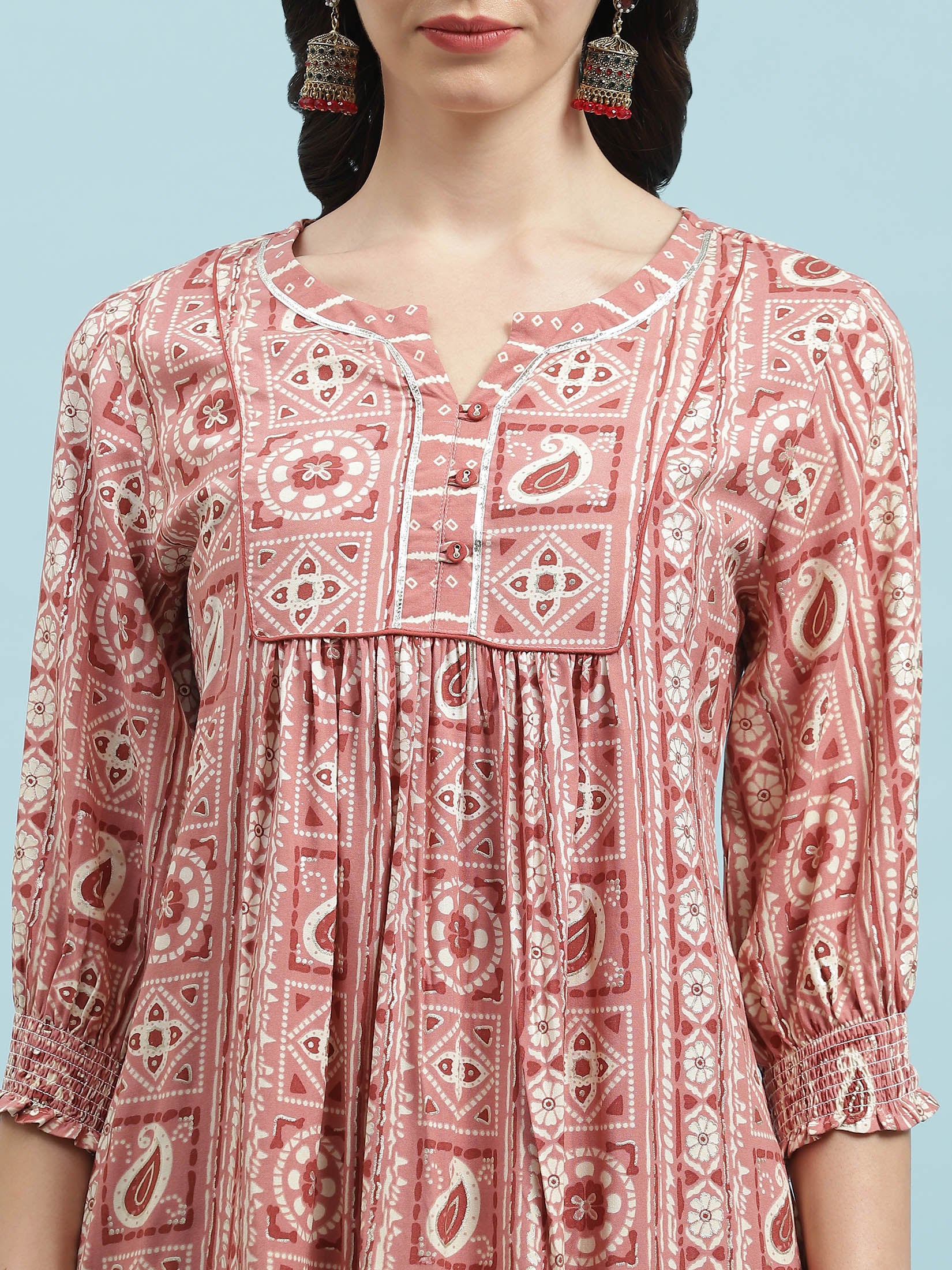 Women Liva Rayon Pink Geometric Print Kurta With Comfort Pant