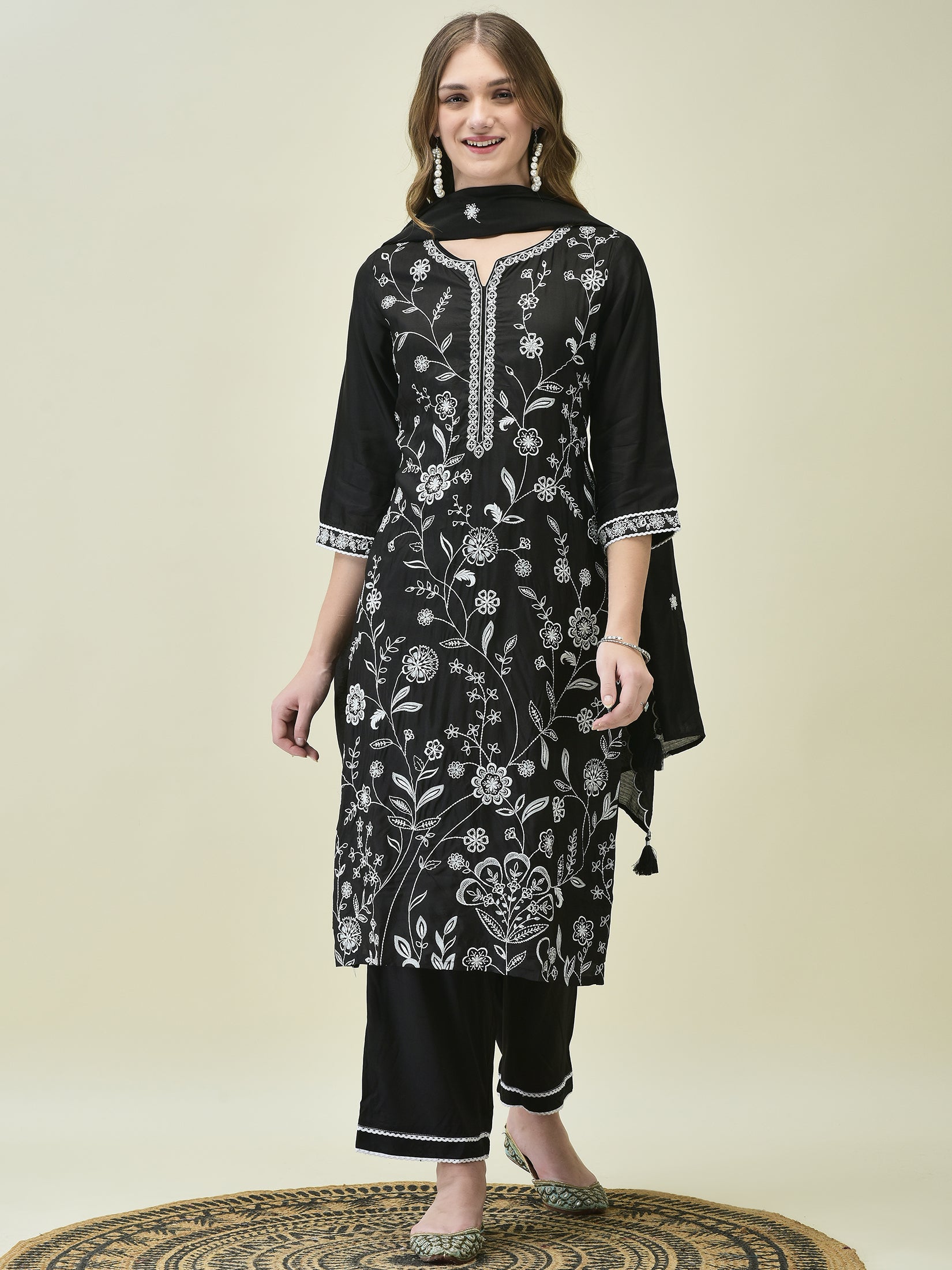 Women Poly Viscose Black Embroidered Kurta Comfort Pant Dupatta