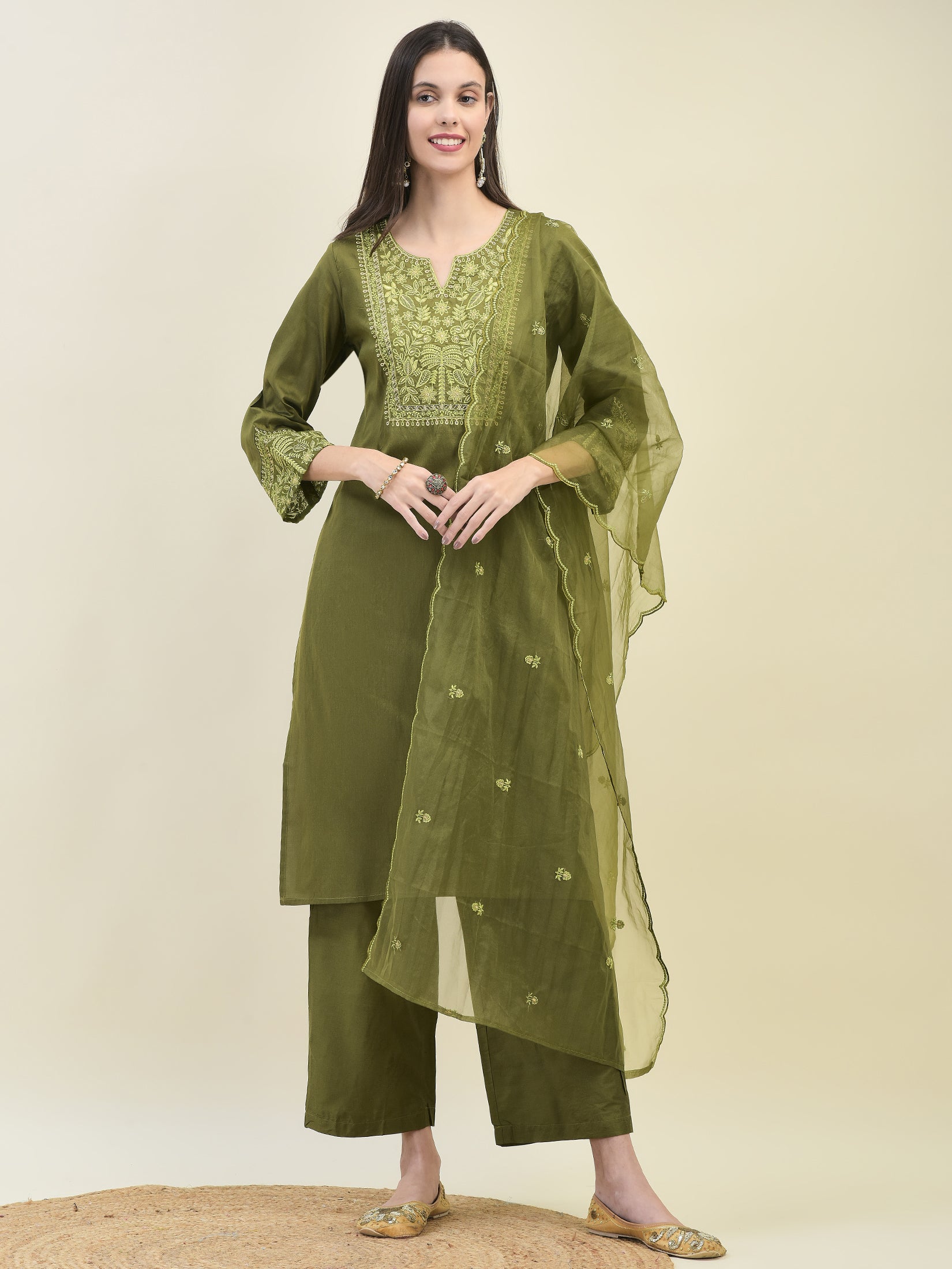 Women Poly Viscose Green Embroidered Kurta Comfort Pant Dupatta
