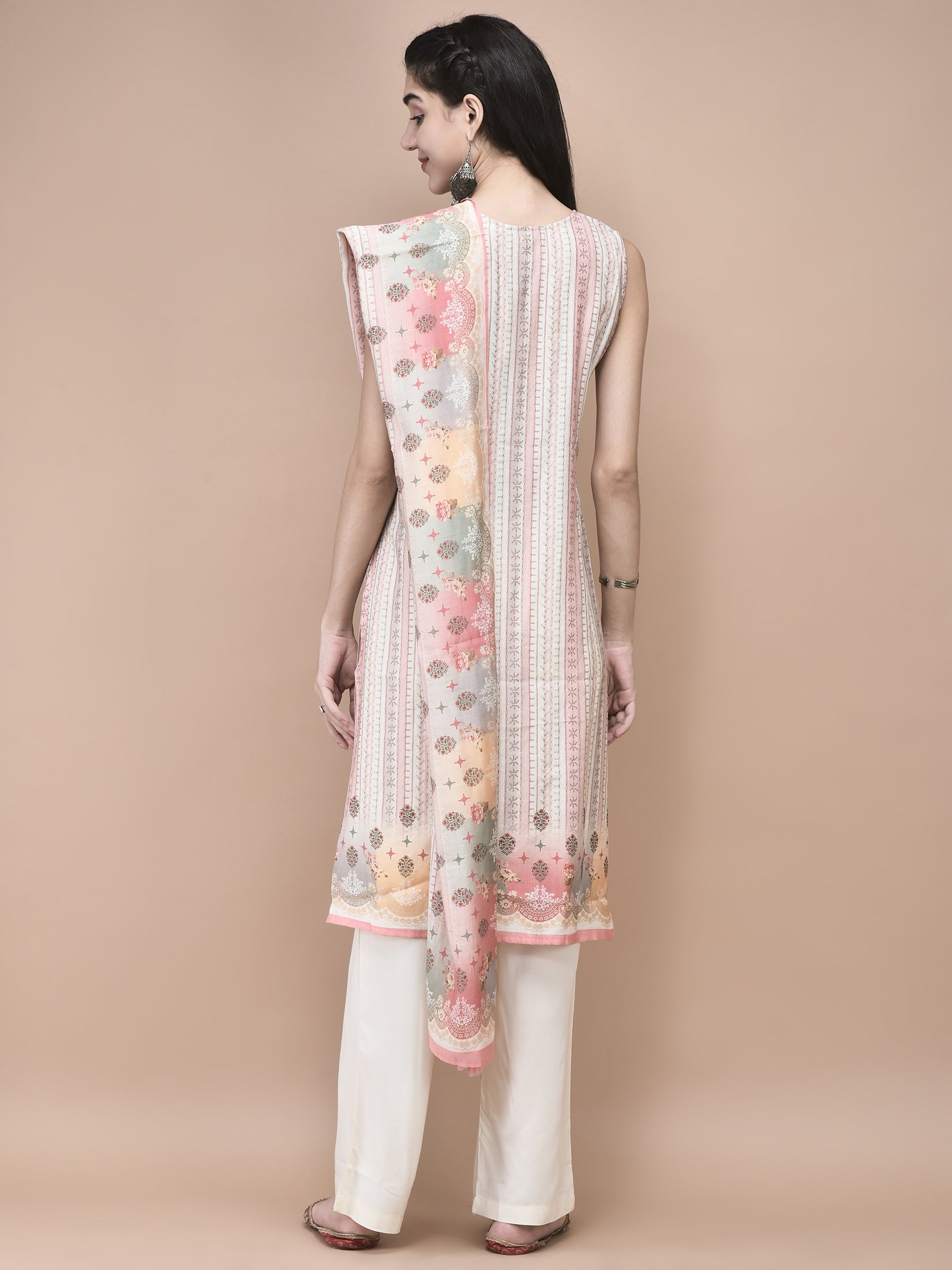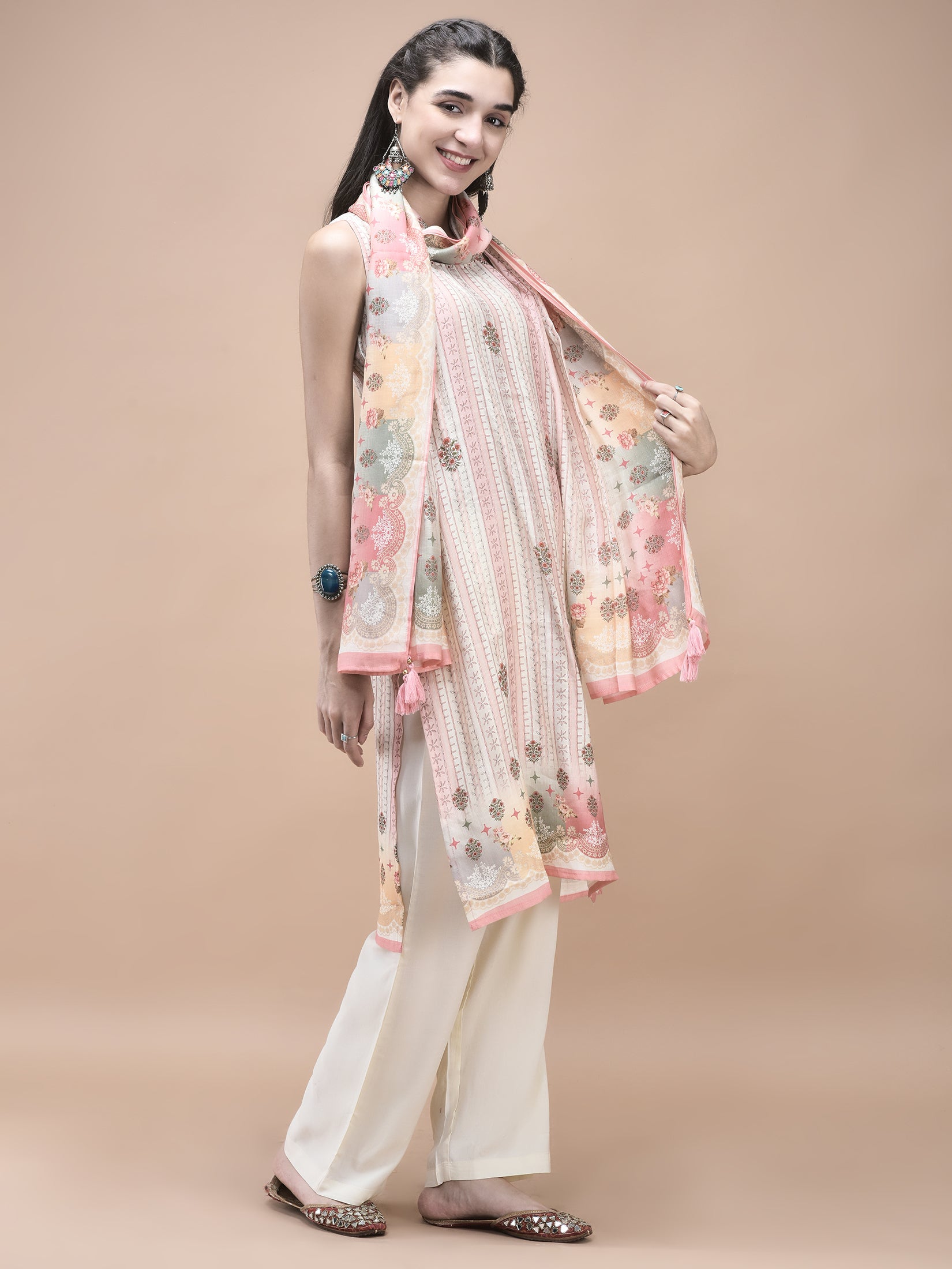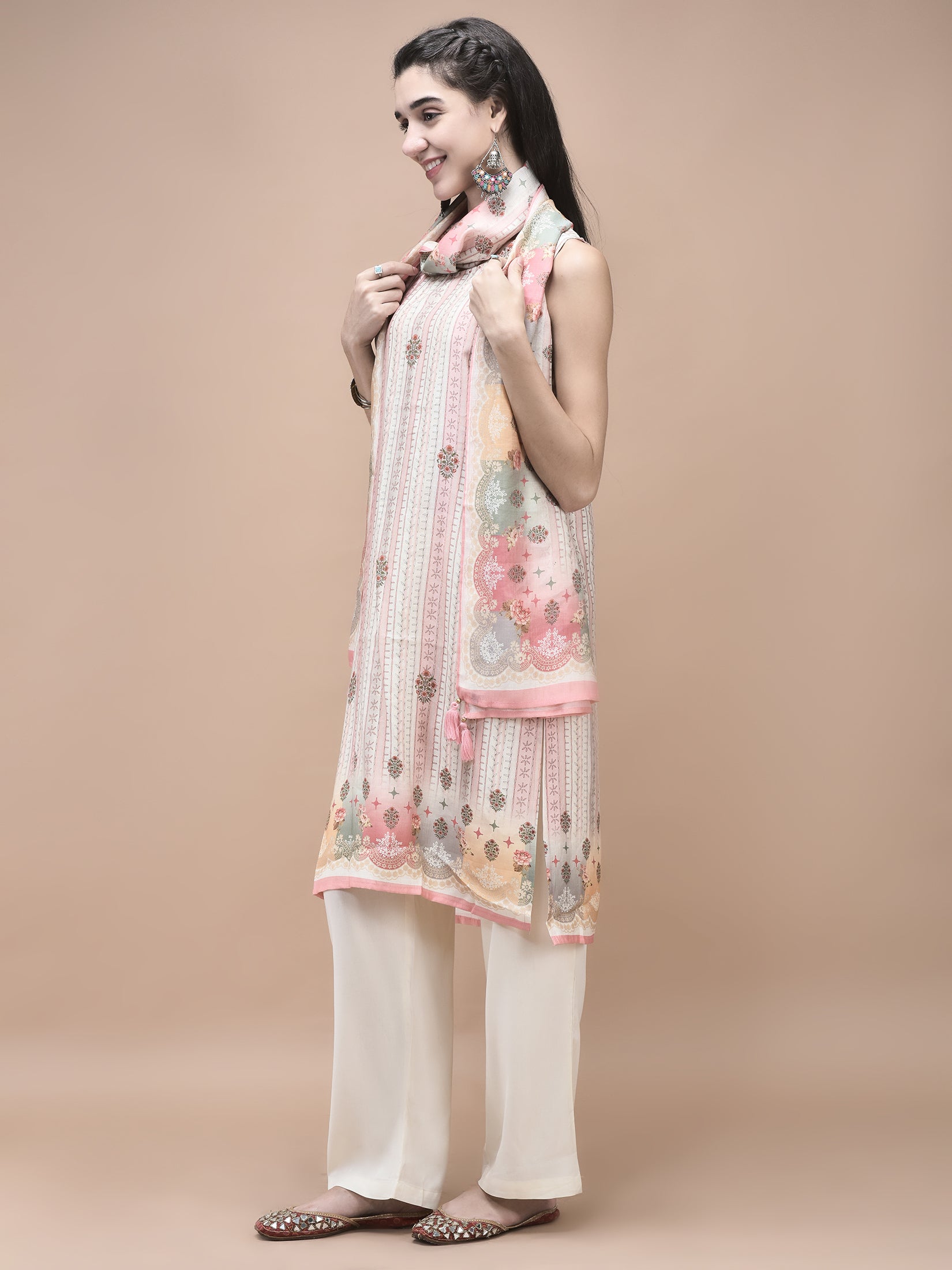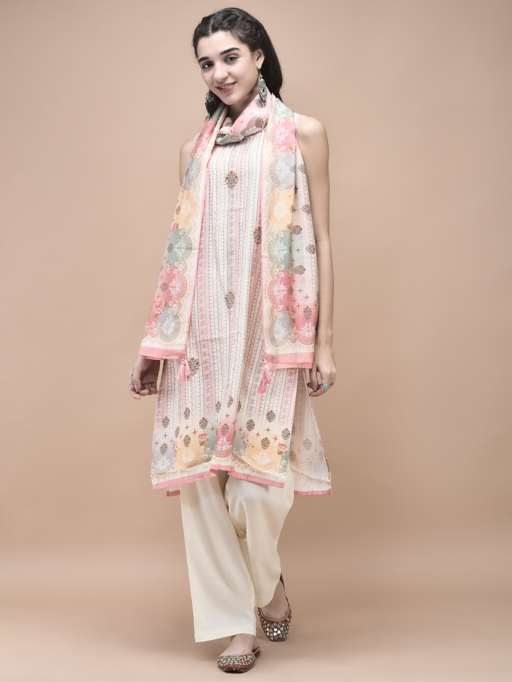 Women Silk Blend Multicolor Mughal Print Kurta Comfort Pant Dupatta
