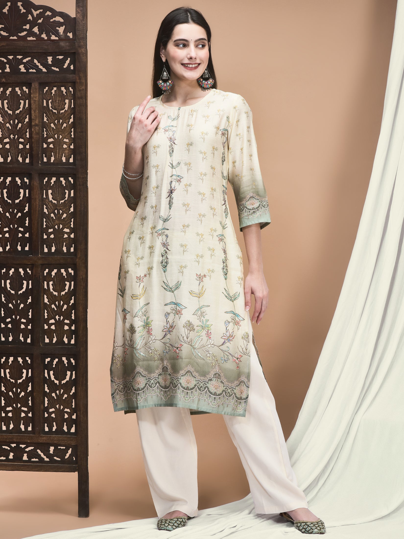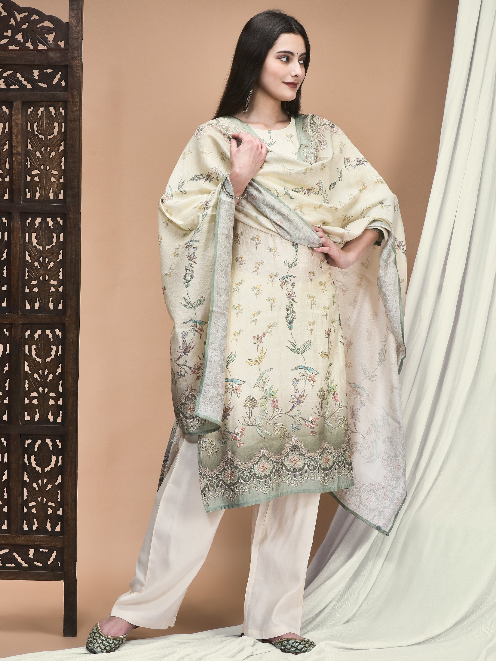 Women Silk Blend Off White Floral Print Kurta Comfort Pant Dupatta