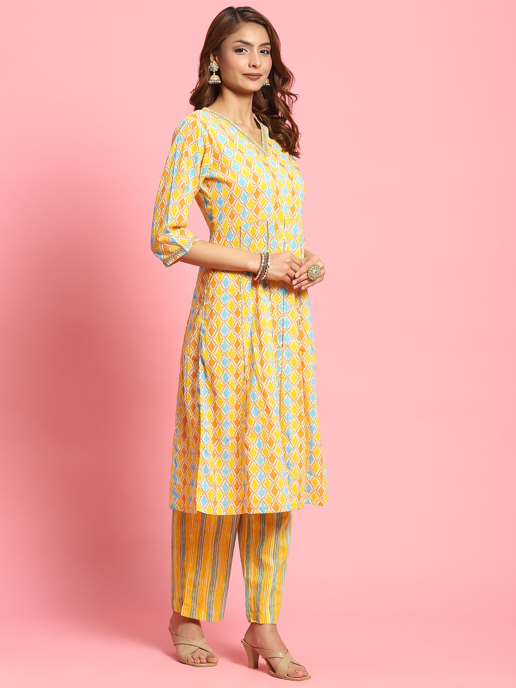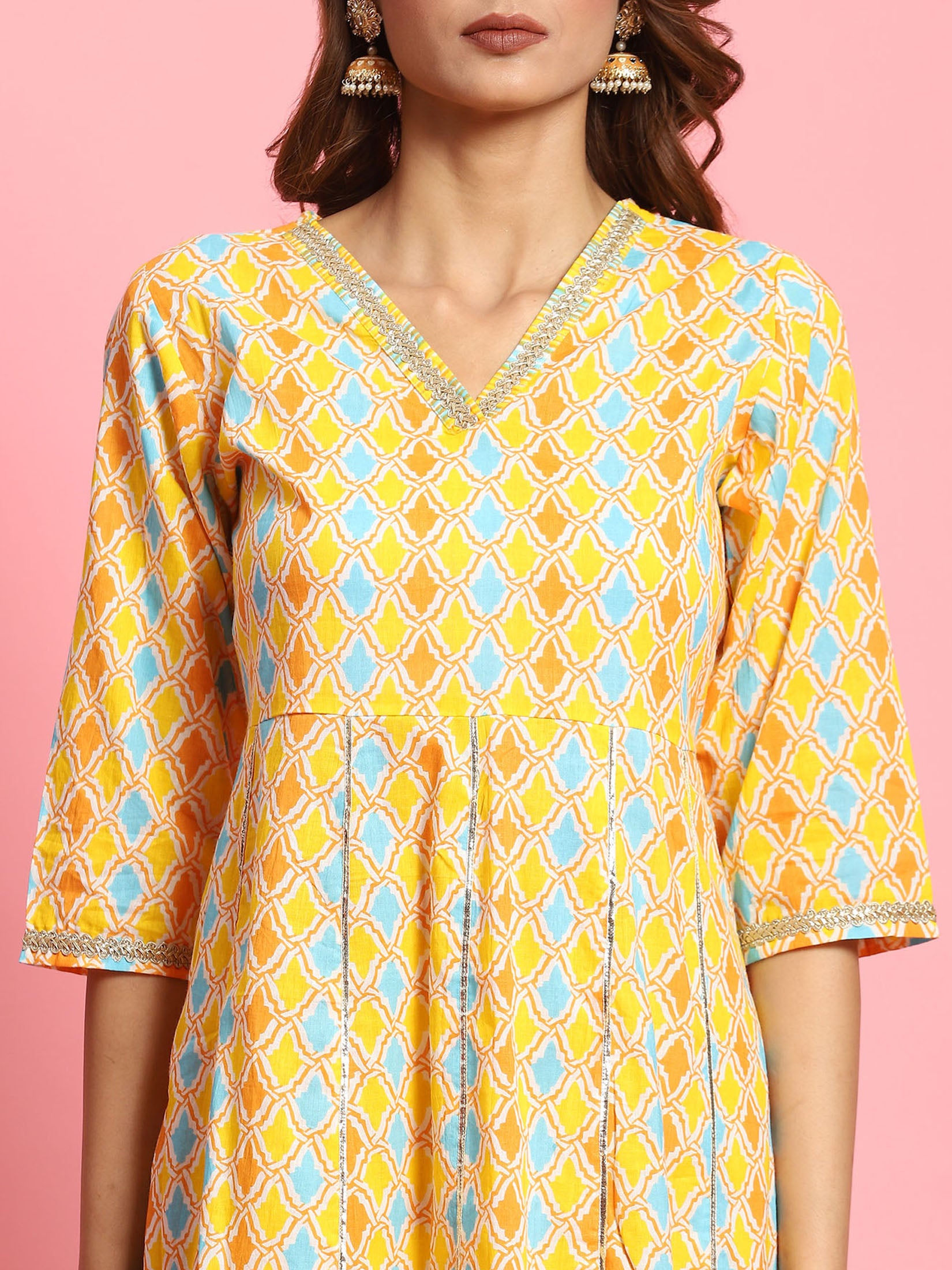Introducing our Yellow Geometric Printed Kurta Comfort Pant Dupatta set, a versatile addition to your wardrobe. This elegant ensemble seamlessly transitions between everyday wear and workwear, offering both style and comfort. The kurta features three-quarter sleeves and a classic V-neck, providing a timeless charm. Its fit and flared silhouette flatters all body types, making you feel confident throughout the day. Crafted from high-quality cotton, this complete ethnic set is breathable and perfect for all seasons. The striking geometric print adds a modern twist to traditional attire, ensuring you stand out in any setting. Elevate your fashion game with this vibrant and comfortable outfit that effortlessly blends tradition with contemporary design.
